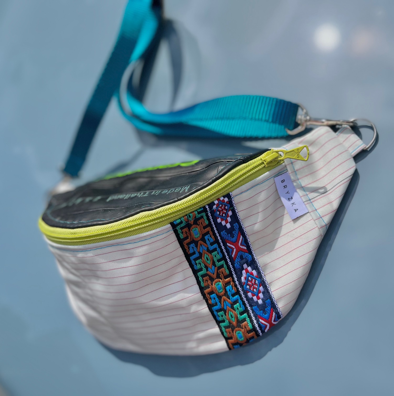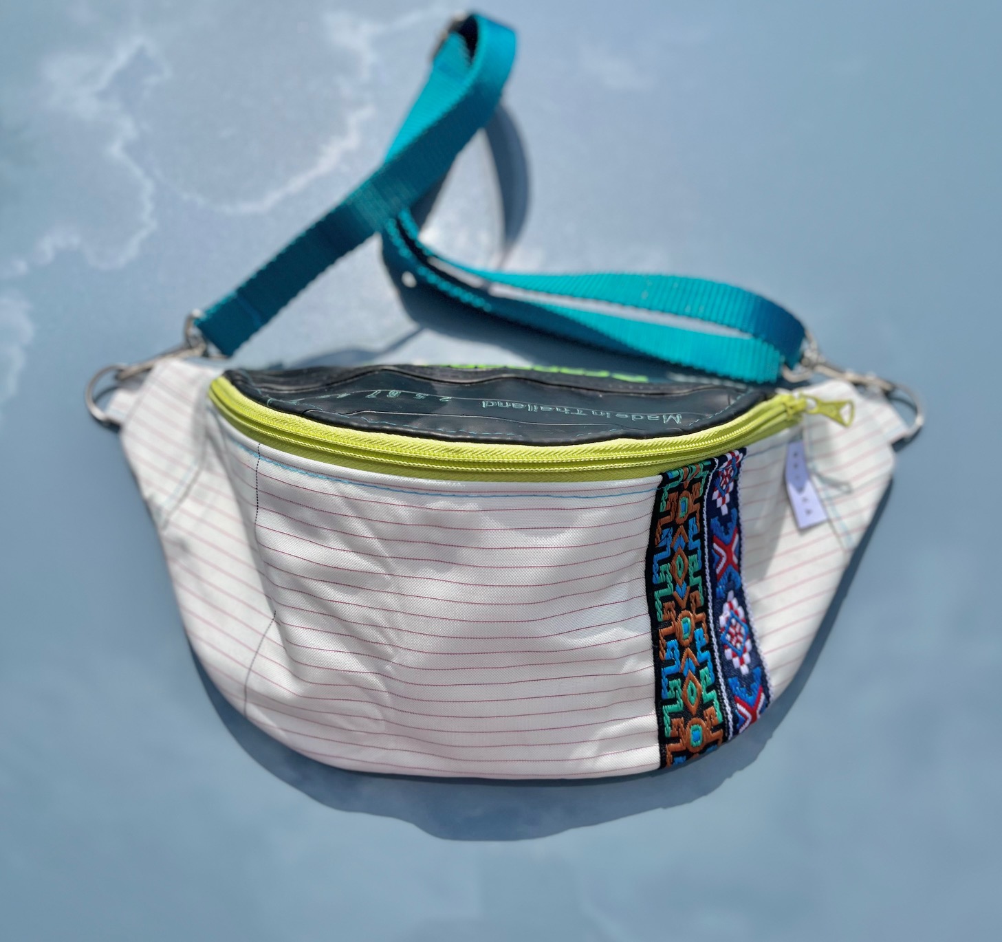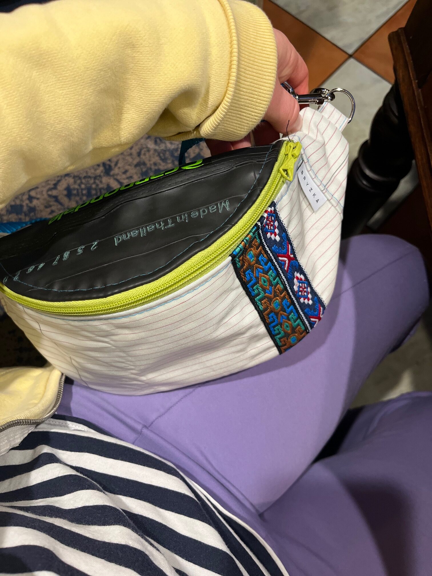 The waist bag is made of air cushion material. Ethnic stripes/ribbons on the front. Unconventional combinations. A hit this summer. Waterproof waist bag. Upcycled.