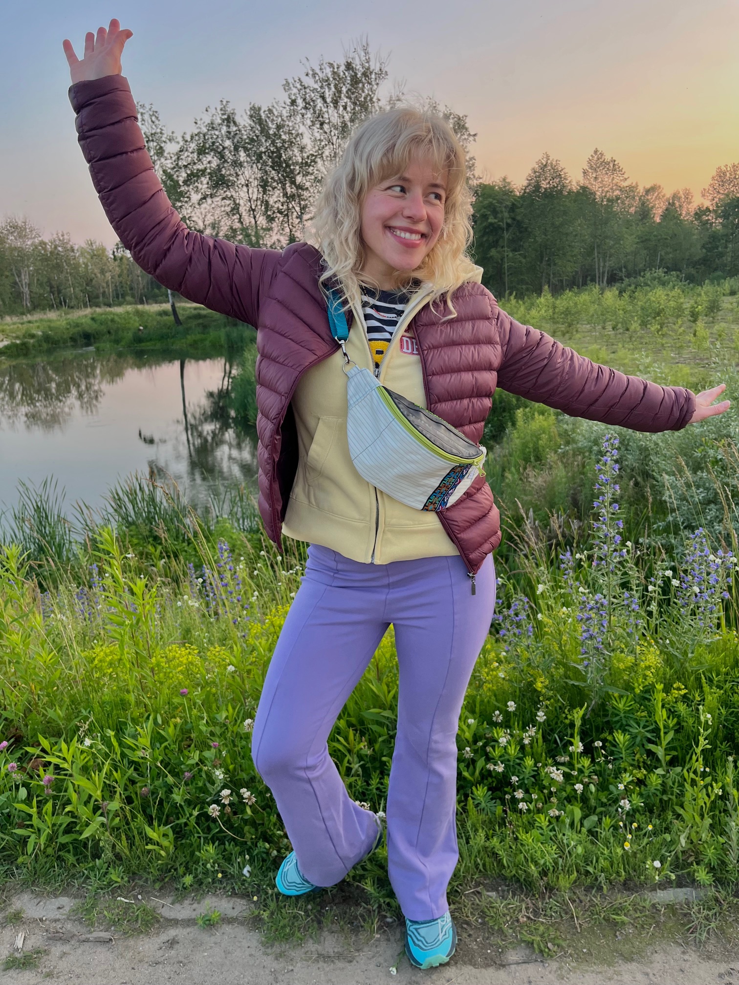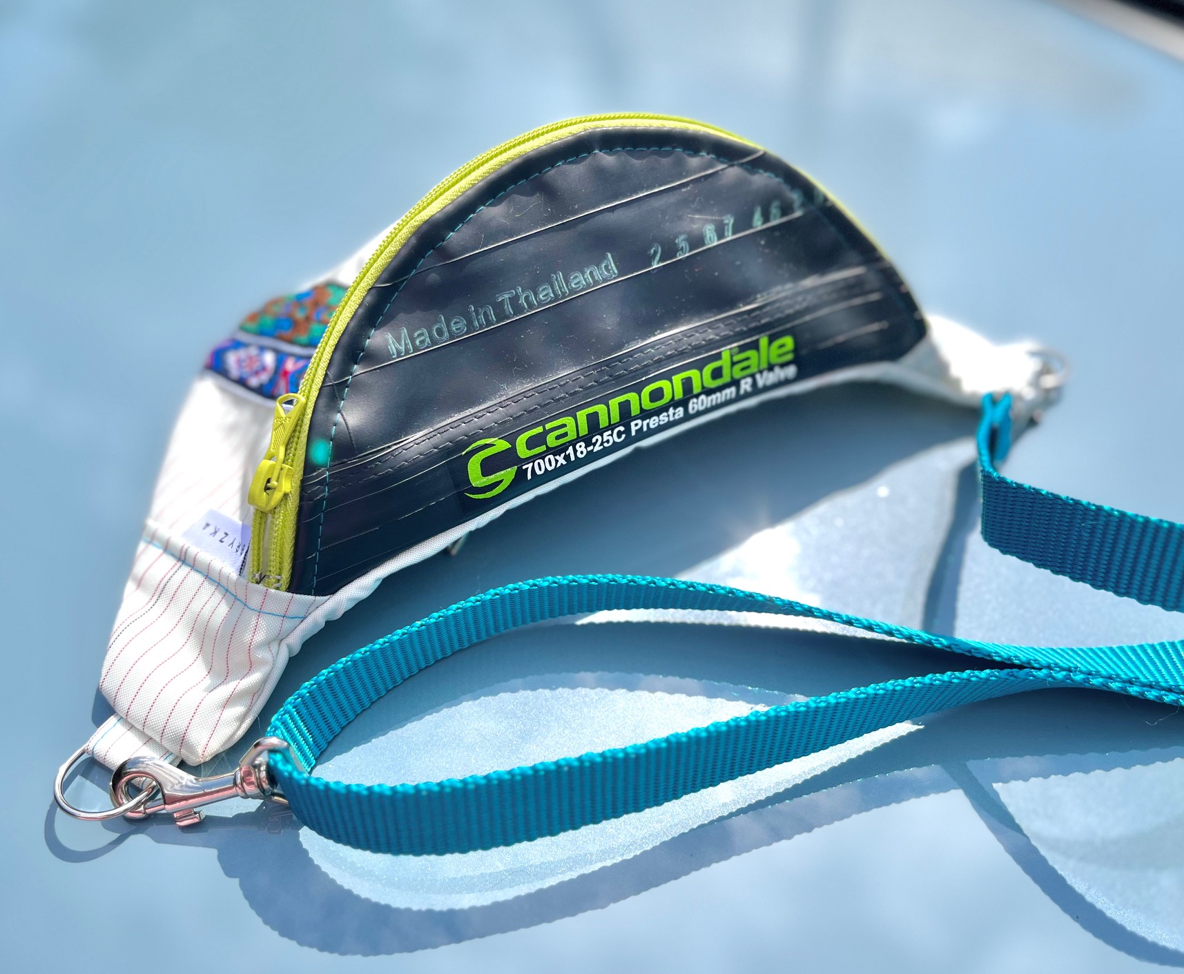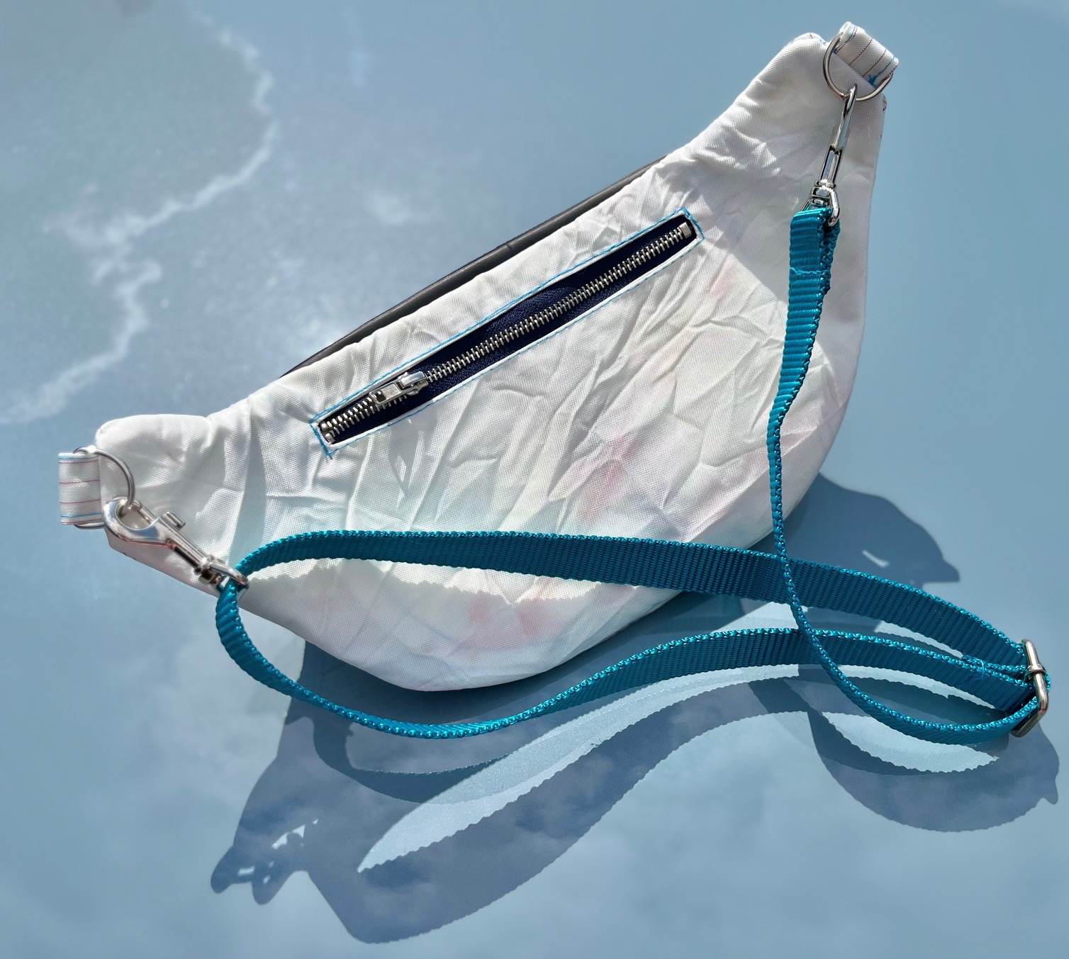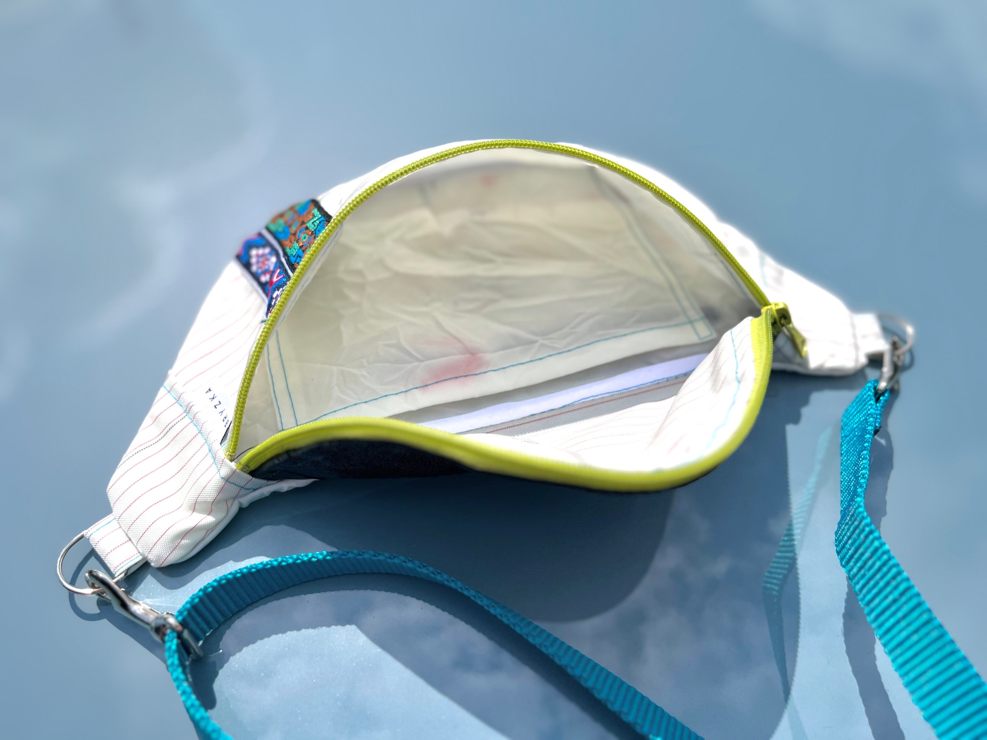 The waist bag is made of air cushion material. Ethnic stripes/ribbons on the front. Unconventional combinations. A hit this summer. Waterproof waist bag. Upcycled.