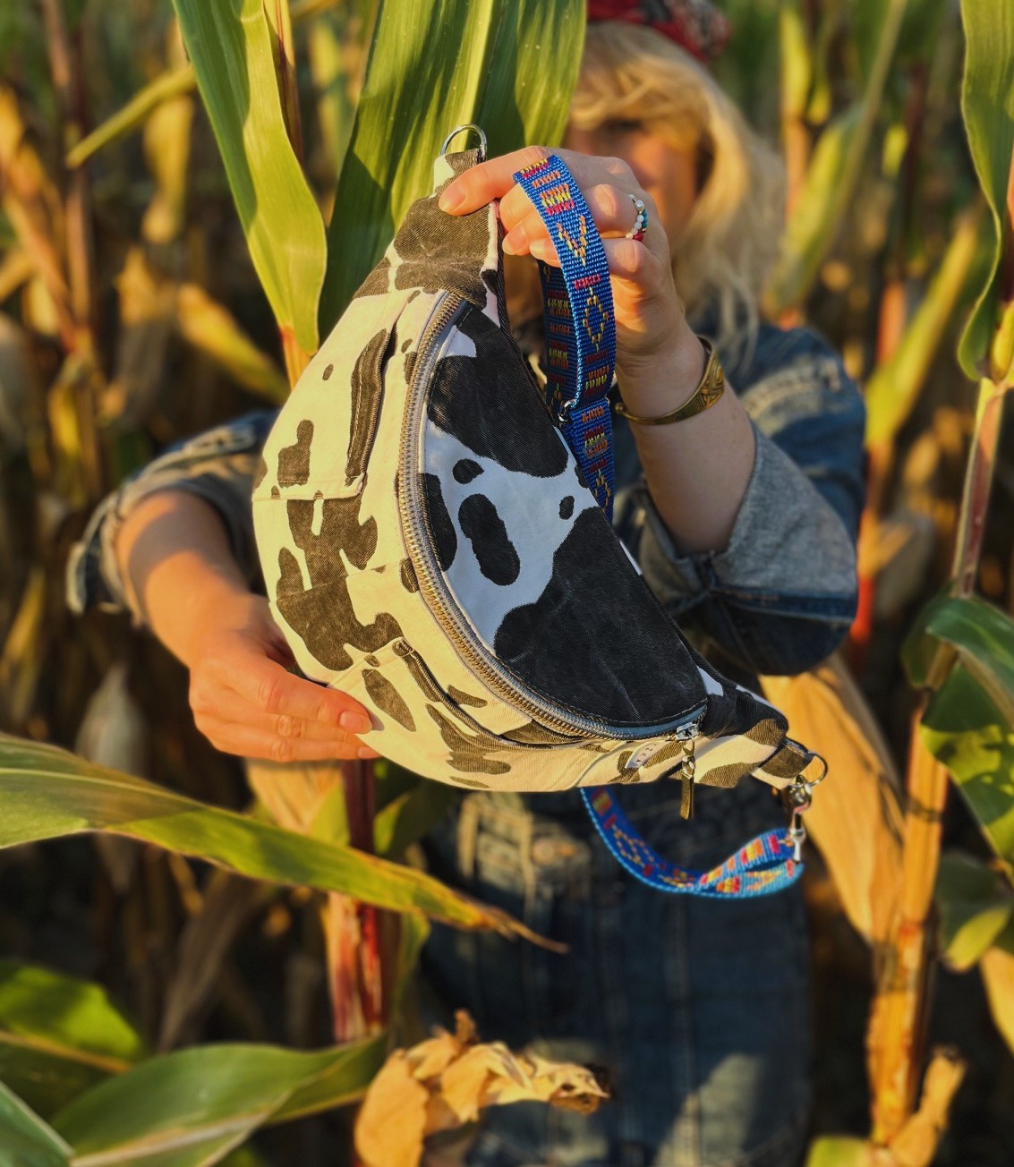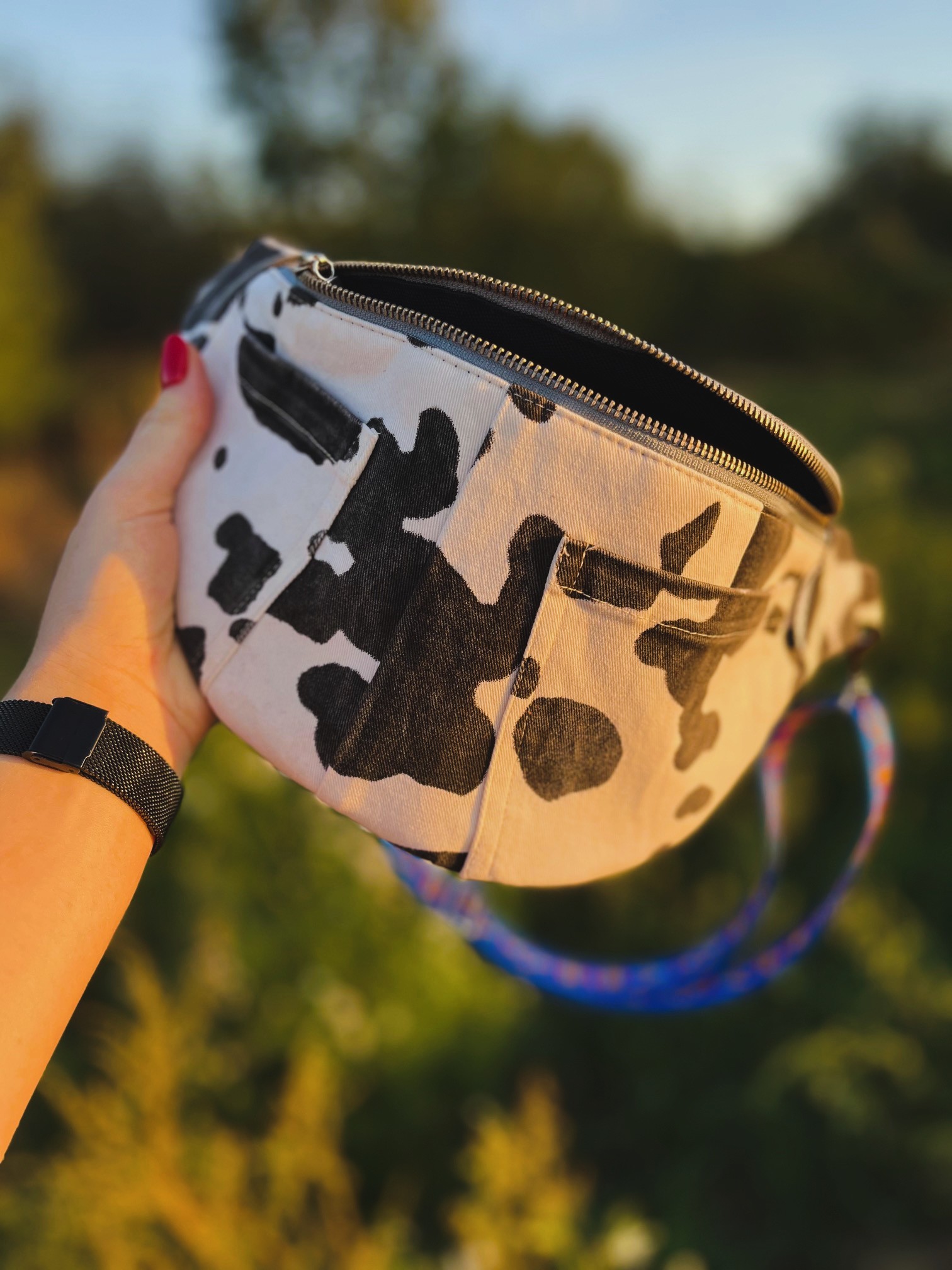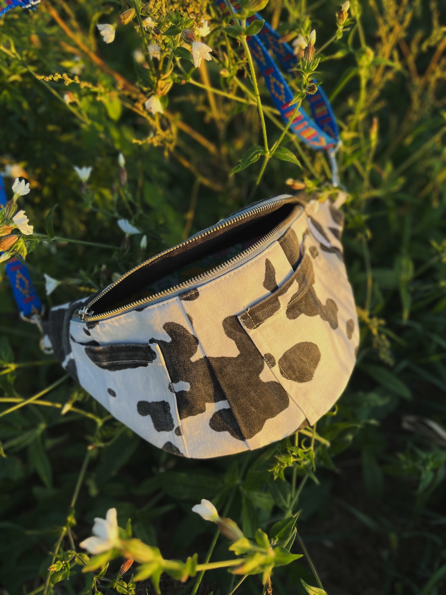 Ta nerka handmade została uszyta z recyklingowych materiałów – dokładniej ze spodni. Ma unikalny charakter dzięki wykorzystaniu czarno-białego wzoru przypominającego krowie łatki, który nadaje jej oryginalny, streetwearowy klimat.