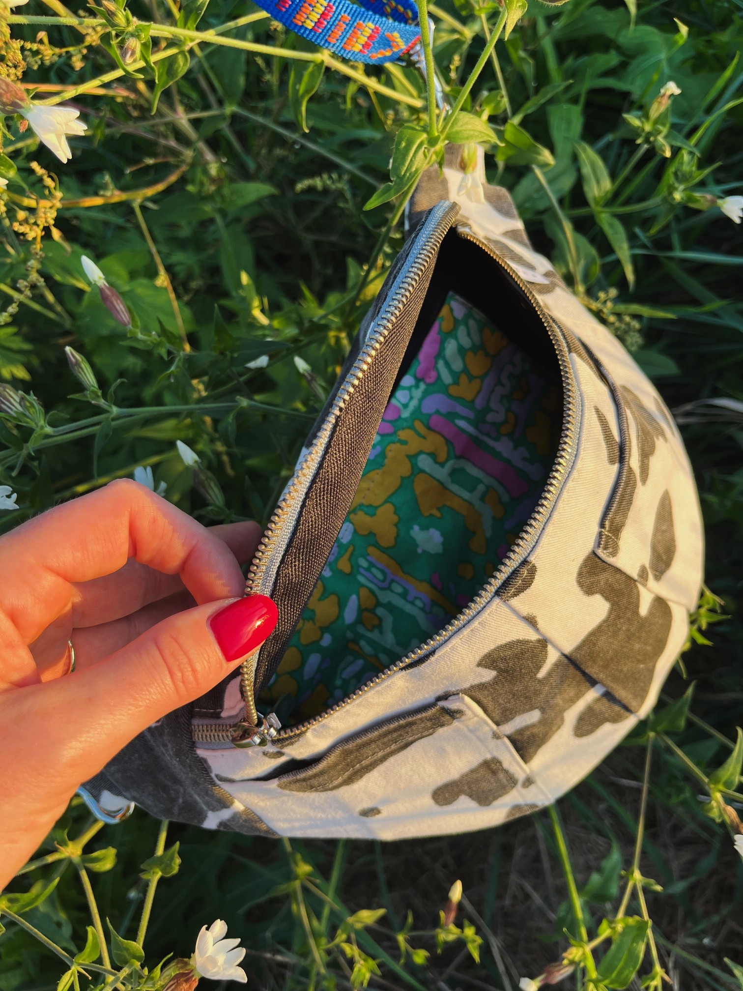 Konstrukcja jest pojemna i praktyczna – posiada główną komorę zapinaną na solidny metalowy zamek błyskawiczny oraz dodatkową kieszonkę z przodu, która świetnie sprawdzi się na drobiazgi. Pasek został wykonany z kolorowej taśmy o folkowym, etnicznym wzorze w odcieniach niebieskiego, czerwieni i pomarańczy, co tworzy ciekawy kontrast z czarno-białą bazą nerki.