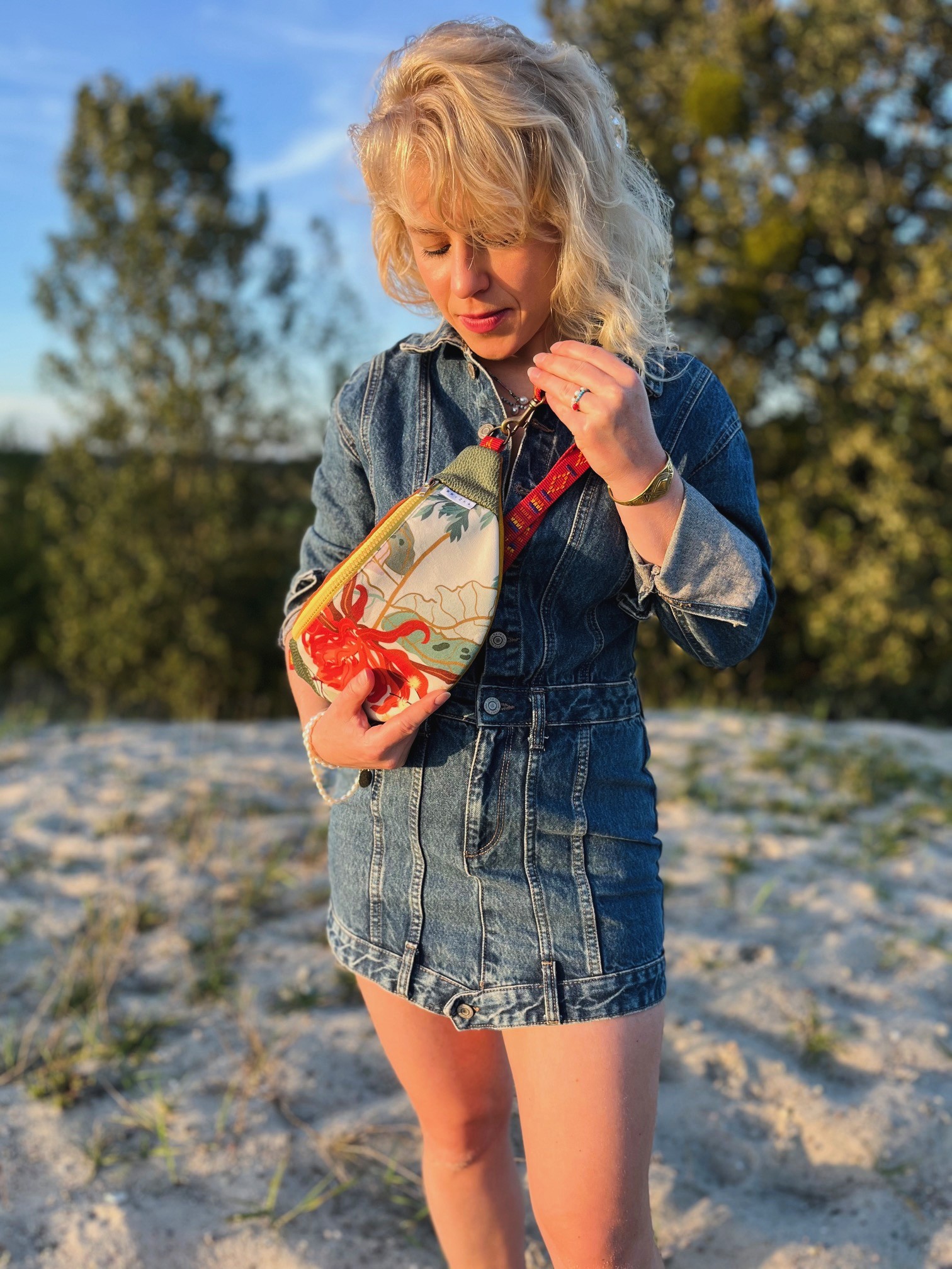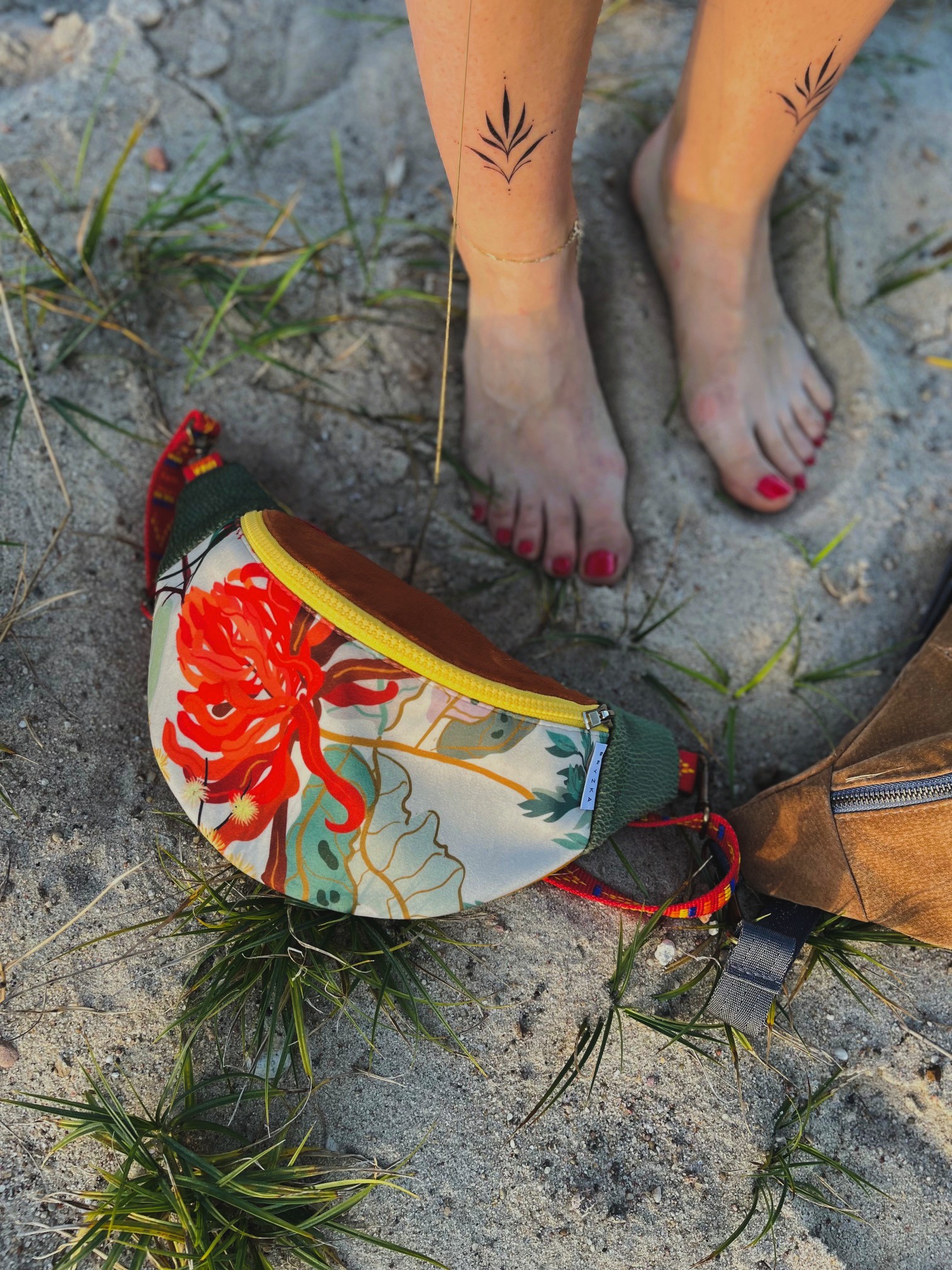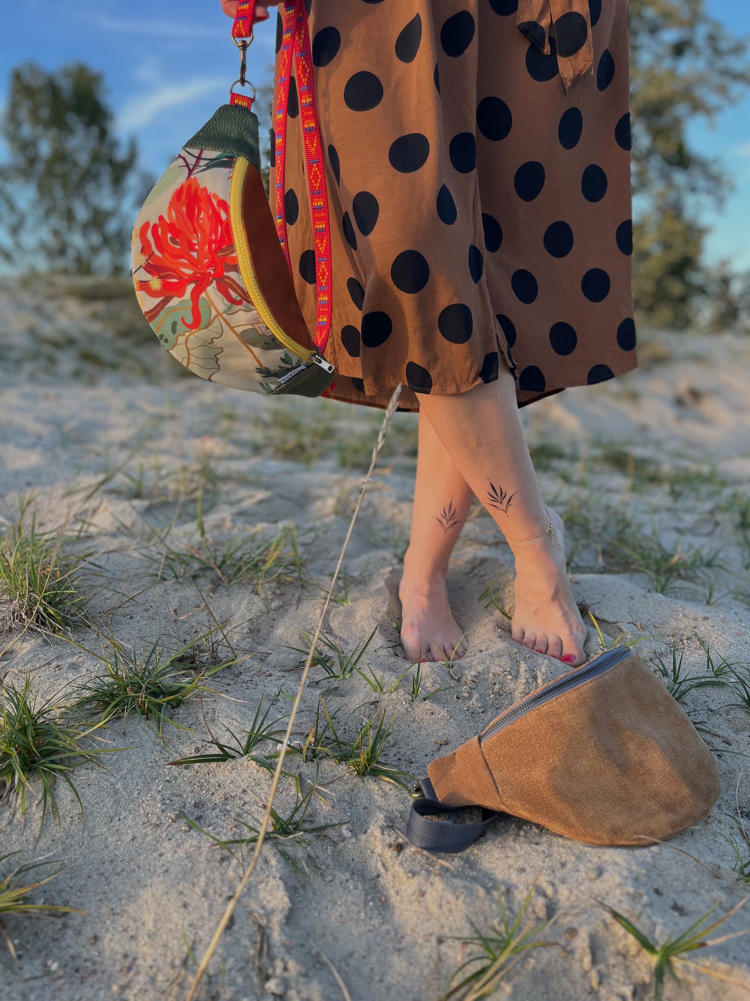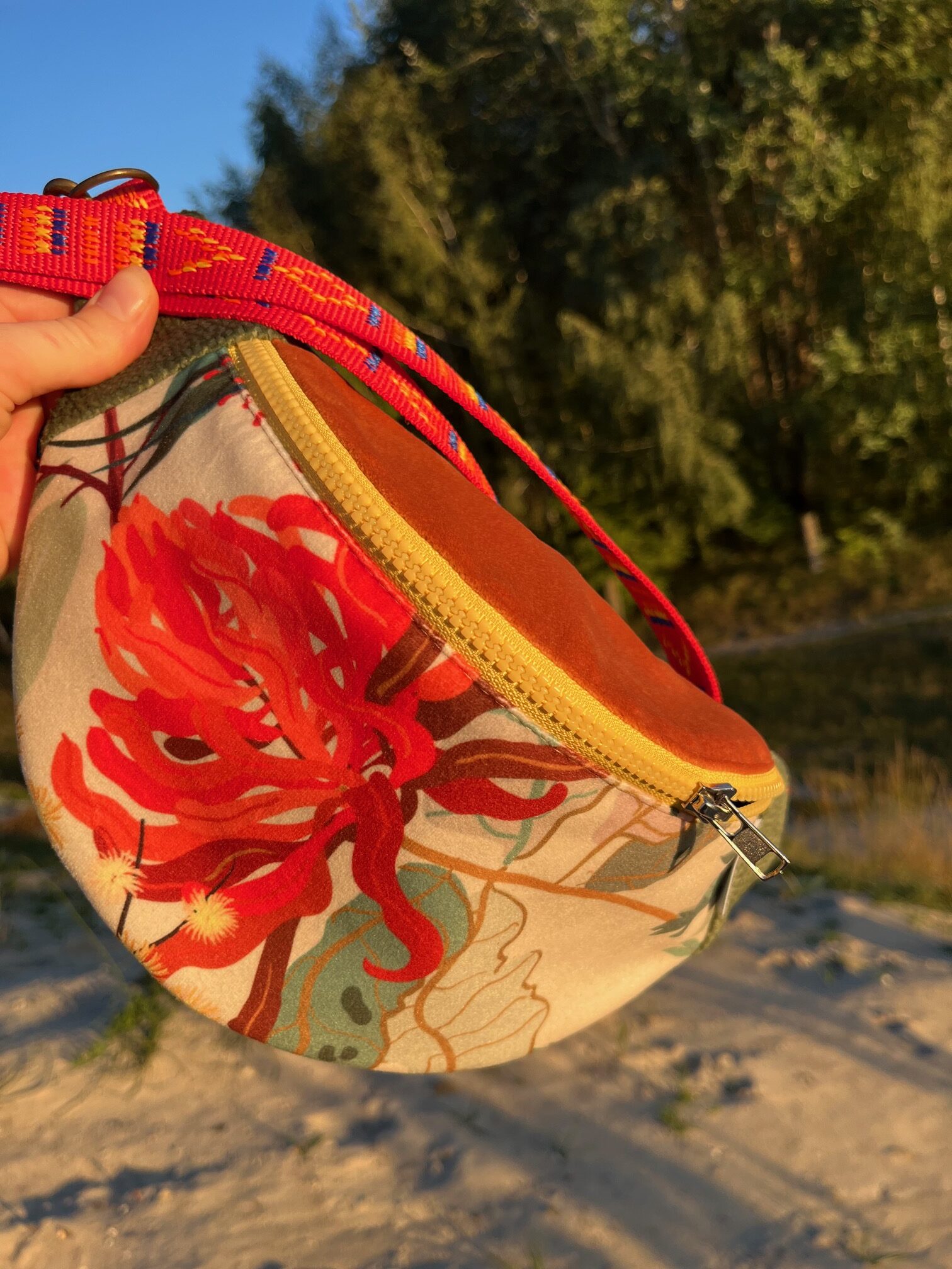 Ta nerka handmade to małe dzieło sztuki użytkowej – energetyczna, barwna i niepowtarzalna. Uszyta z materiału o kwiatowym wzorze z intensywnie czerwonym motywem, przełamanym zielenią liści i delikatnymi akcentami beżu oraz pomarańczu. Całość zamykana jest żółtym suwakiem, który dodaje nerce świeżości i jeszcze bardziej podkreśla jej radosny, letni charakter.