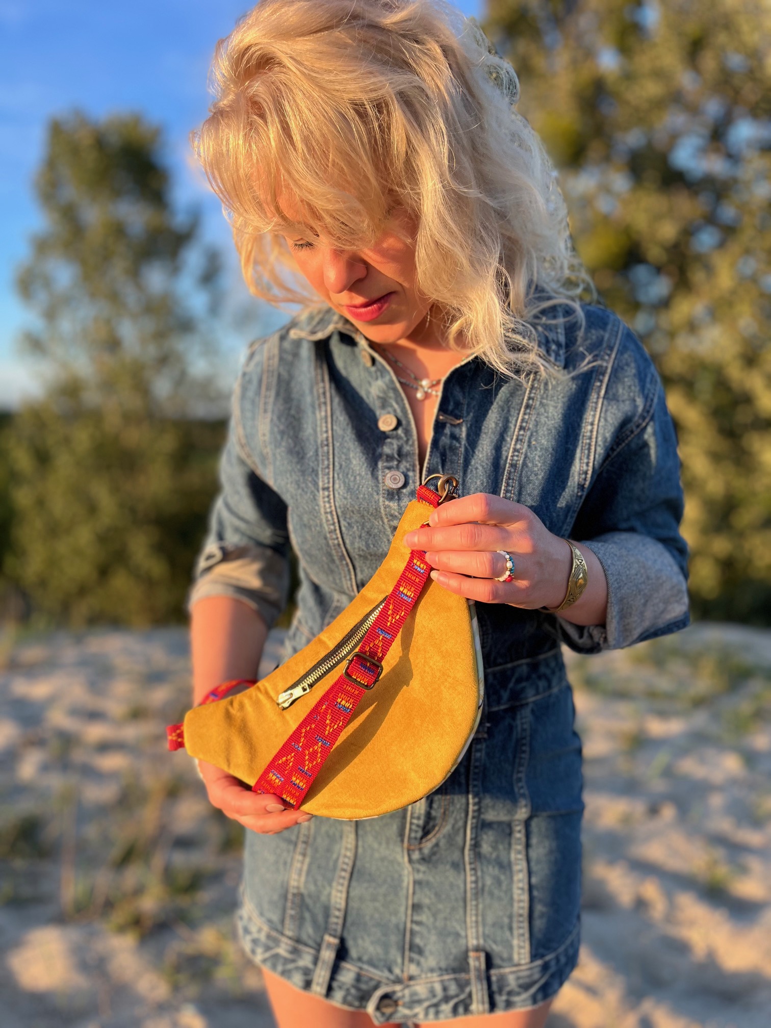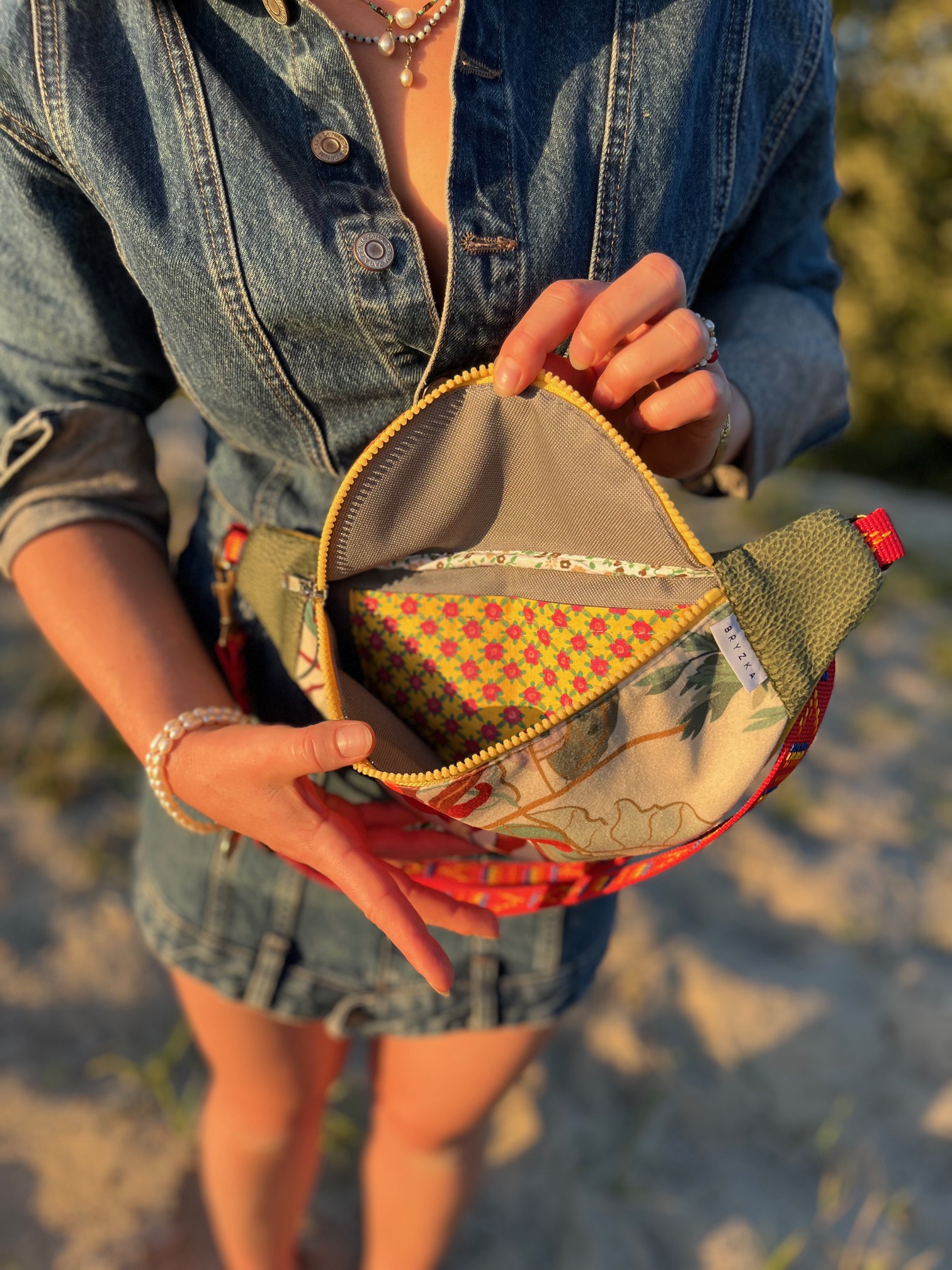 Boki wykonane są z zielonej tkaniny o wyraźnej fakturze, co nadaje projektowi ciekawej głębi i kontrastu. Pasek zdobi wielobarwna taśma z etnicznym wzorem, która sprawia, że nerka jest nie tylko praktyczna, ale i pełna osobowości.