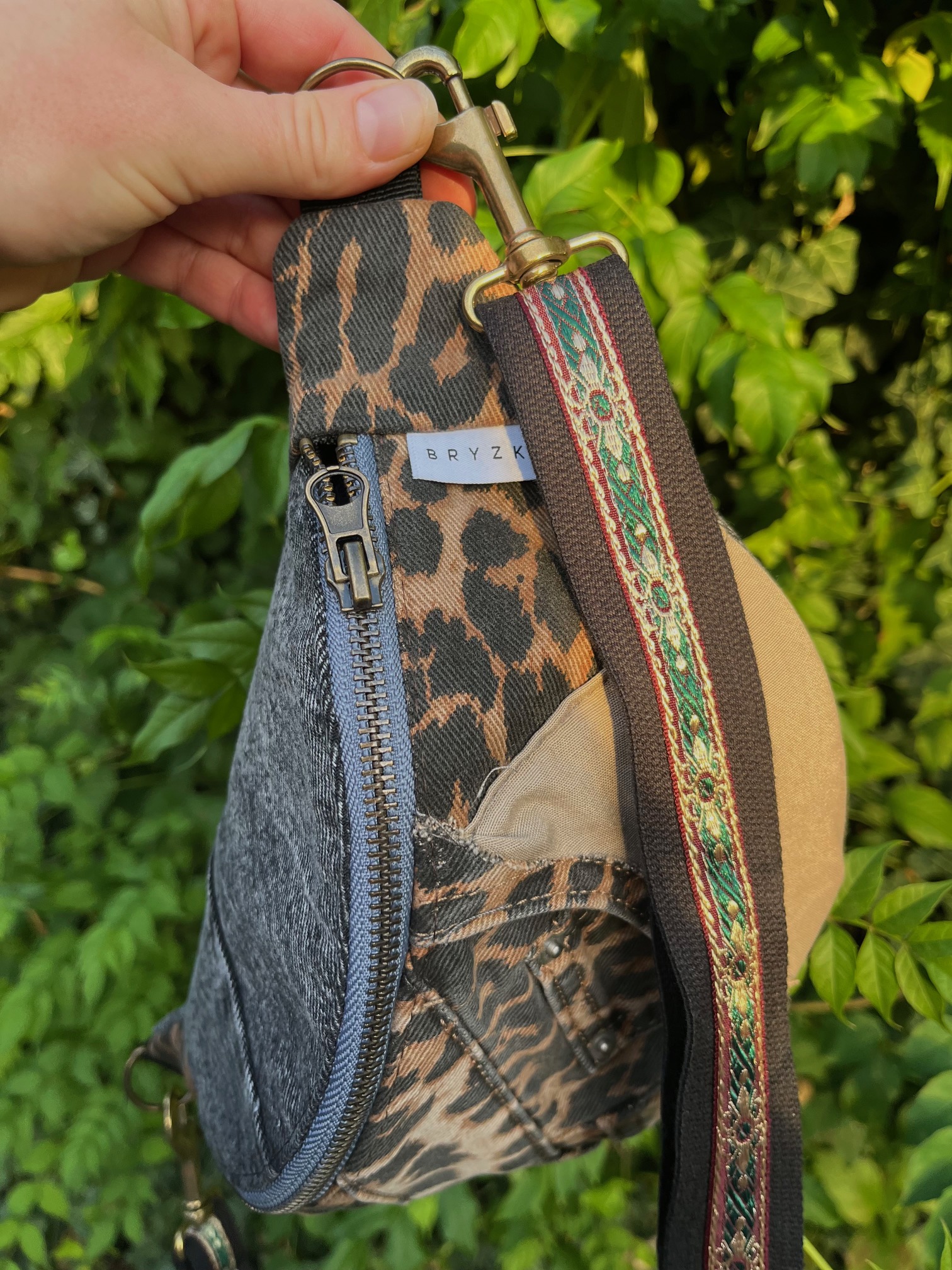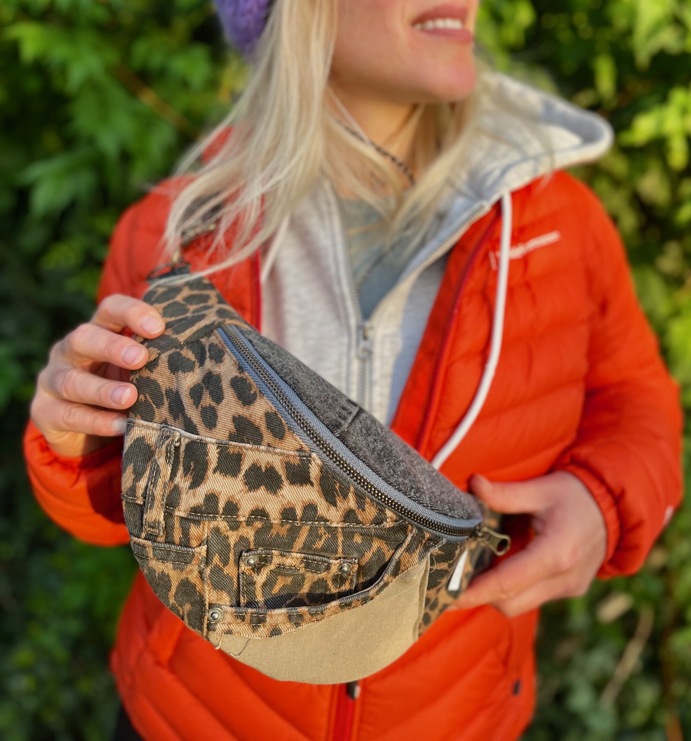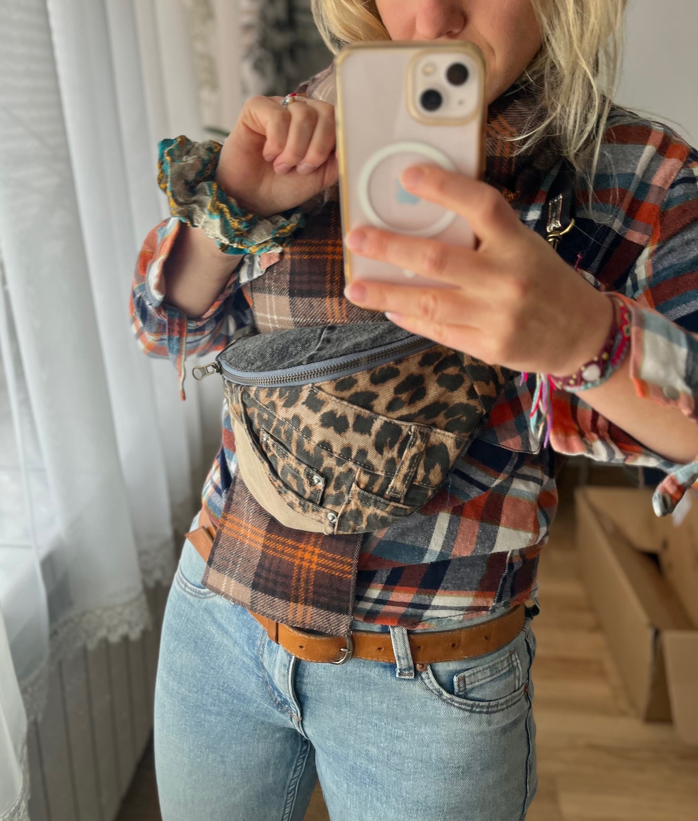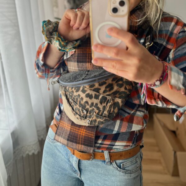 ✅ Na zewnątrz – patchworkowy design z tkanin w panterkę, jeans i szarości, z widocznymi kieszonkami i przeszyciami, które nadają nerce wyjątkowy styl vintage.