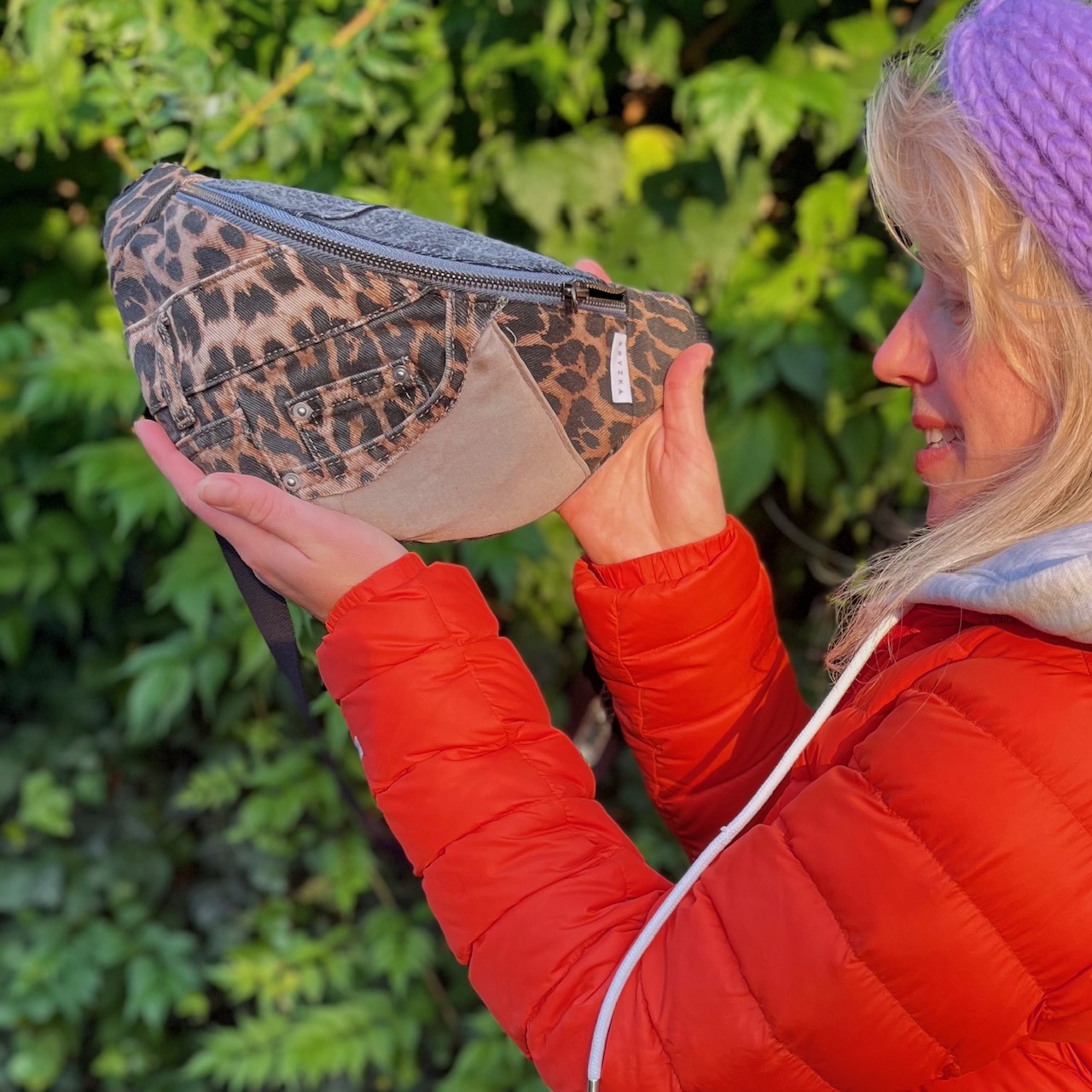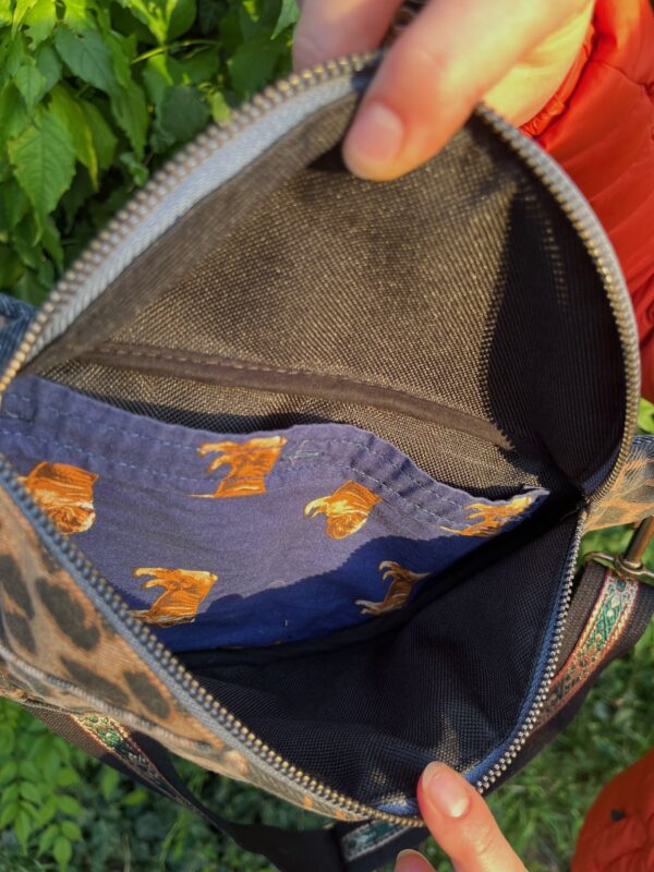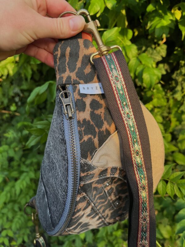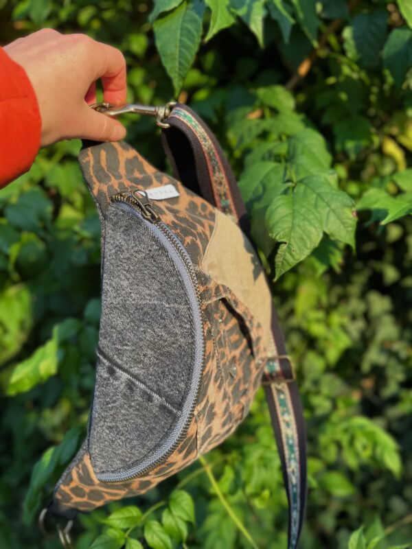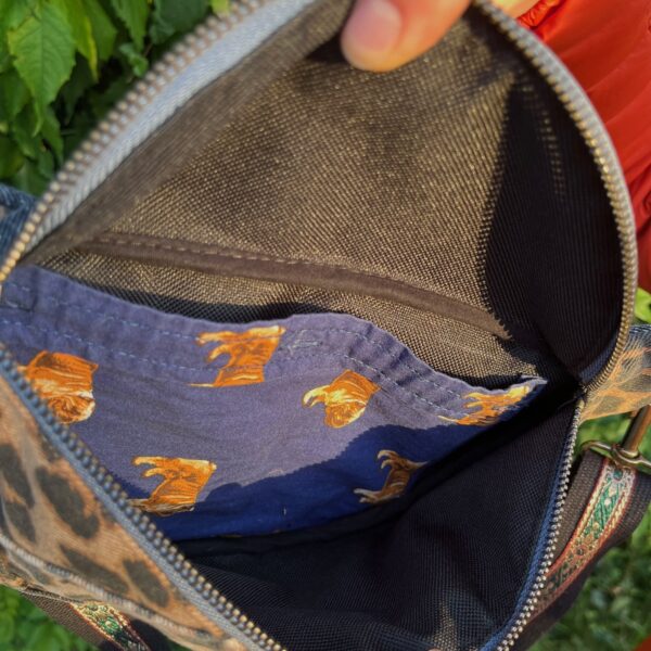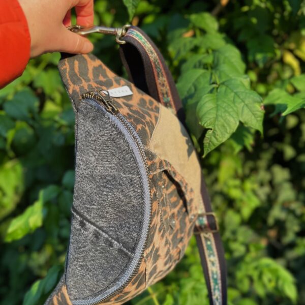 Unikatowa nerka stworzona z połączenia recyklingowych tkanin – każde egzemplarz jest jedyny w swoim rodzaju i niepowtarzalny.