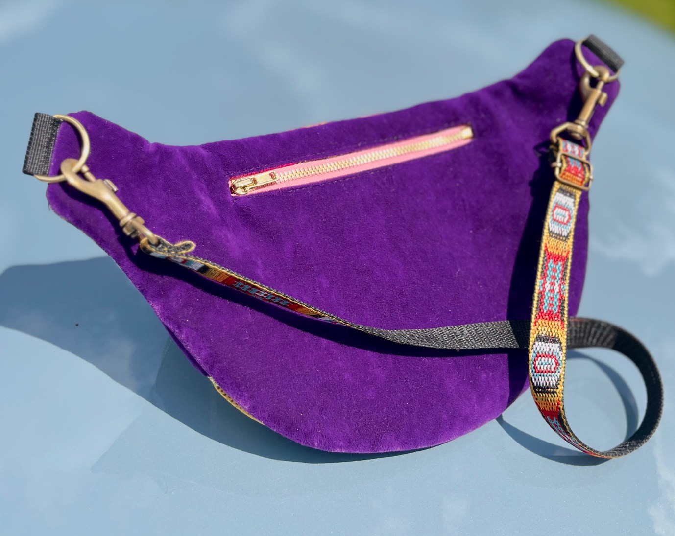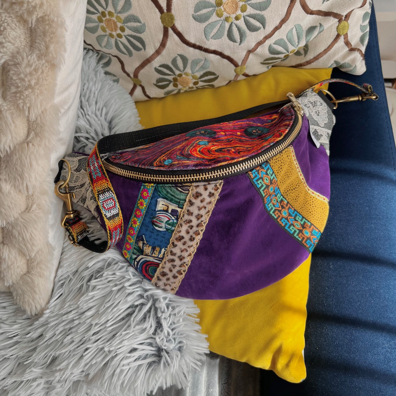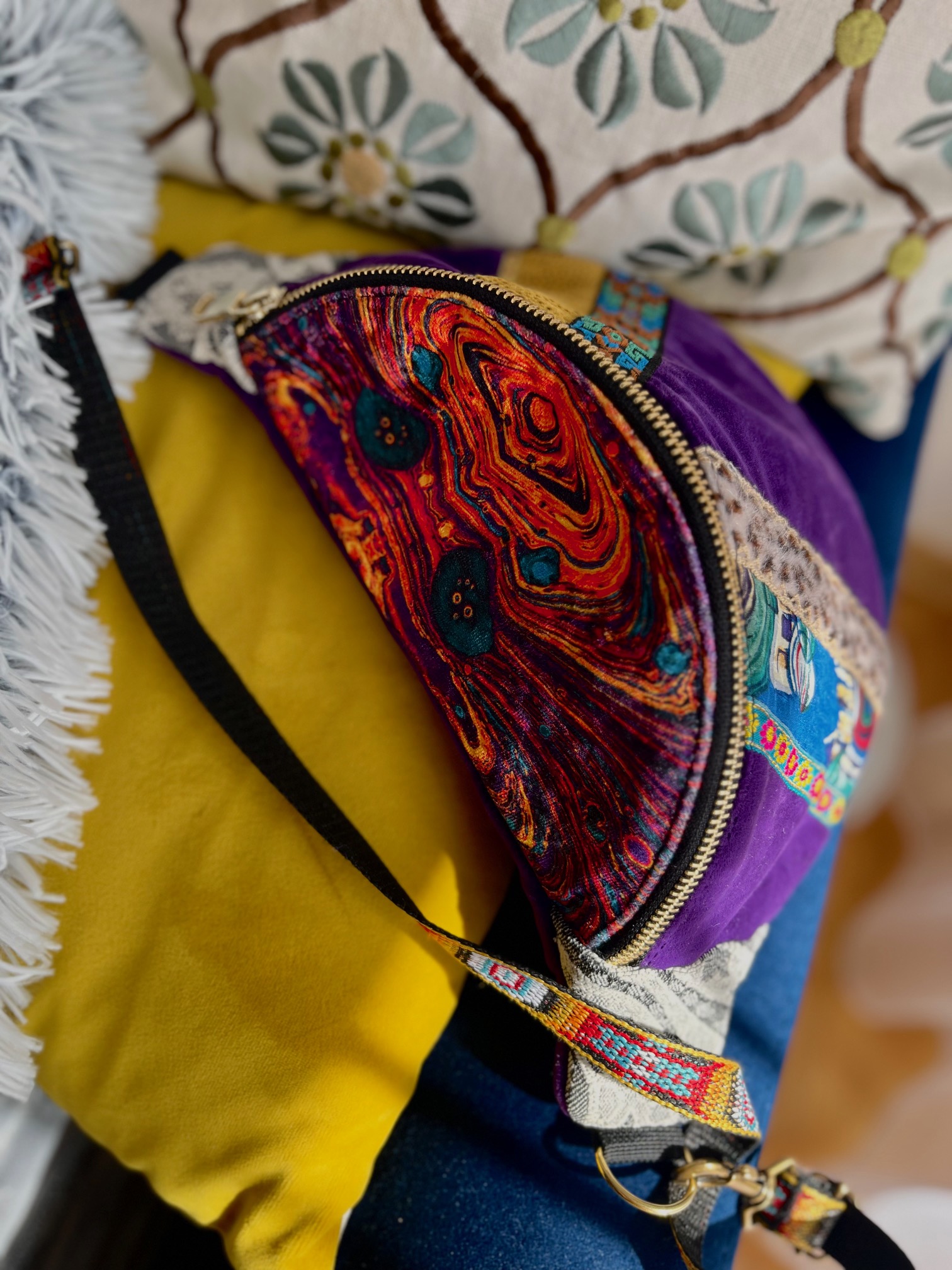 Nerka w rozmiarze M. Nerka saszetka uszyta w kontrastach – pomarańczy – fiolet – żółć. Materiał świetny gatunkowo. Zamek ykk. Kontrastowy pasek. Unikat.