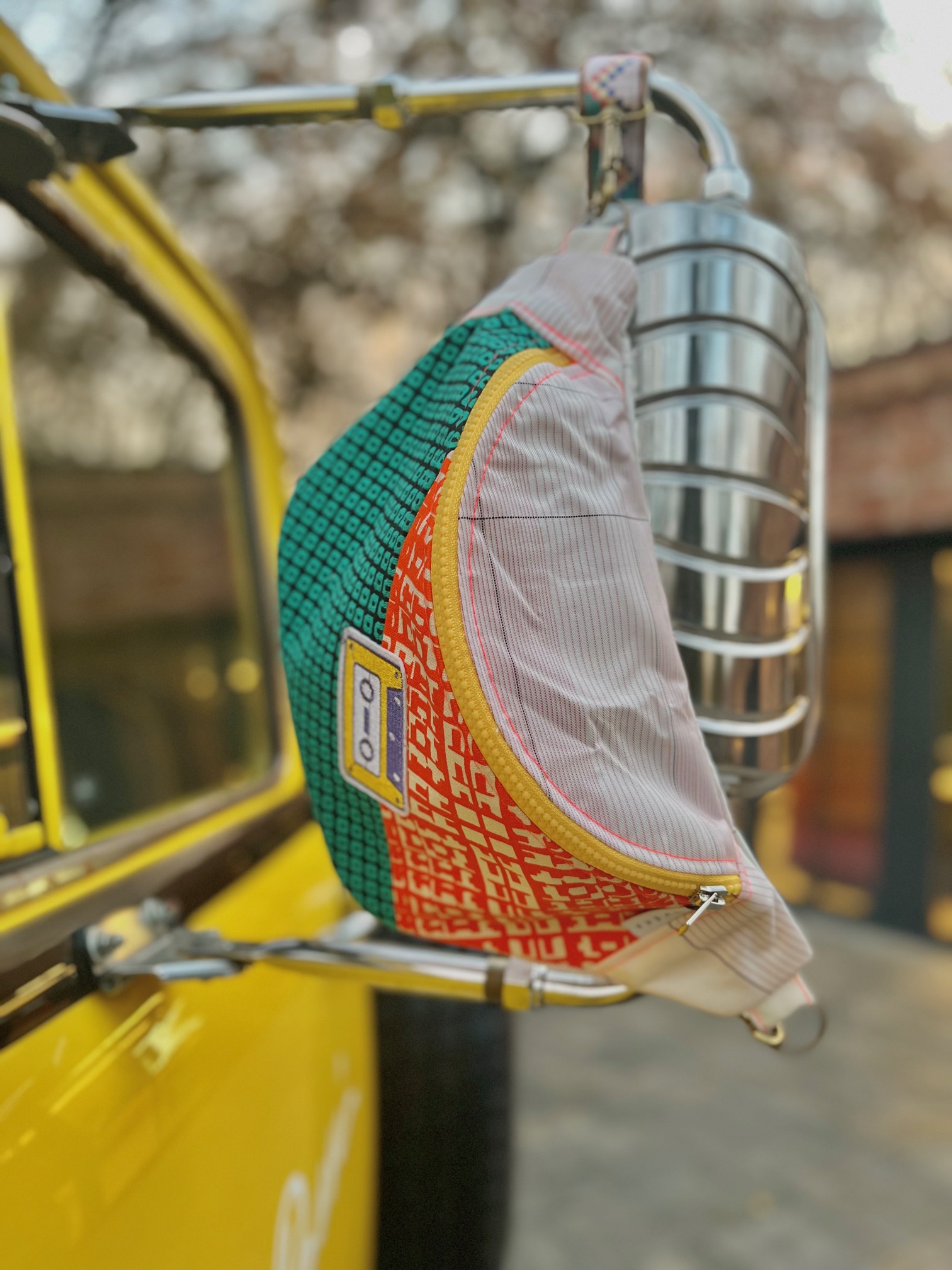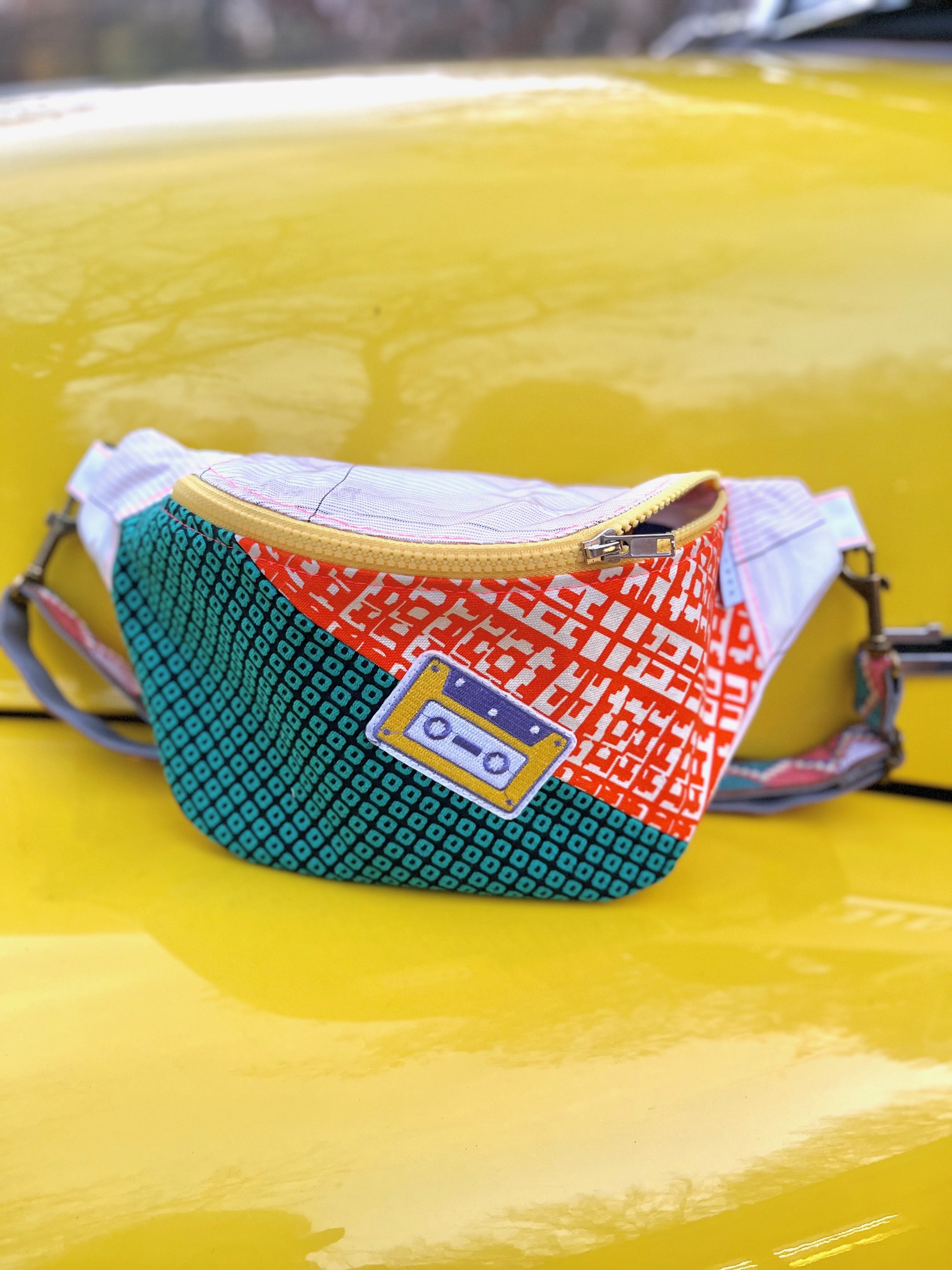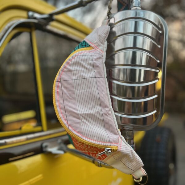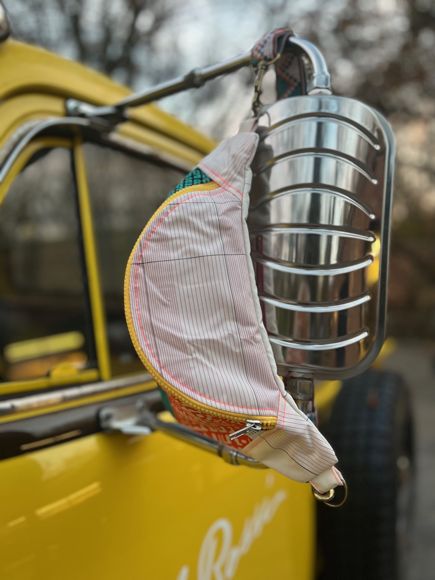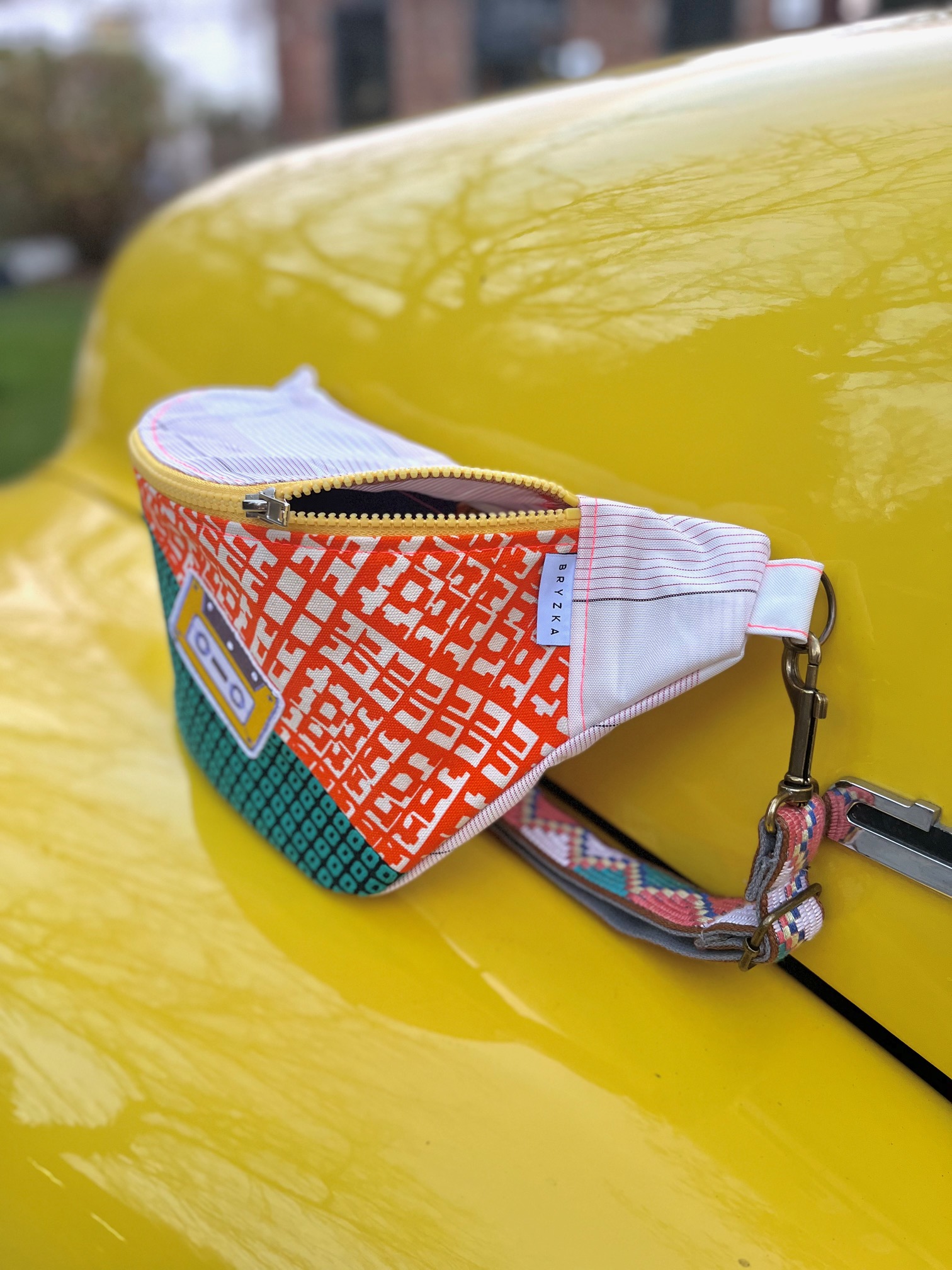 Nerka uszyta z poduszki powietrznej. Na froncie etniczne paski/tasiemki. Nieoczywiste połączenia. Nerka wodoodporna. Upcycling.