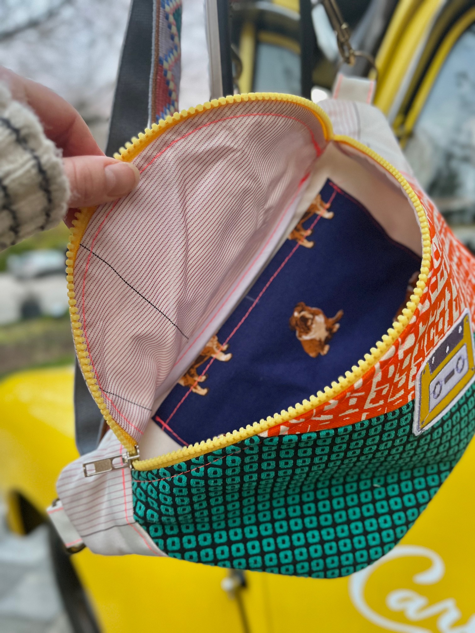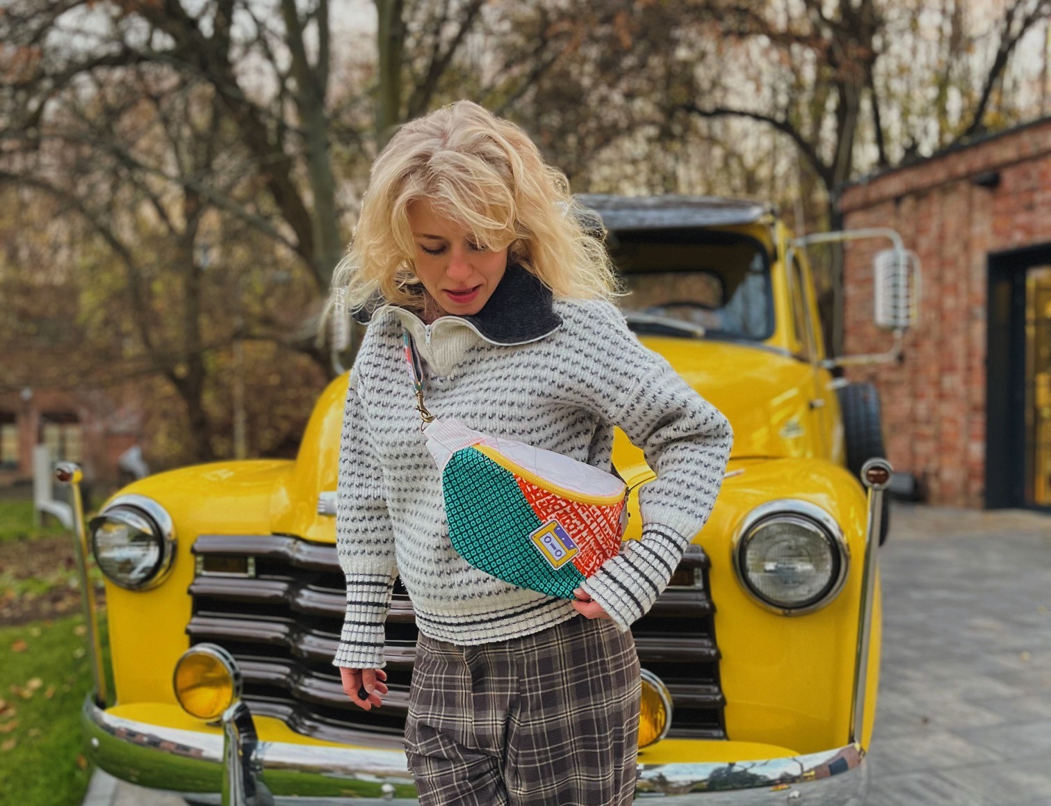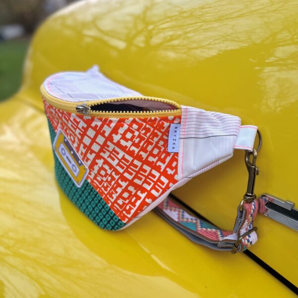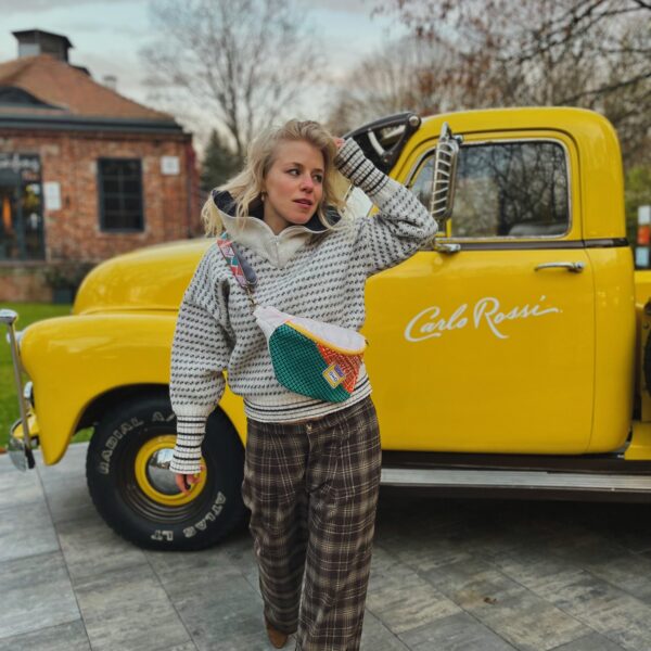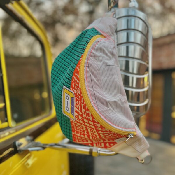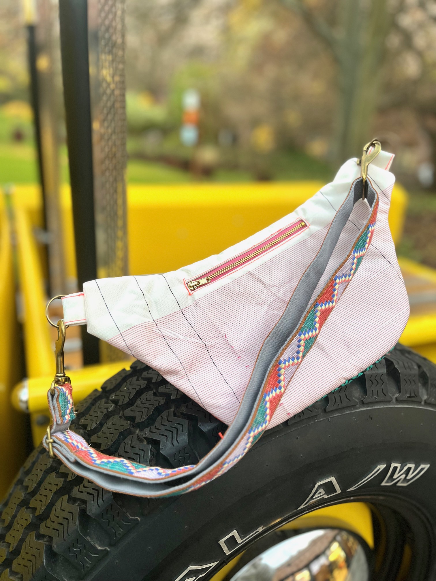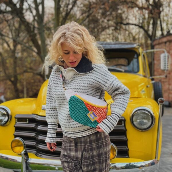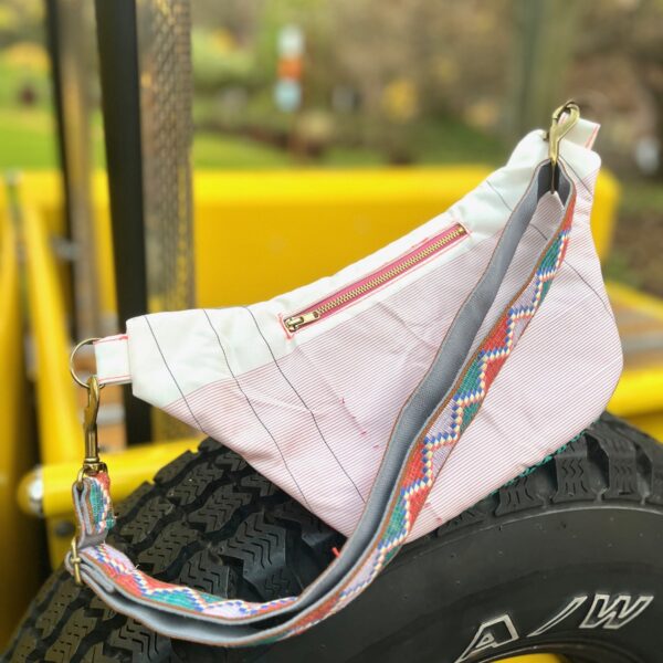 Nerka uszyta z poduszki powietrznej. Na froncie etniczne paski/tasiemki. Nieoczywiste połączenia. Nerka wodoodporna. Upcycling.