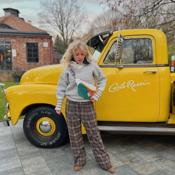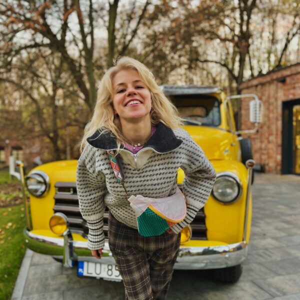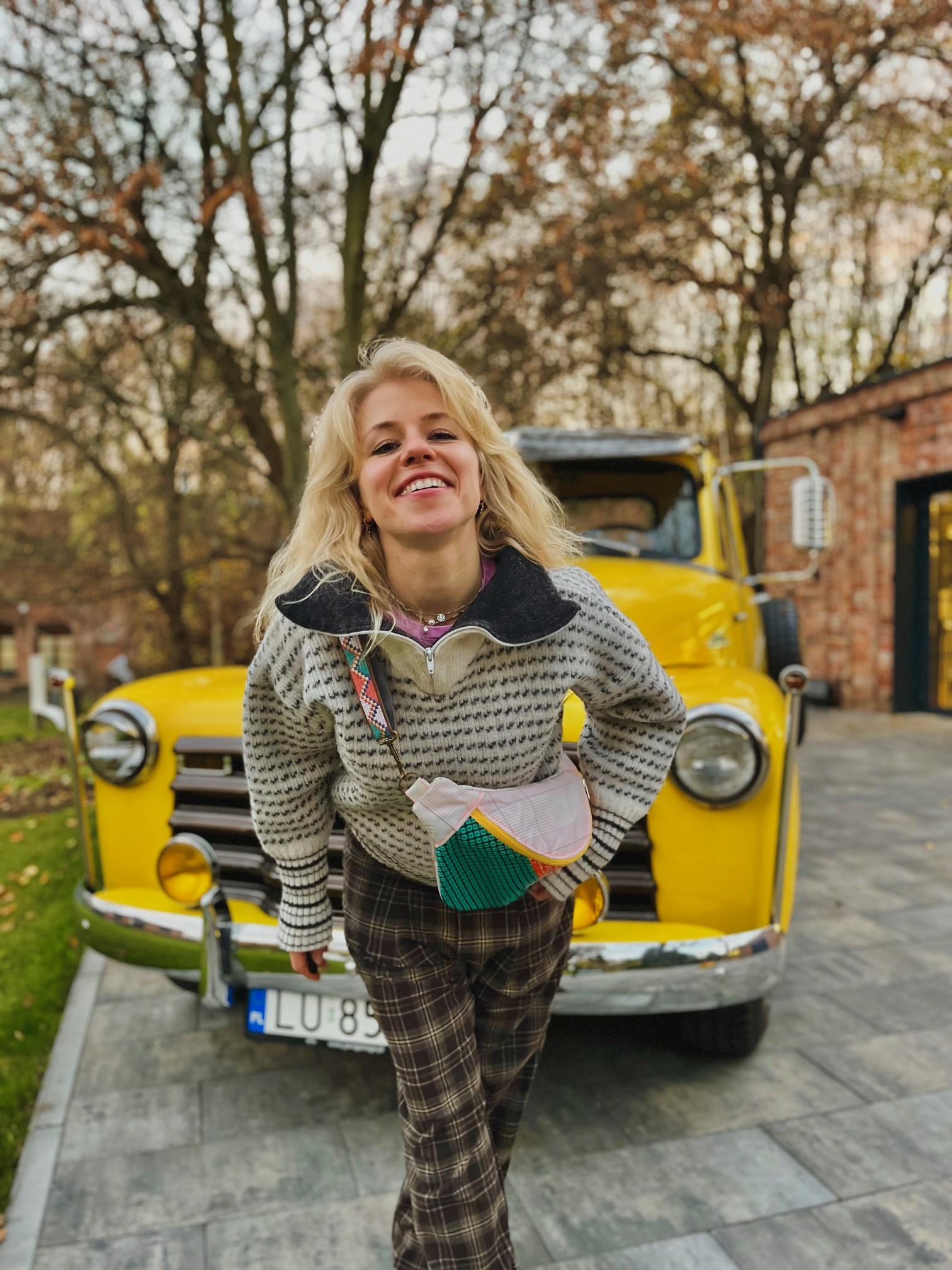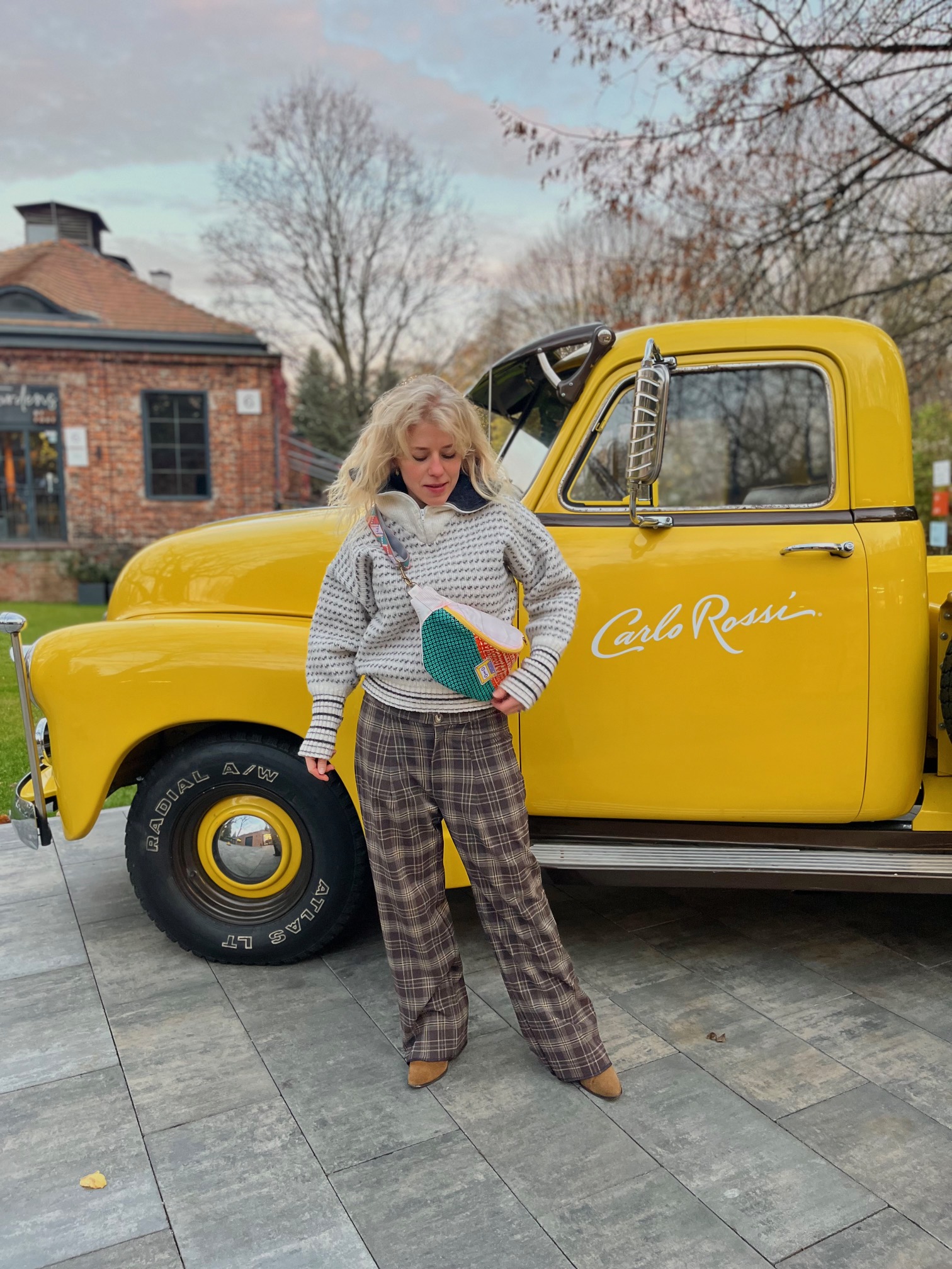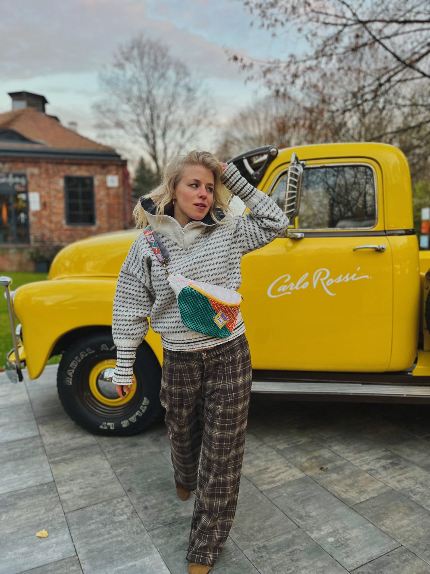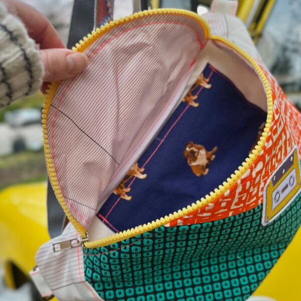 Nerka uszyta z poduszki powietrznej. Na froncie etniczne paski/tasiemki. Nieoczywiste połączenia. Nerka wodoodporna. Upcycling.