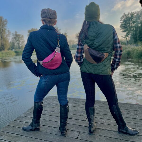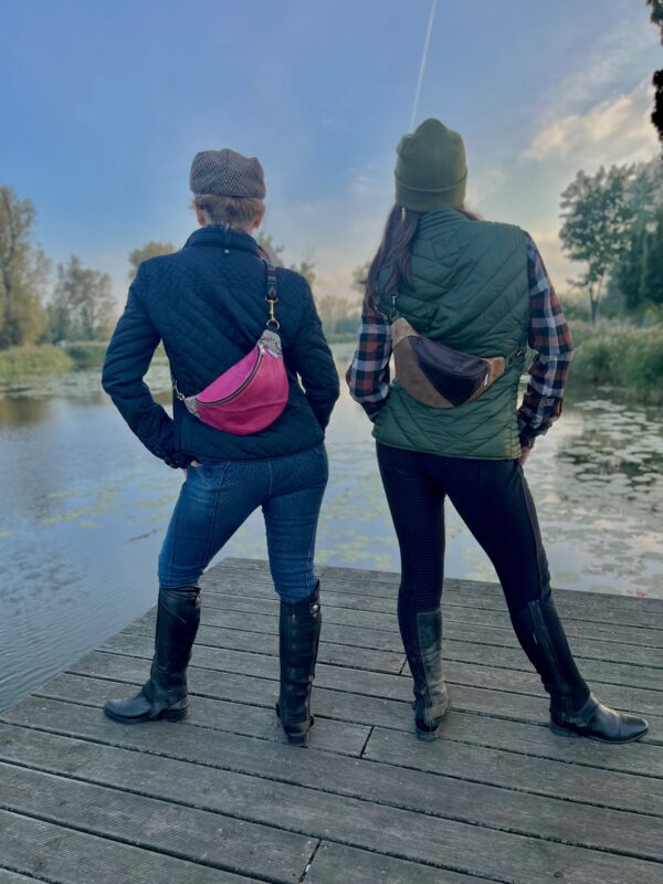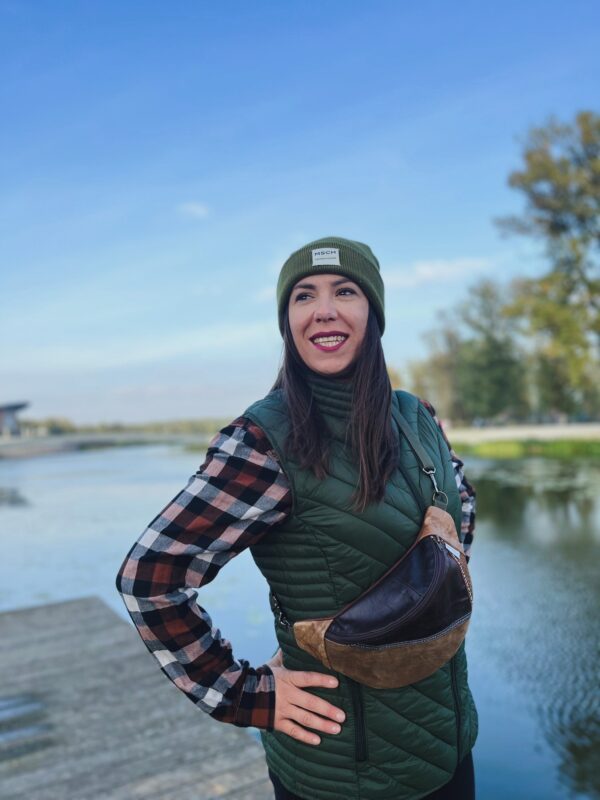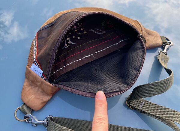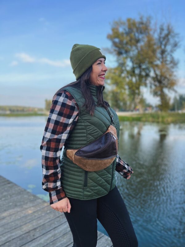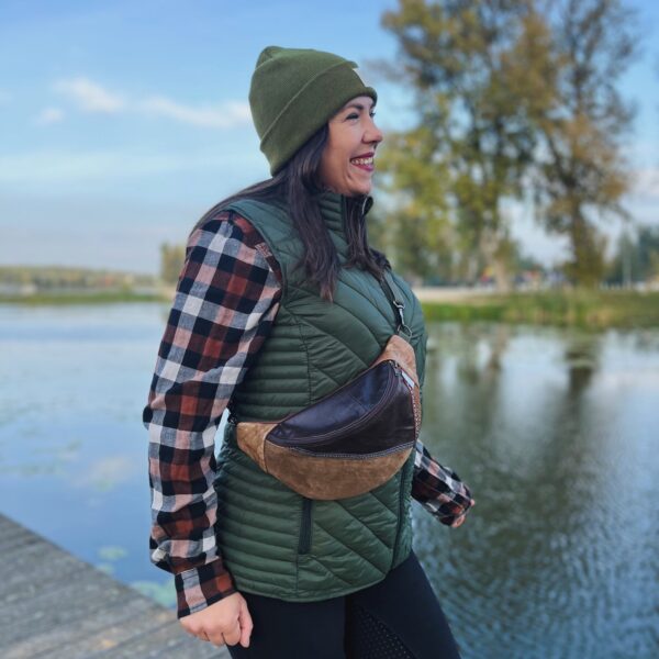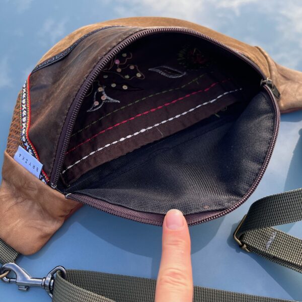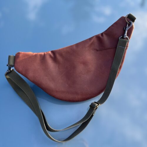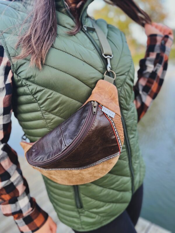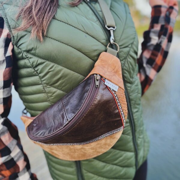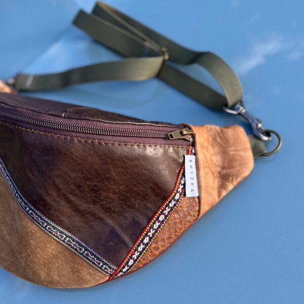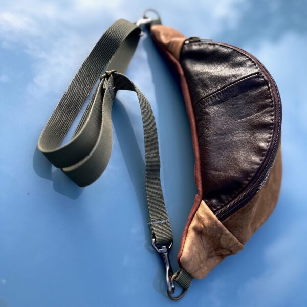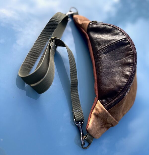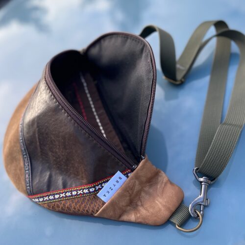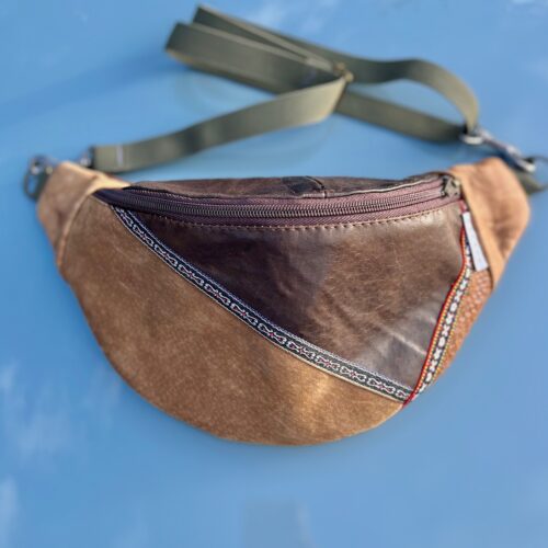Nerka saszetka uszyta z różnych skór z odzysku. Klasyczne połączenia kolorystyczne.