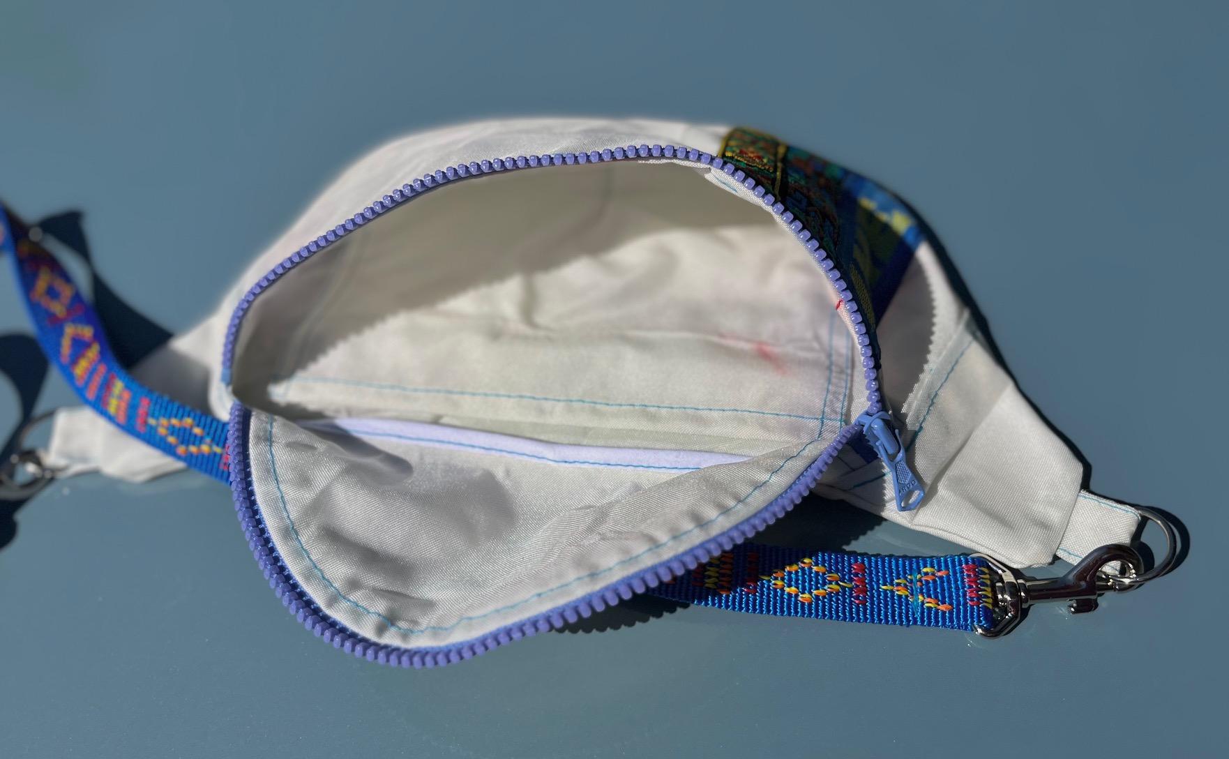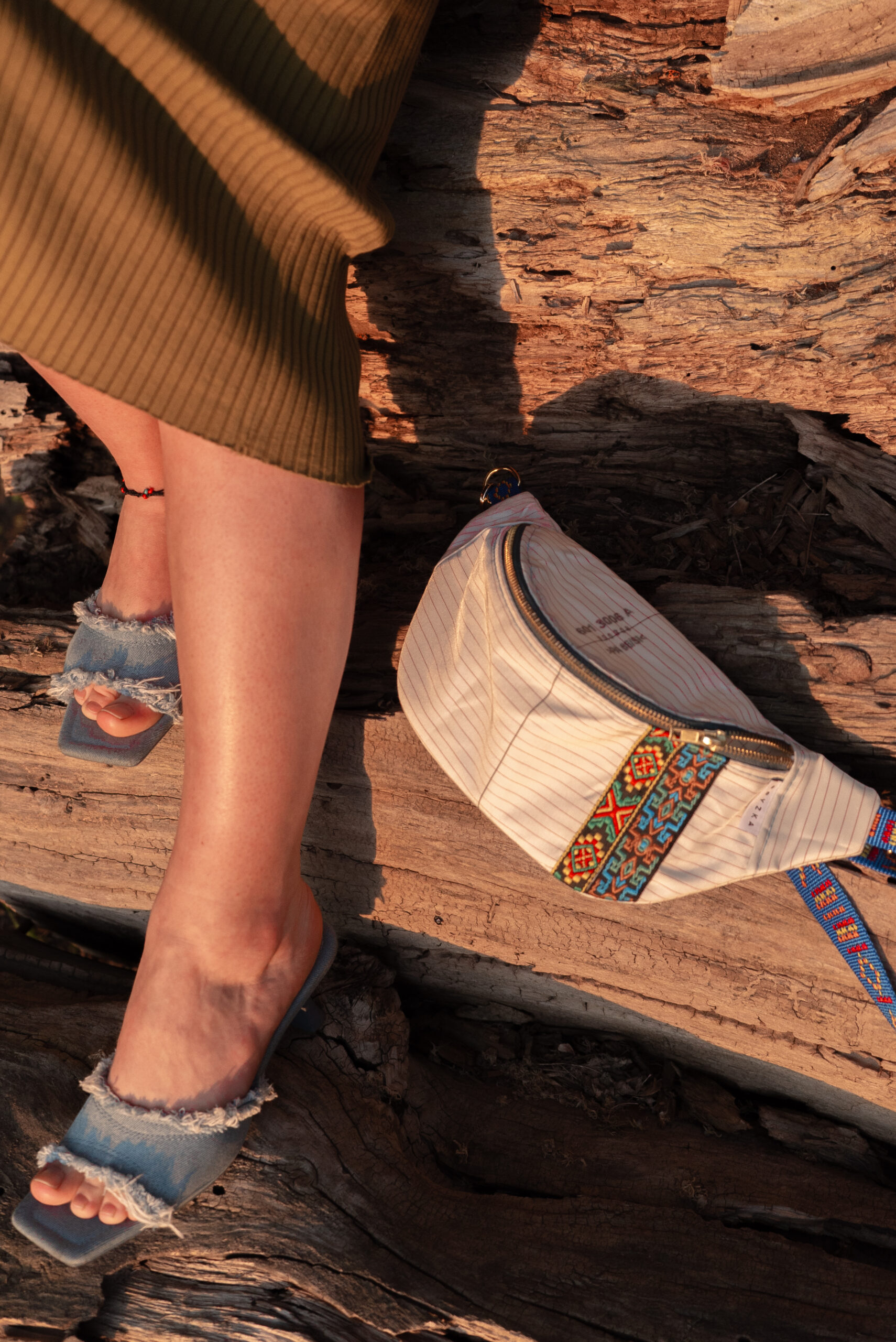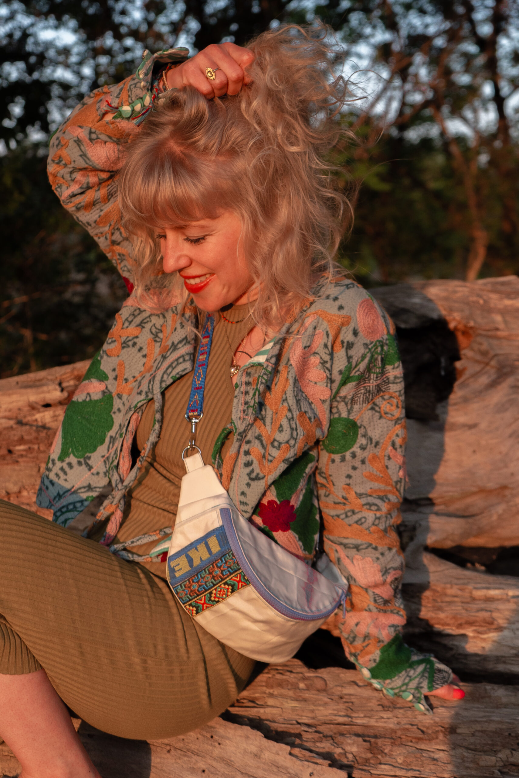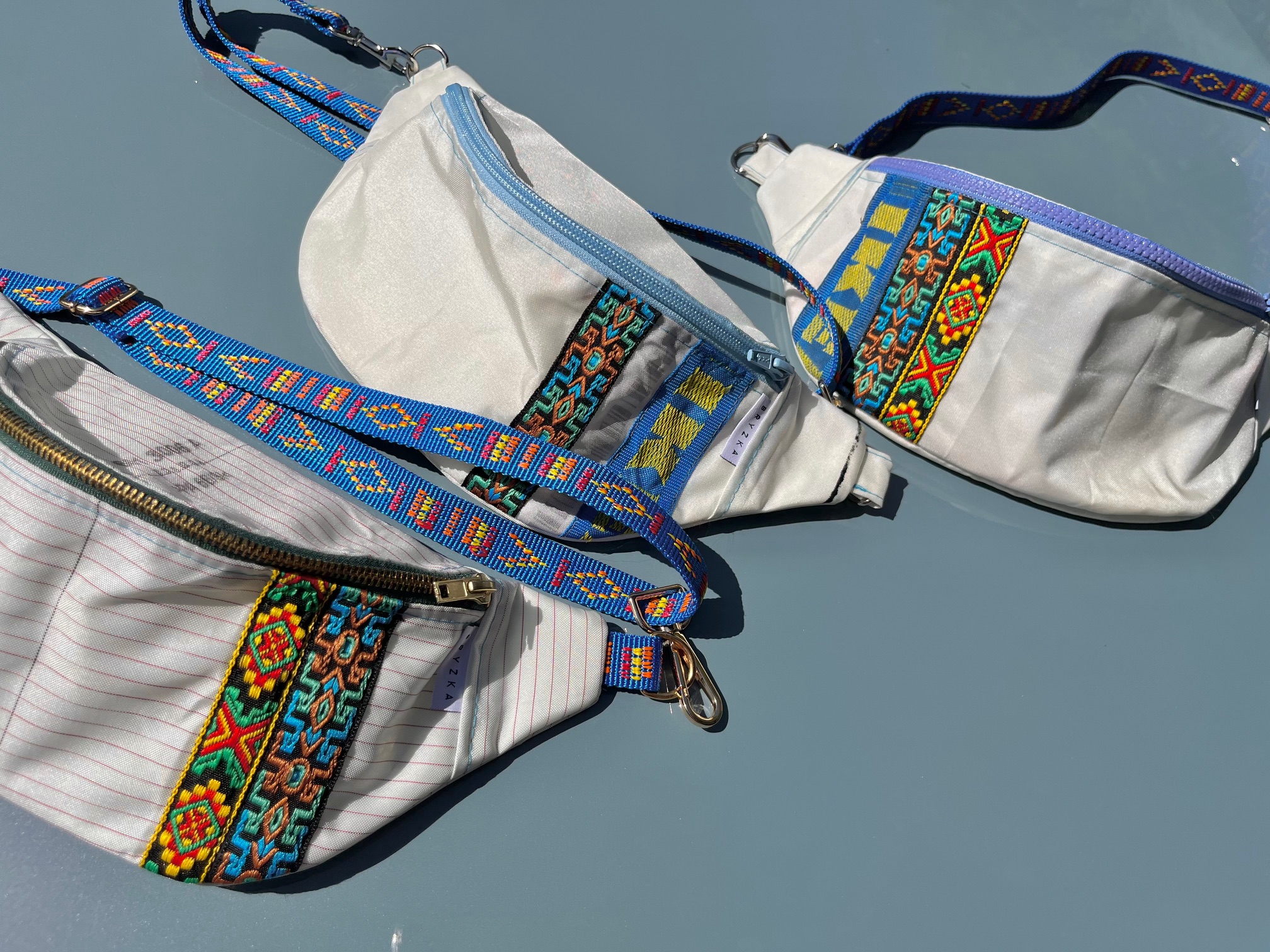 Nerka uszyta z poduszki powietrznej. Na froncie etniczne paski/tasiemki. Nieoczywiste połączenia. Hit tego lata. Nerka wodoodporna. Upcycling.