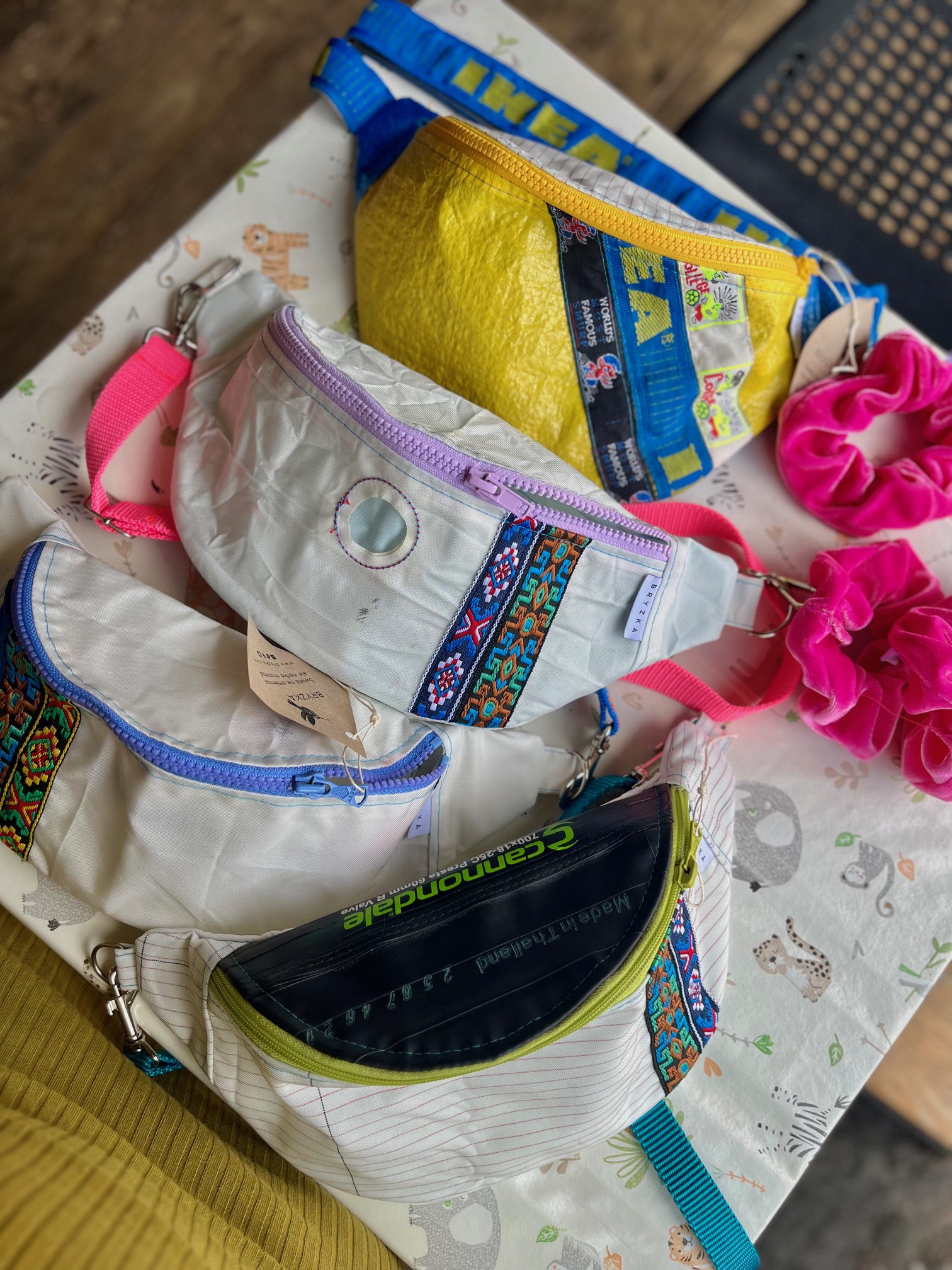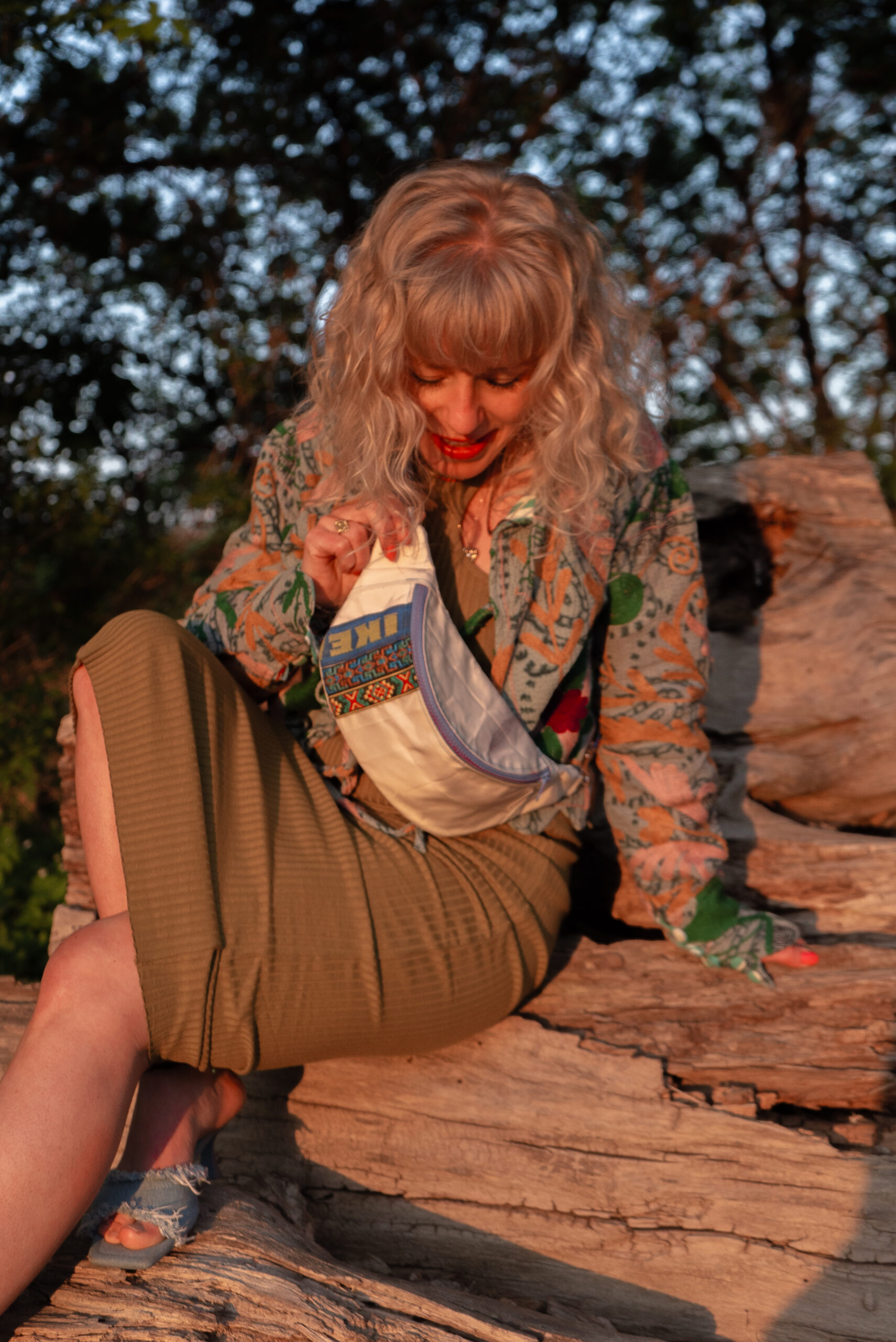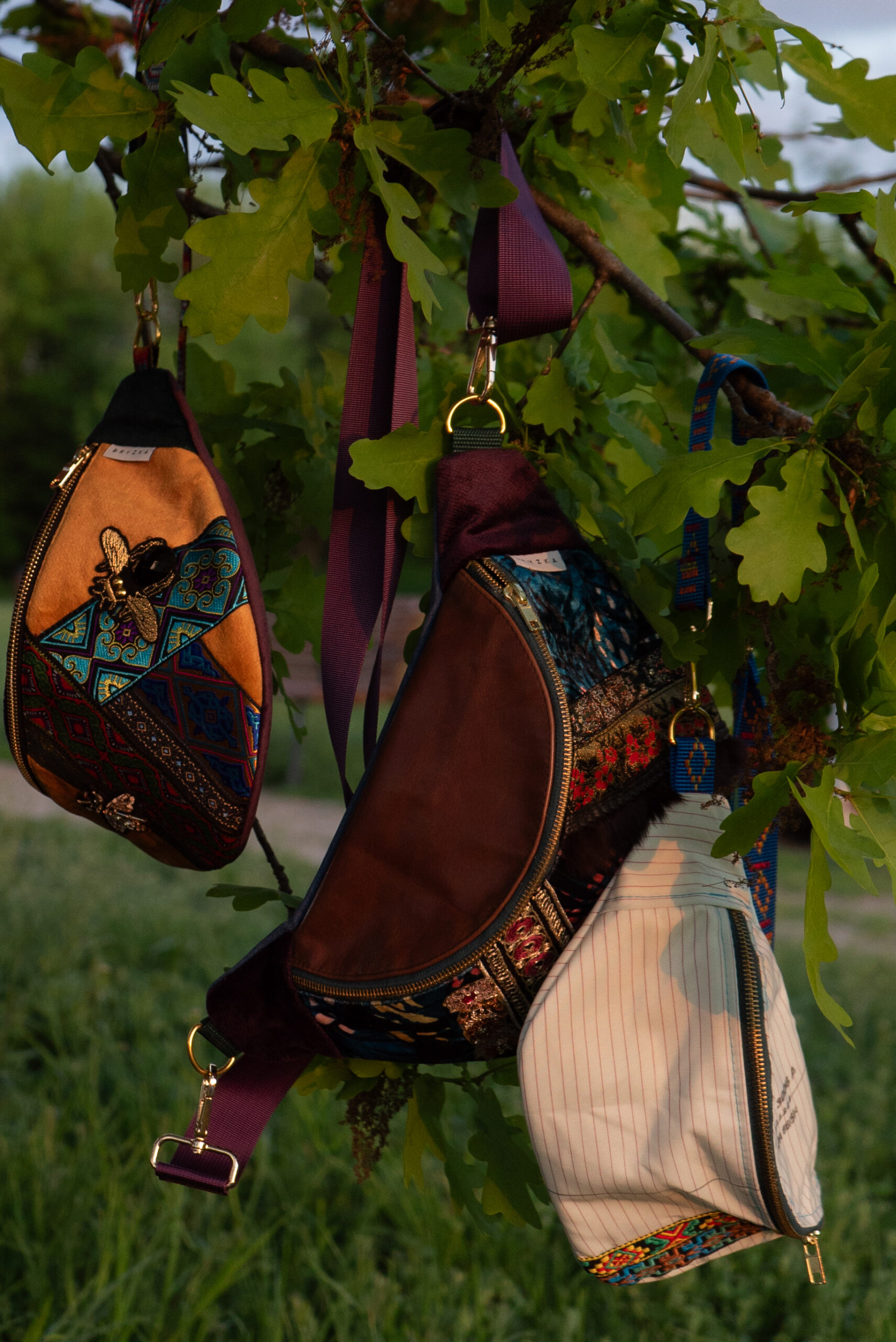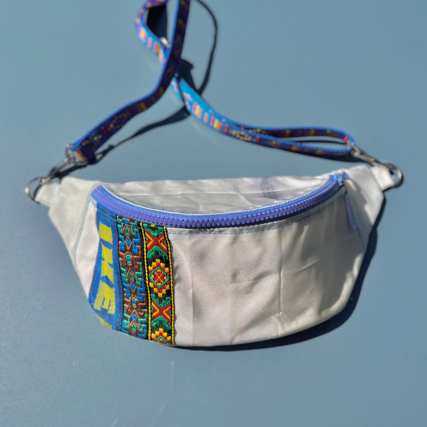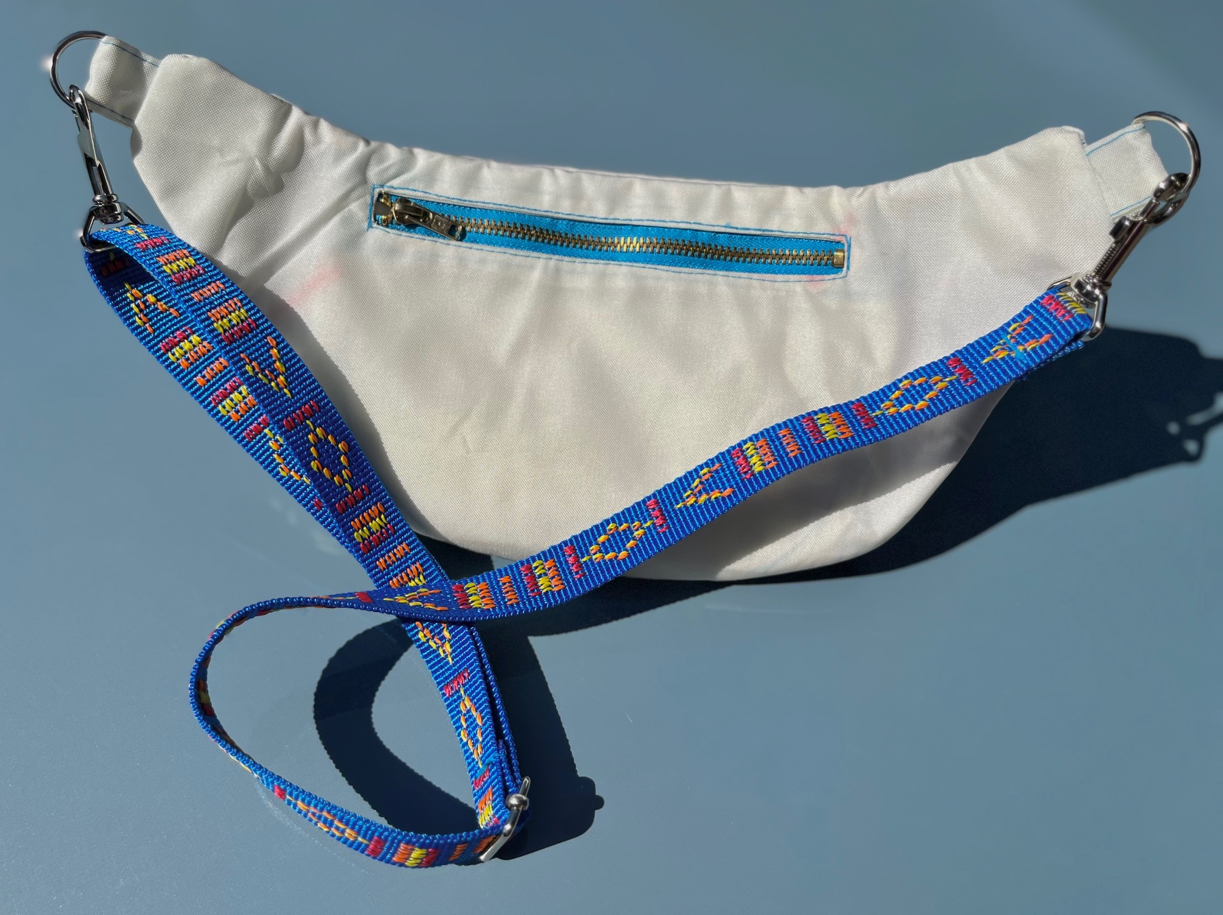 Nerka uszyta z poduszki powietrznej. Na froncie etniczne paski/tasiemki. Nieoczywiste połączenia. Hit tego lata. Nerka wodoodporna. Upcycling.
