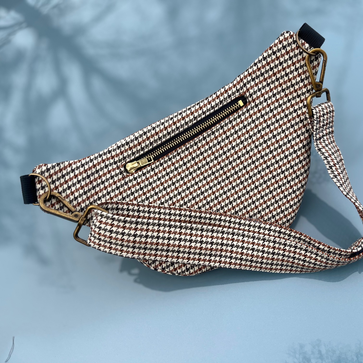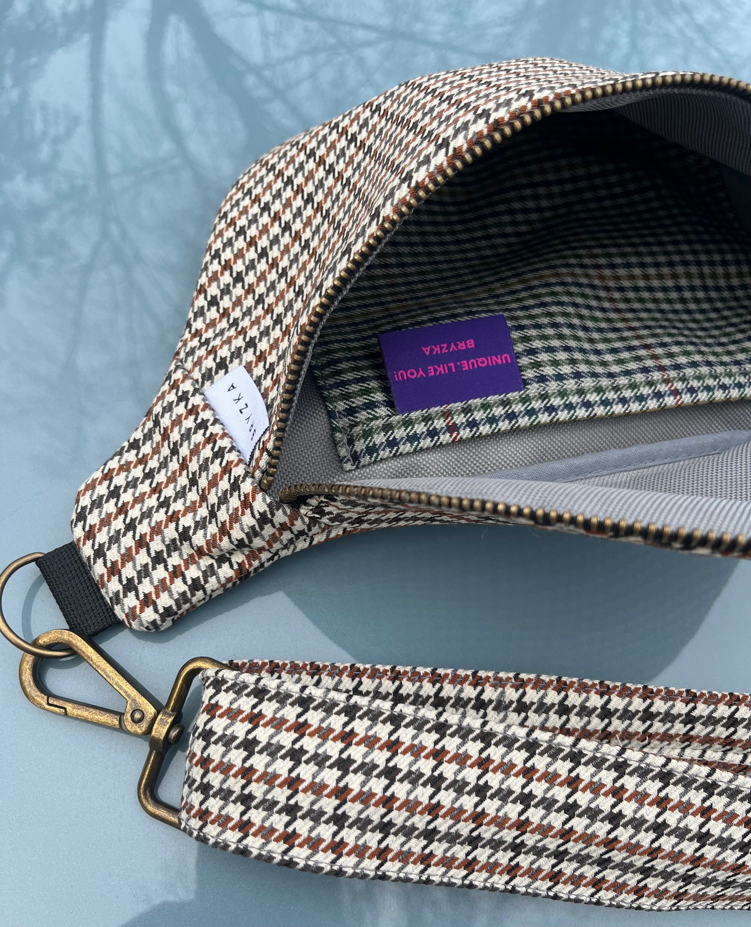 Wzór Królewski: Dominującym elementem jest klasyczna kratka typu Houndstooth (pepitka) w stonowanej kolorystyce brązów, beżu i czerni. Ten wzór, nieodłącznie kojarzony z brytyjską modą jeździecką i elegancją vintage, dodaje nerce szyku i struktury.