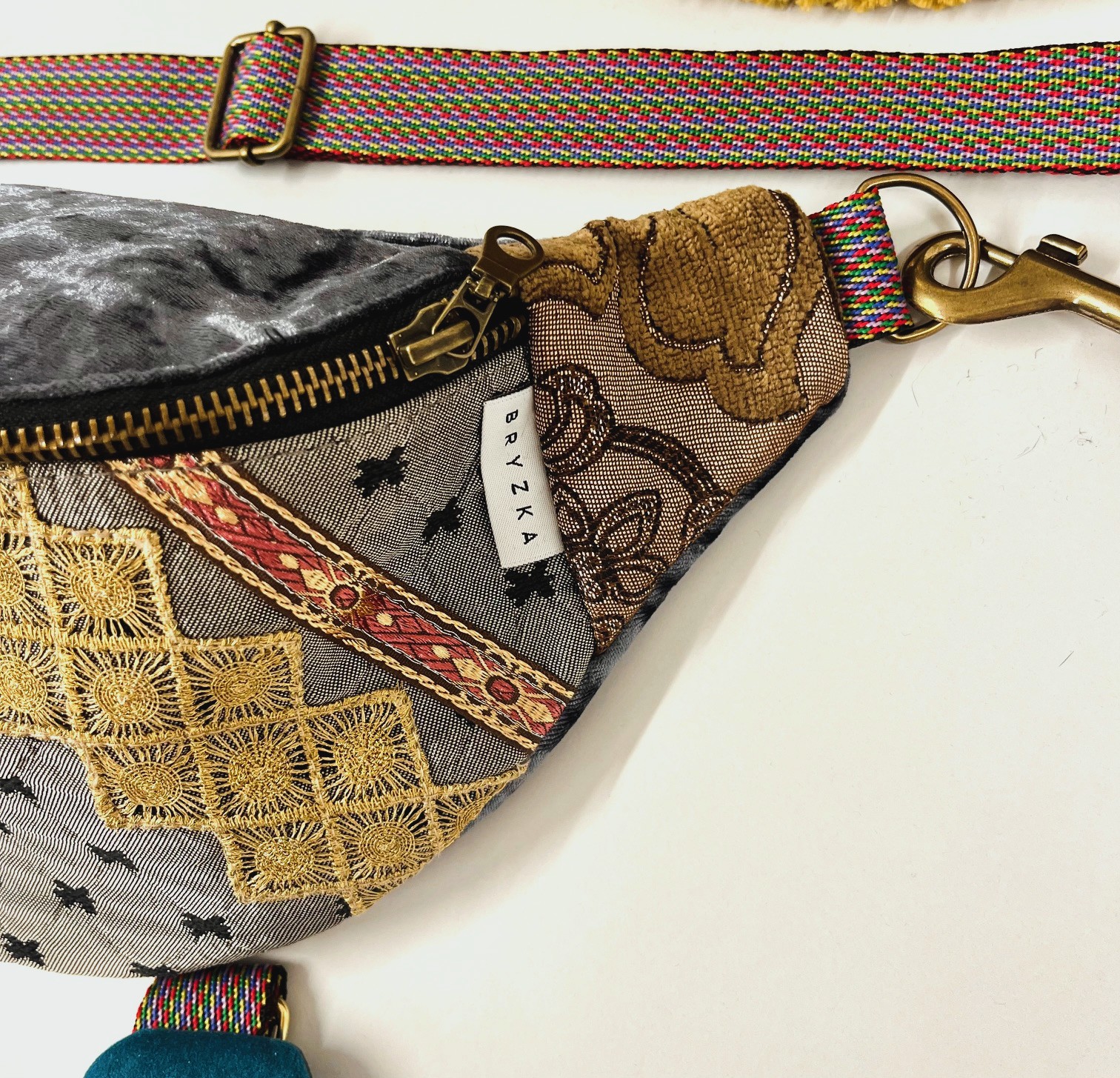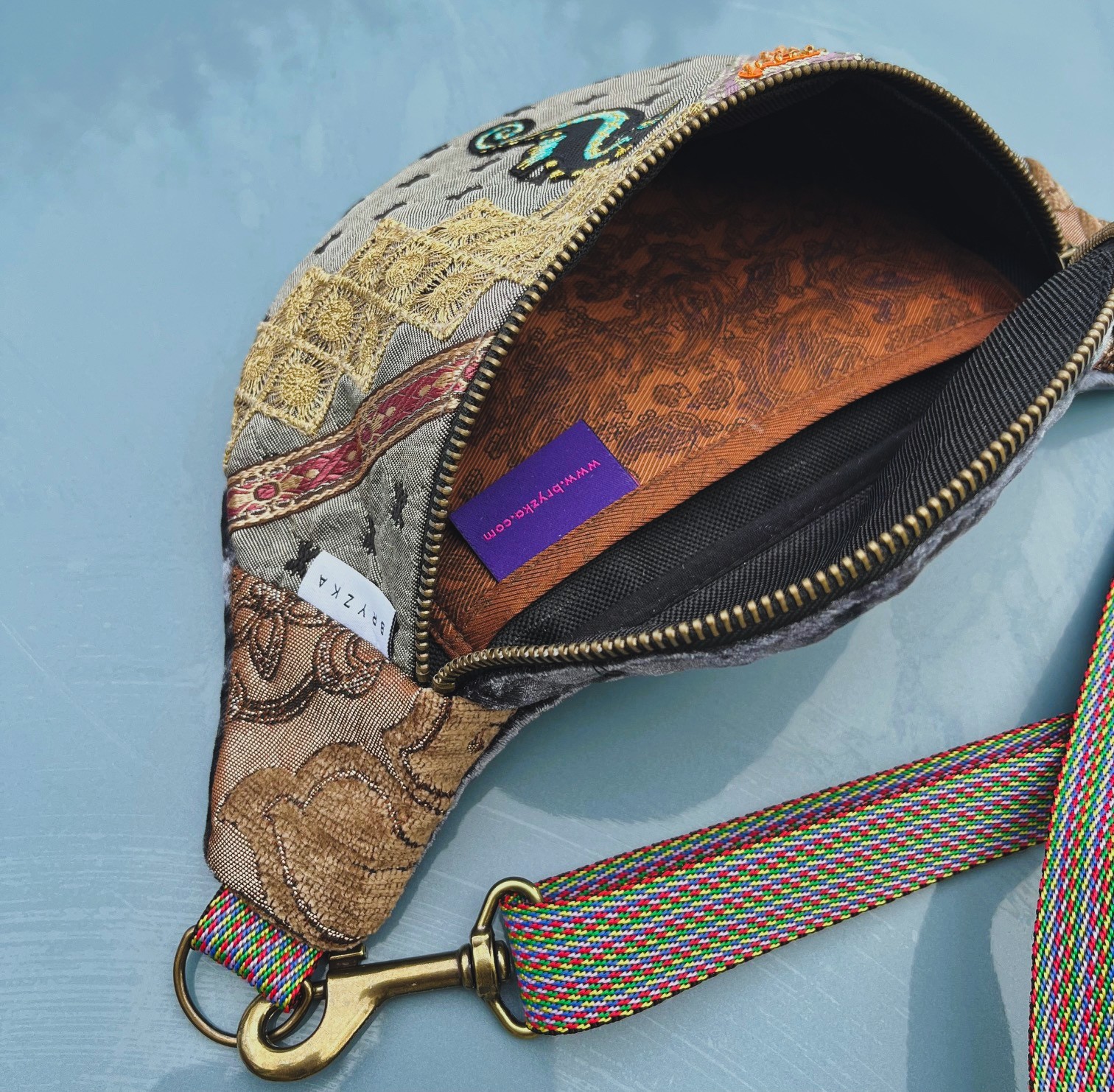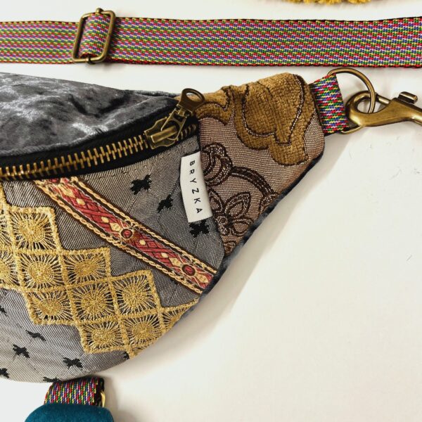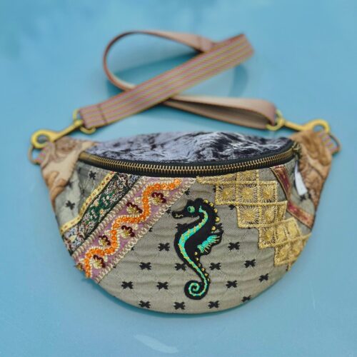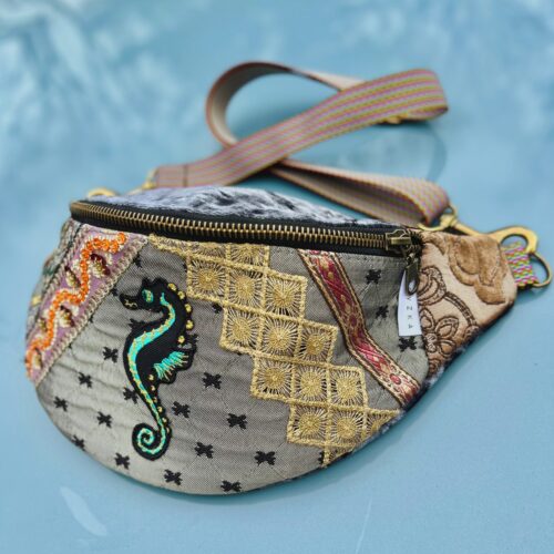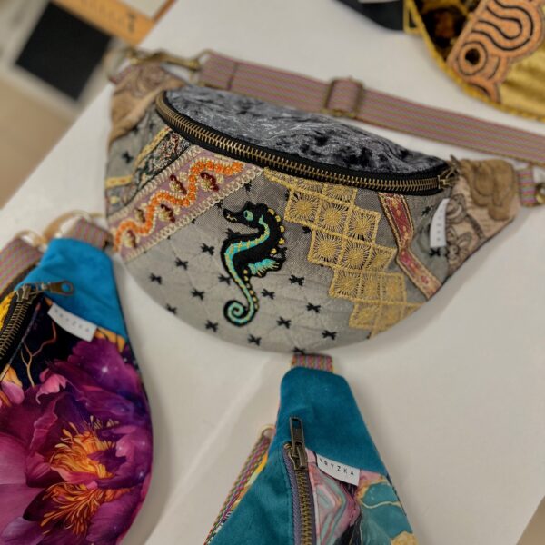 Na froncie zdobi ją ręcznie wyszywany motyw morskiego konika, otoczony bogatymi detalami z cekinów, złotych nici i koronek. Połączenie miękkiego aksamitu, wzorzystych tkanin i ozdobnych przeszyć sprawia, że każda nerka jest jedyna w swoim rodzaju – nie ma dwóch identycznych egzemplarzy.