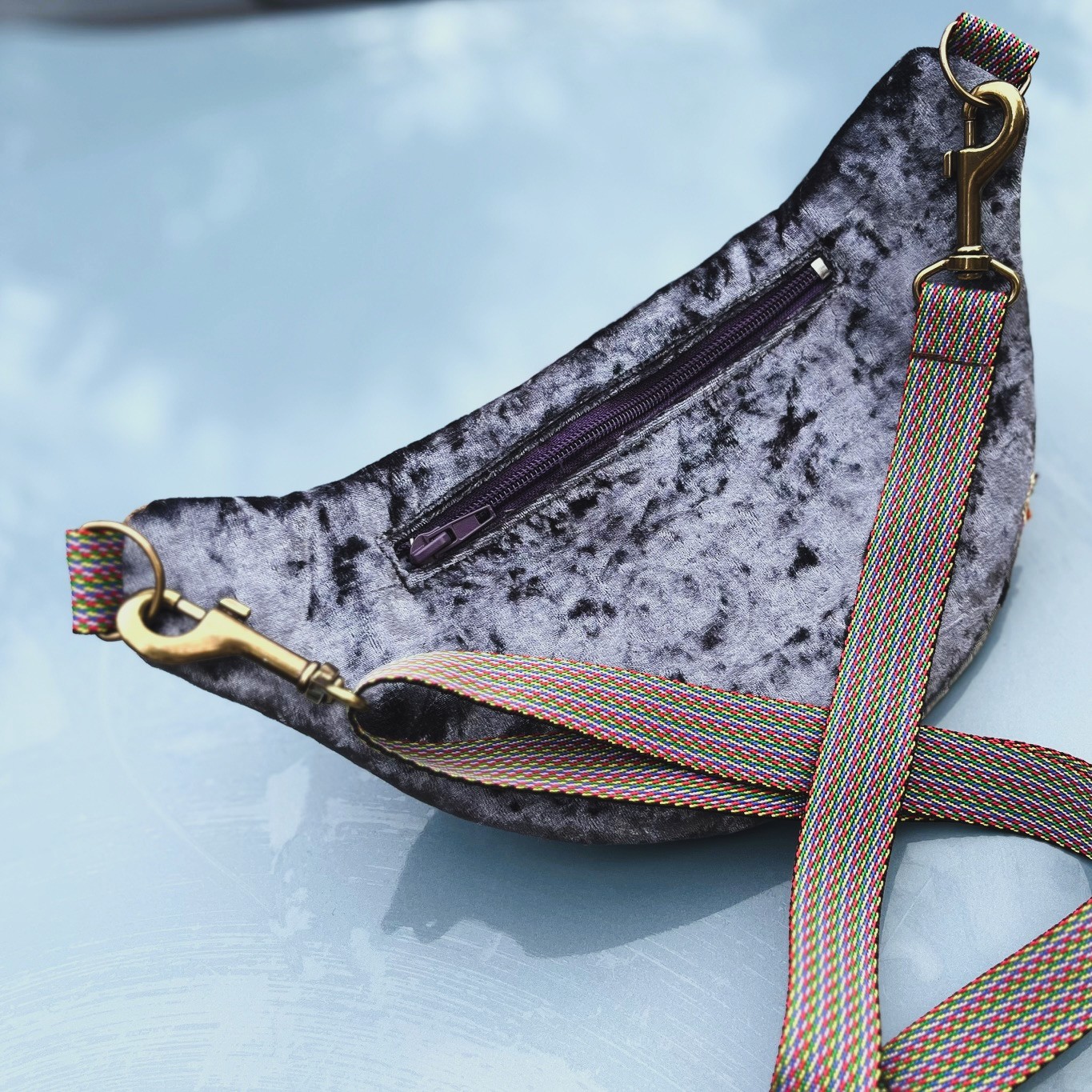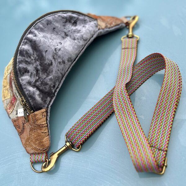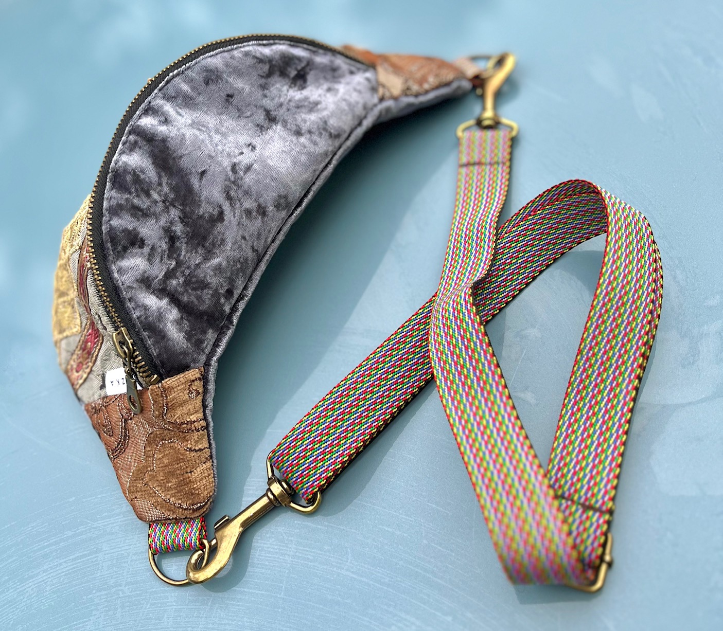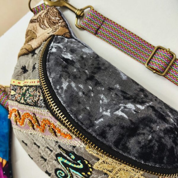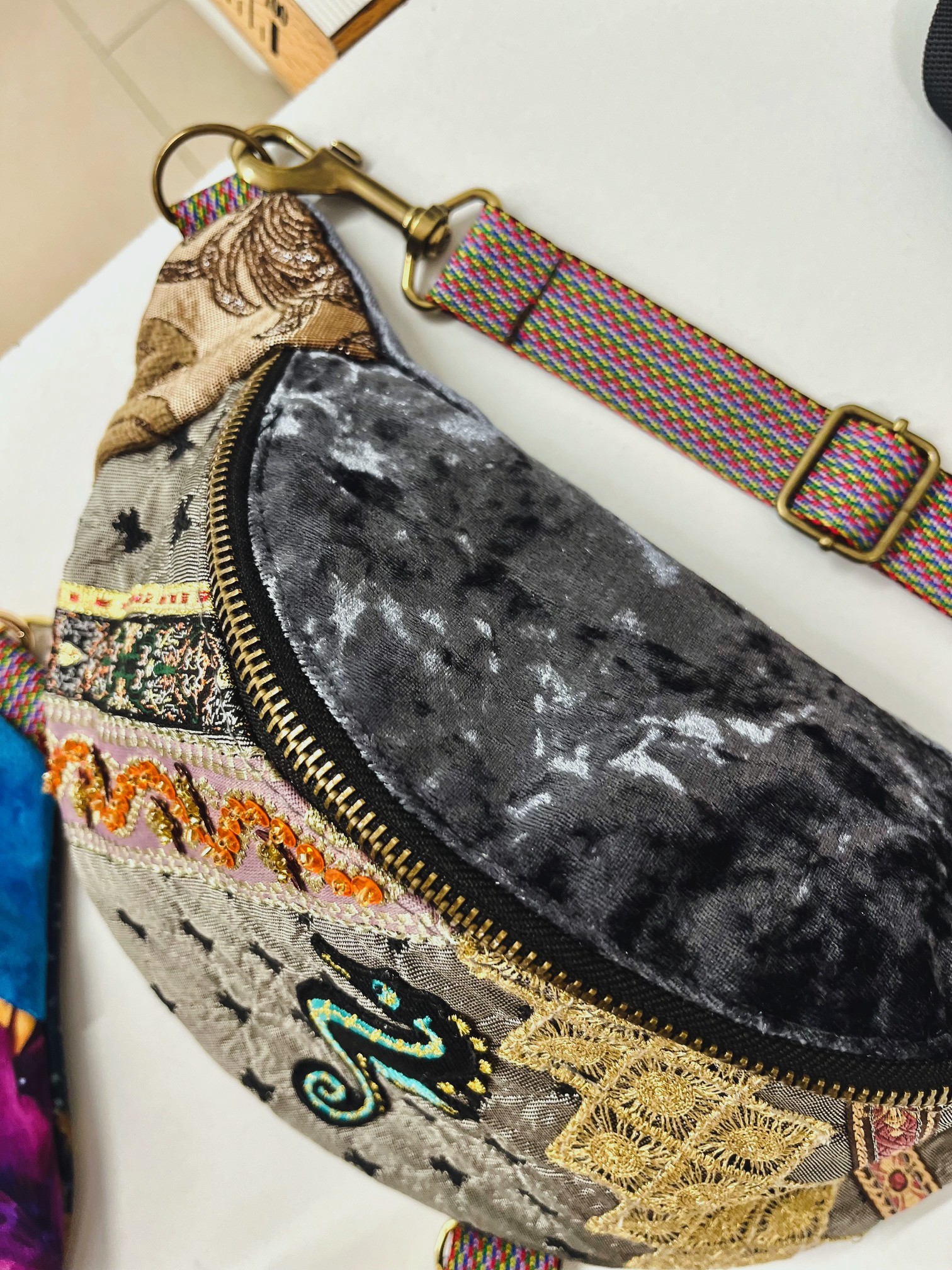 Na froncie zdobi ją ręcznie wyszywany motyw morskiego konika, otoczony bogatymi detalami z cekinów, złotych nici i koronek. Połączenie miękkiego aksamitu, wzorzystych tkanin i ozdobnych przeszyć sprawia, że każda nerka jest jedyna w swoim rodzaju – nie ma dwóch identycznych egzemplarzy.