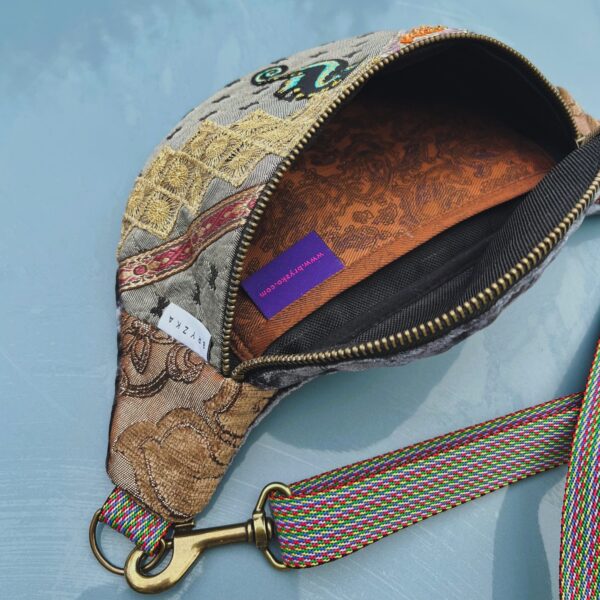 Ta unikalna nerka to prawdziwe dzieło sztuki użytkowej – uszyta z resztek tkanin, którym nadano nowe życie. Każdy fragment materiału został starannie dobrany, by stworzyć niepowtarzalną kompozycję kolorów, faktur i haftów.