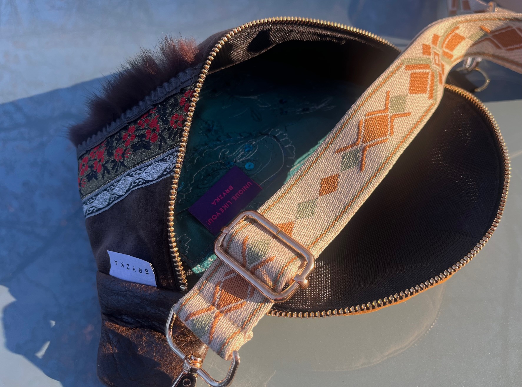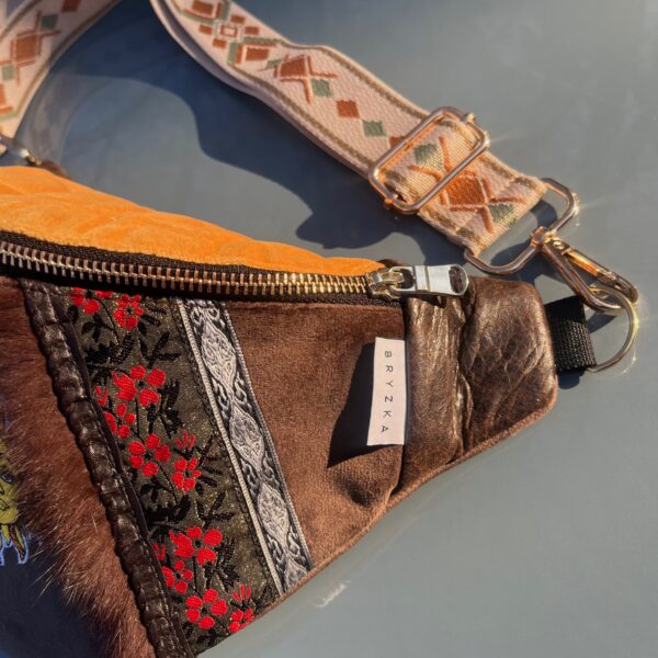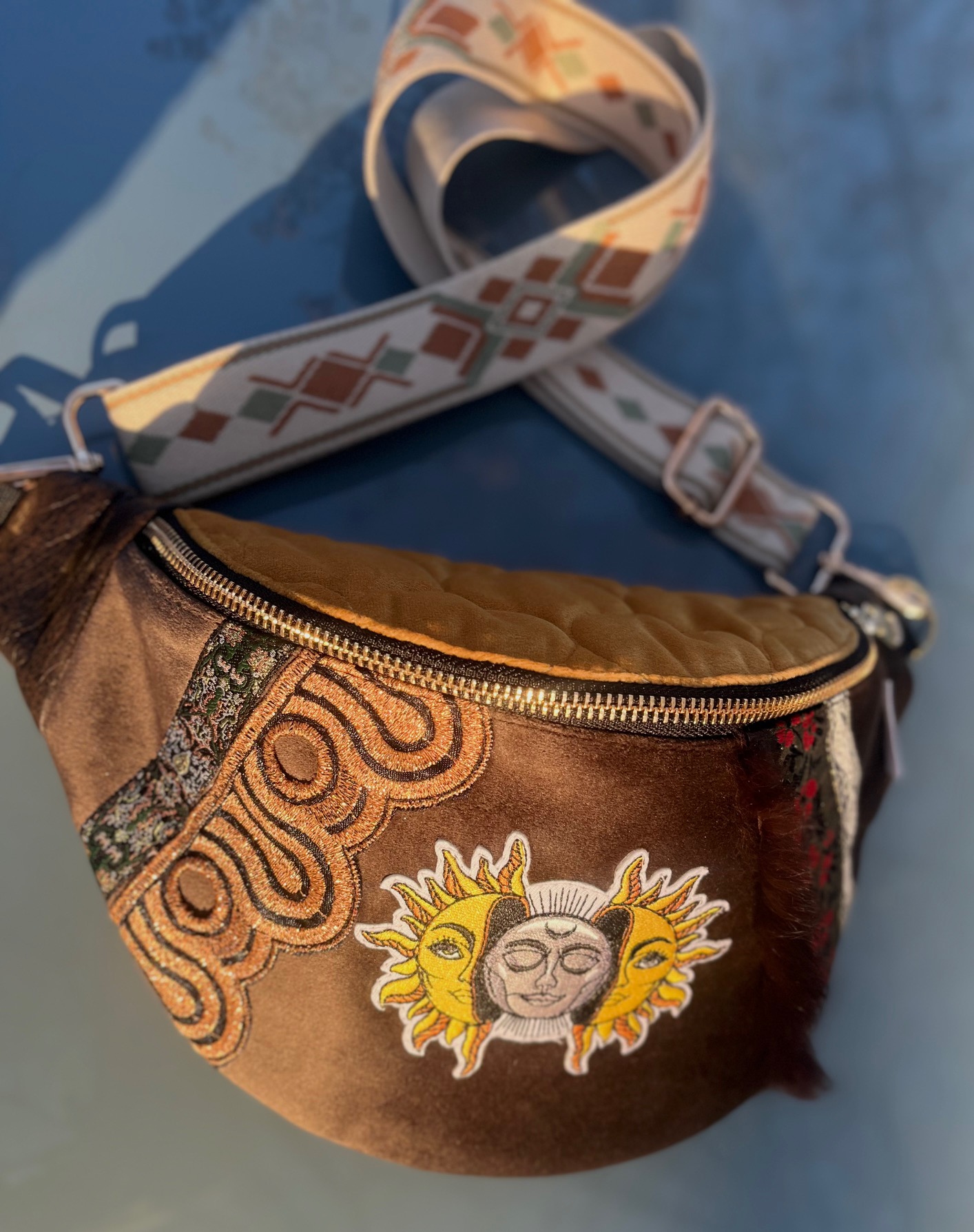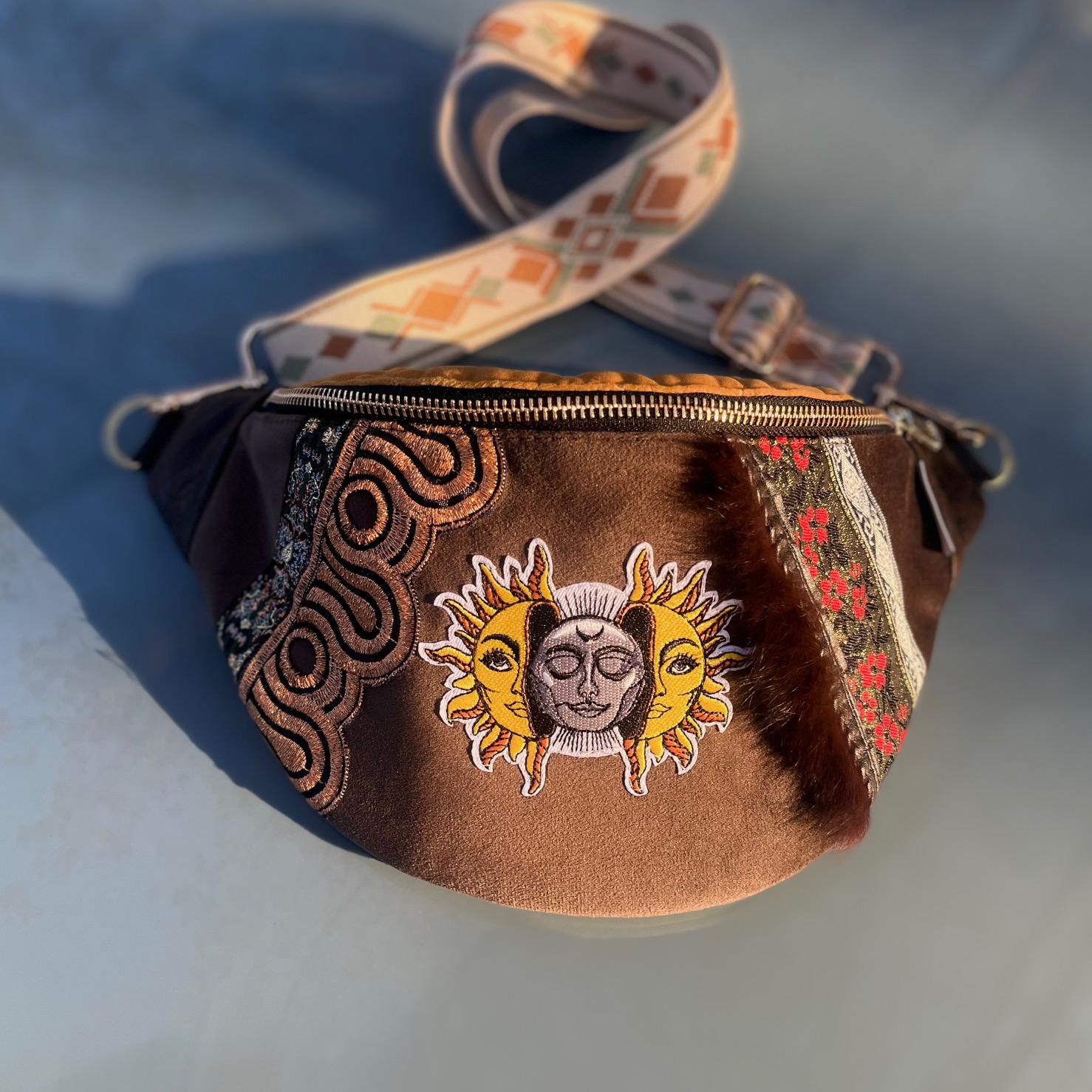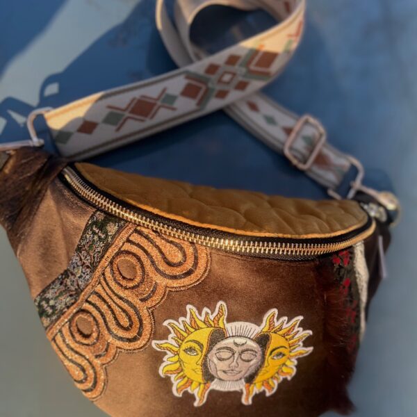Wykonana z miękkiego, karmelowo-brązowego materiału, łączy różnorodne faktury: delikatne futerko, ozdobne taśmy i hafty inspirowane etniczną estetyką. Jej centralnym punktem jest haftowany motyw potrójnego słońca – dwa złote oblicza i jedno srebrzyste w środku, w harmonii dnia i nocy.
