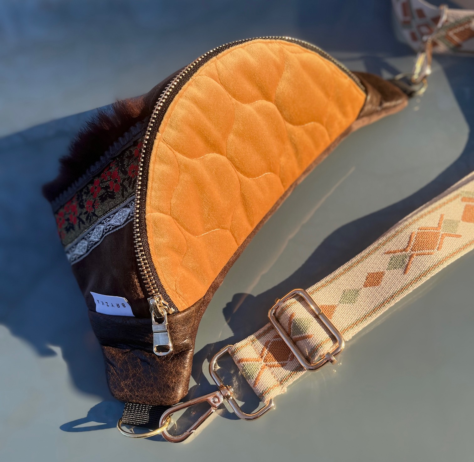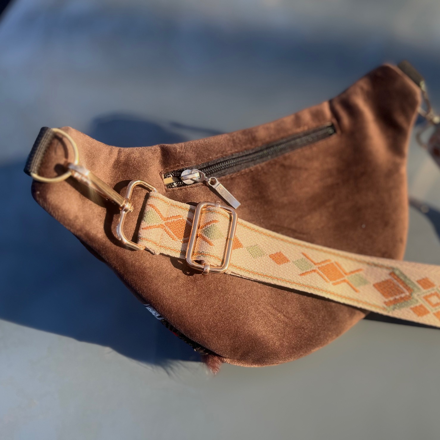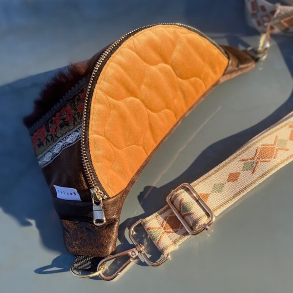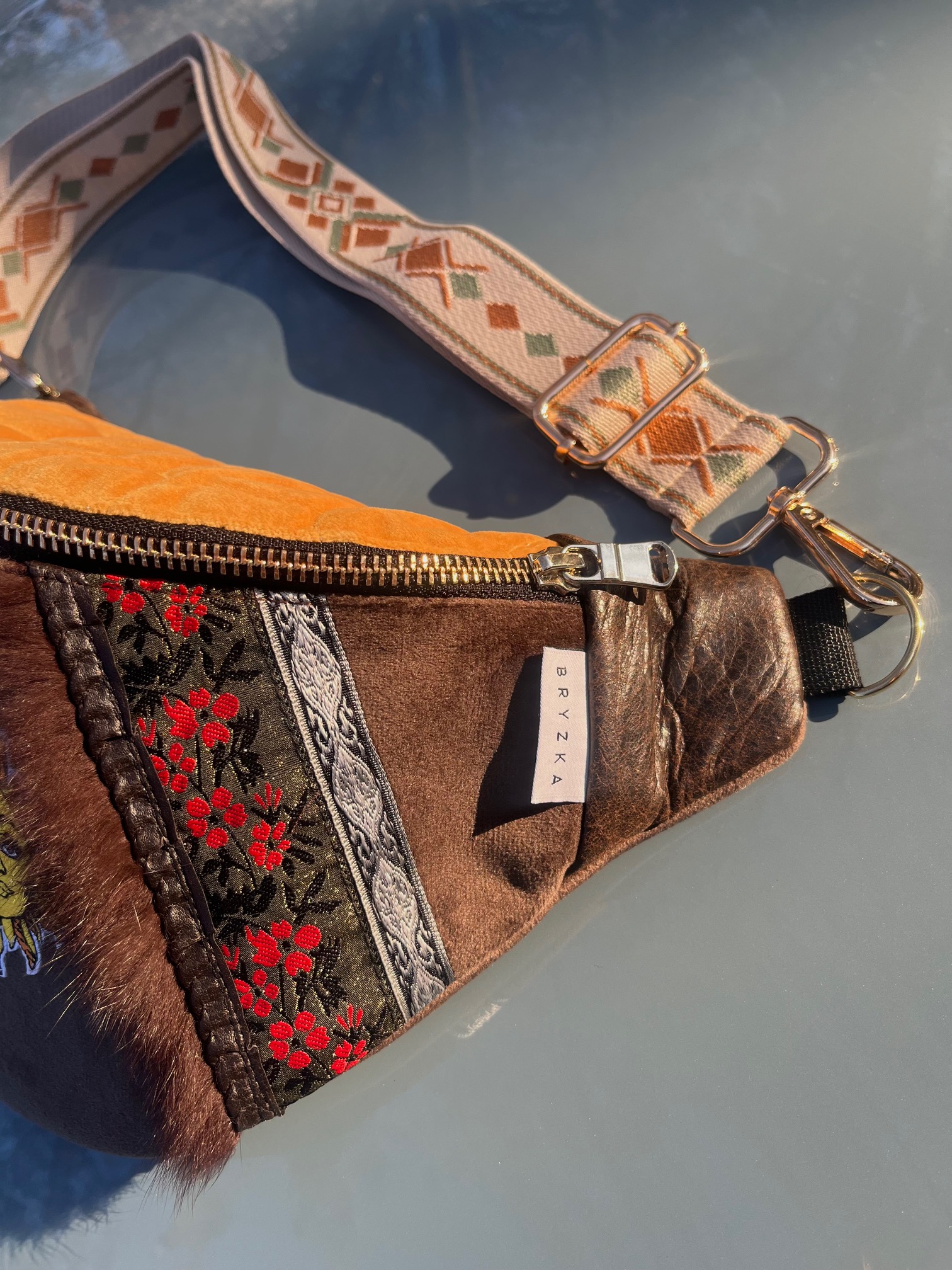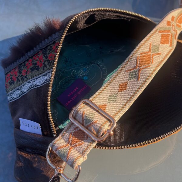 Wykonana z miękkiego, karmelowo-brązowego materiału, łączy różnorodne faktury: delikatne futerko, ozdobne taśmy i hafty inspirowane etniczną estetyką. Jej centralnym punktem jest haftowany motyw potrójnego słońca – dwa złote oblicza i jedno srebrzyste w środku, w harmonii dnia i nocy.