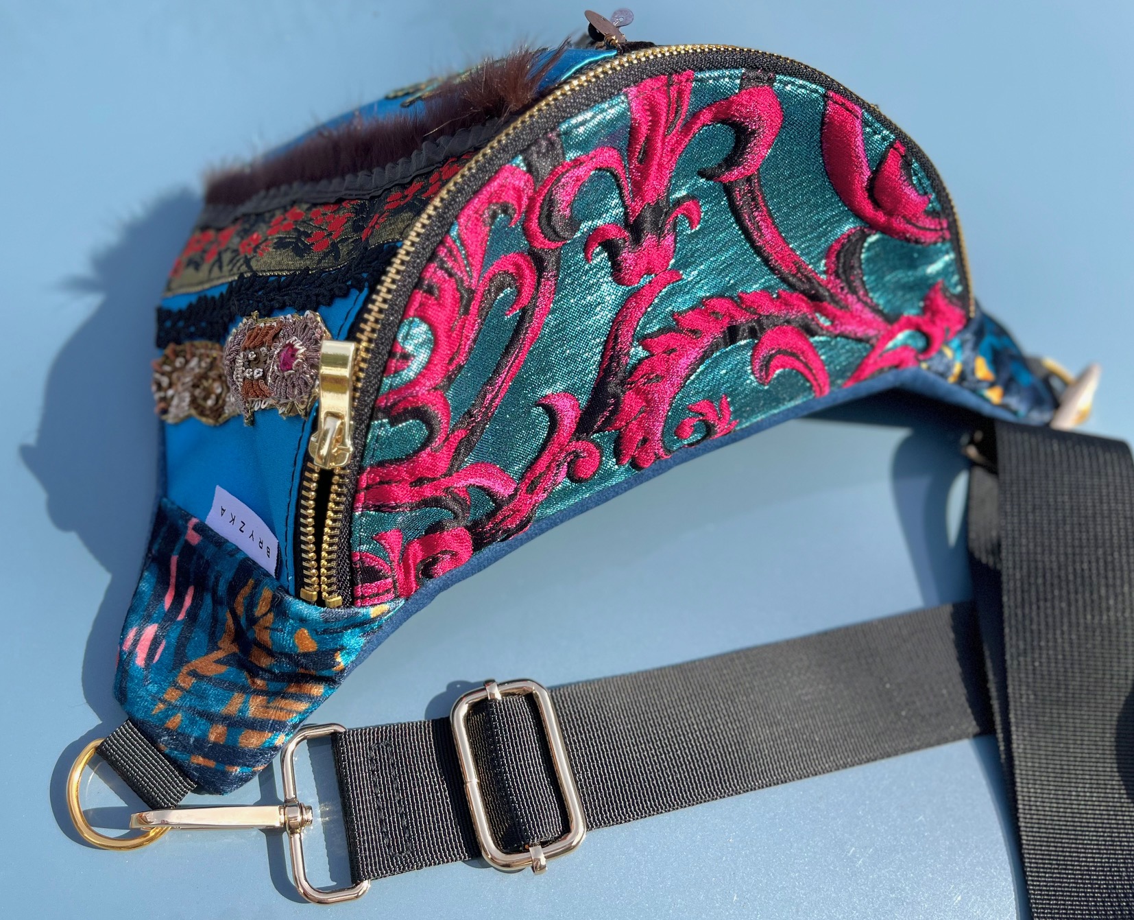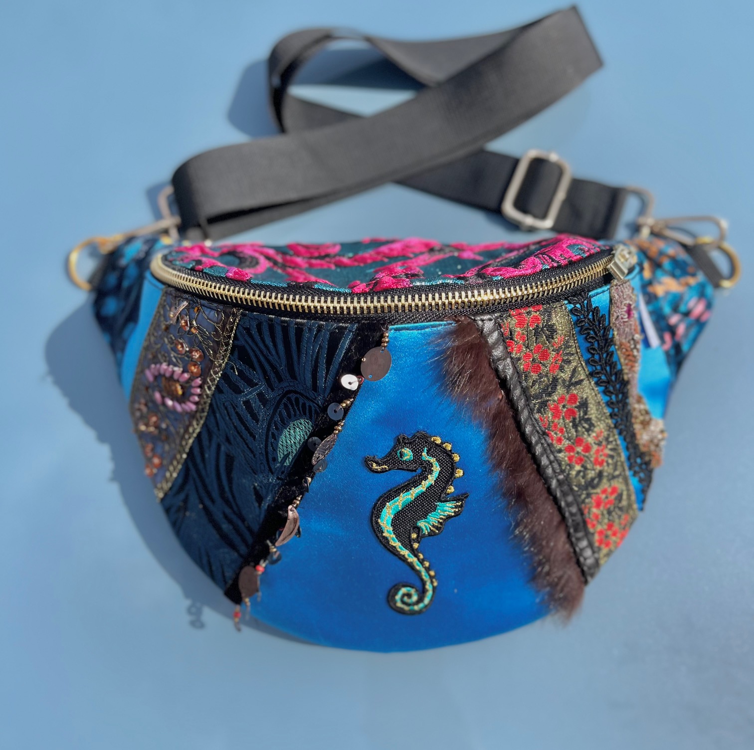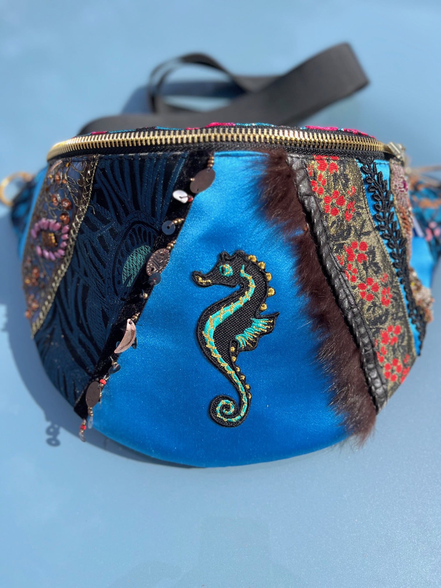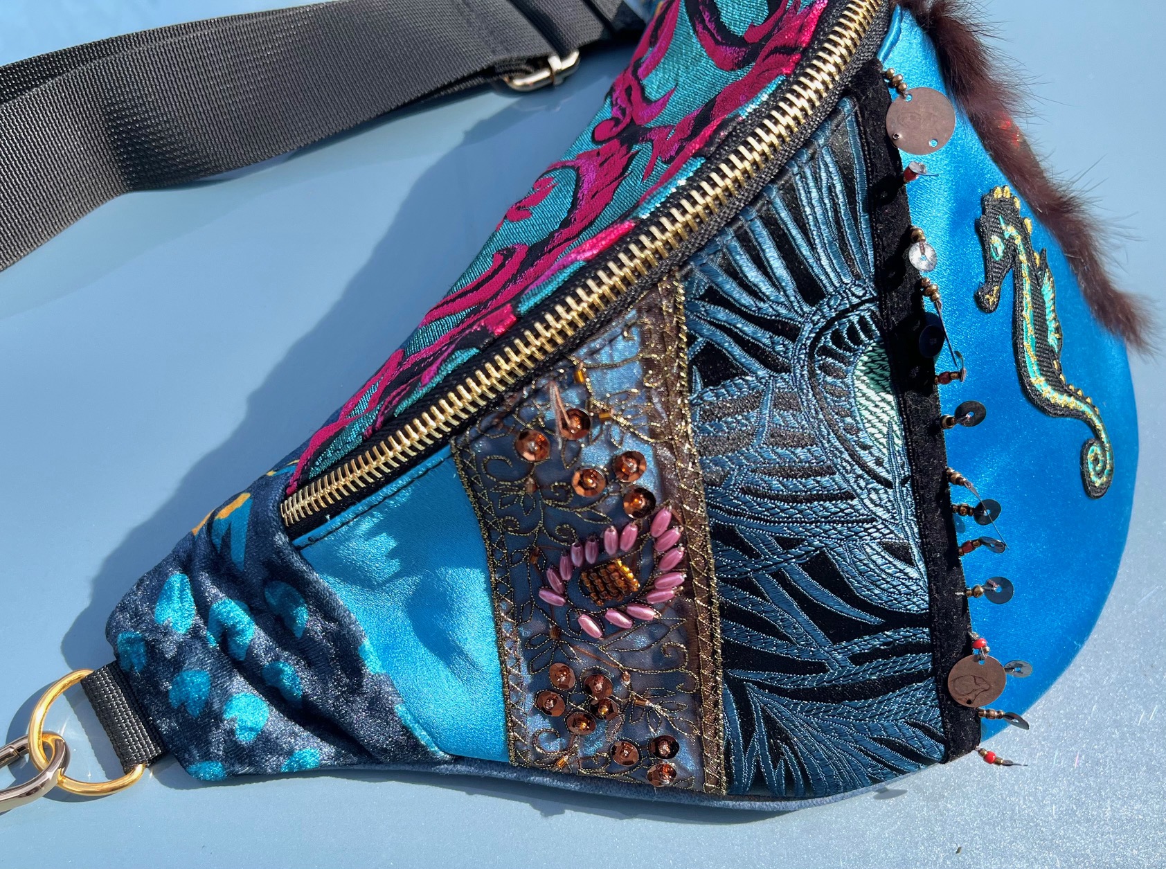 Nerka uszyta z tkanin obiciowych. Unikat. Symetryczne tasiemki na froncie naszyte na niebiskim, delikatnie połyskliwym materiale w „esty-floresy”. Na froncie symbol morskiego konika. Nerka jest wieczorowa, tajemnicza. Ma w sobie ezoteryczną głębię.