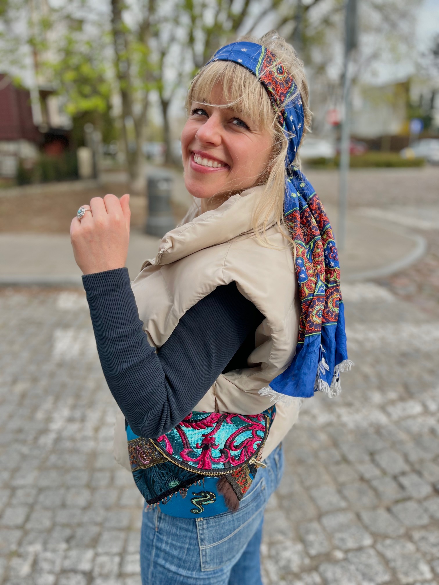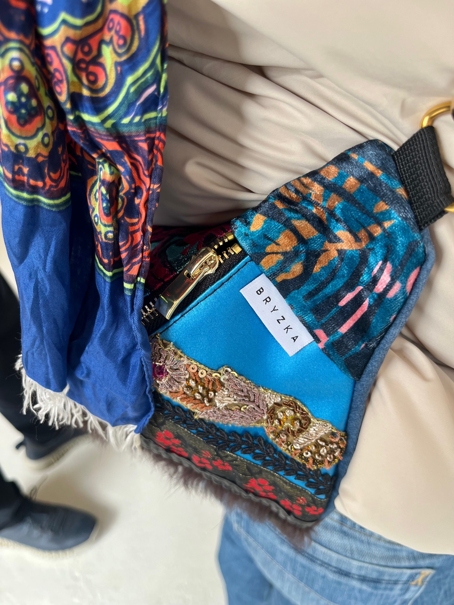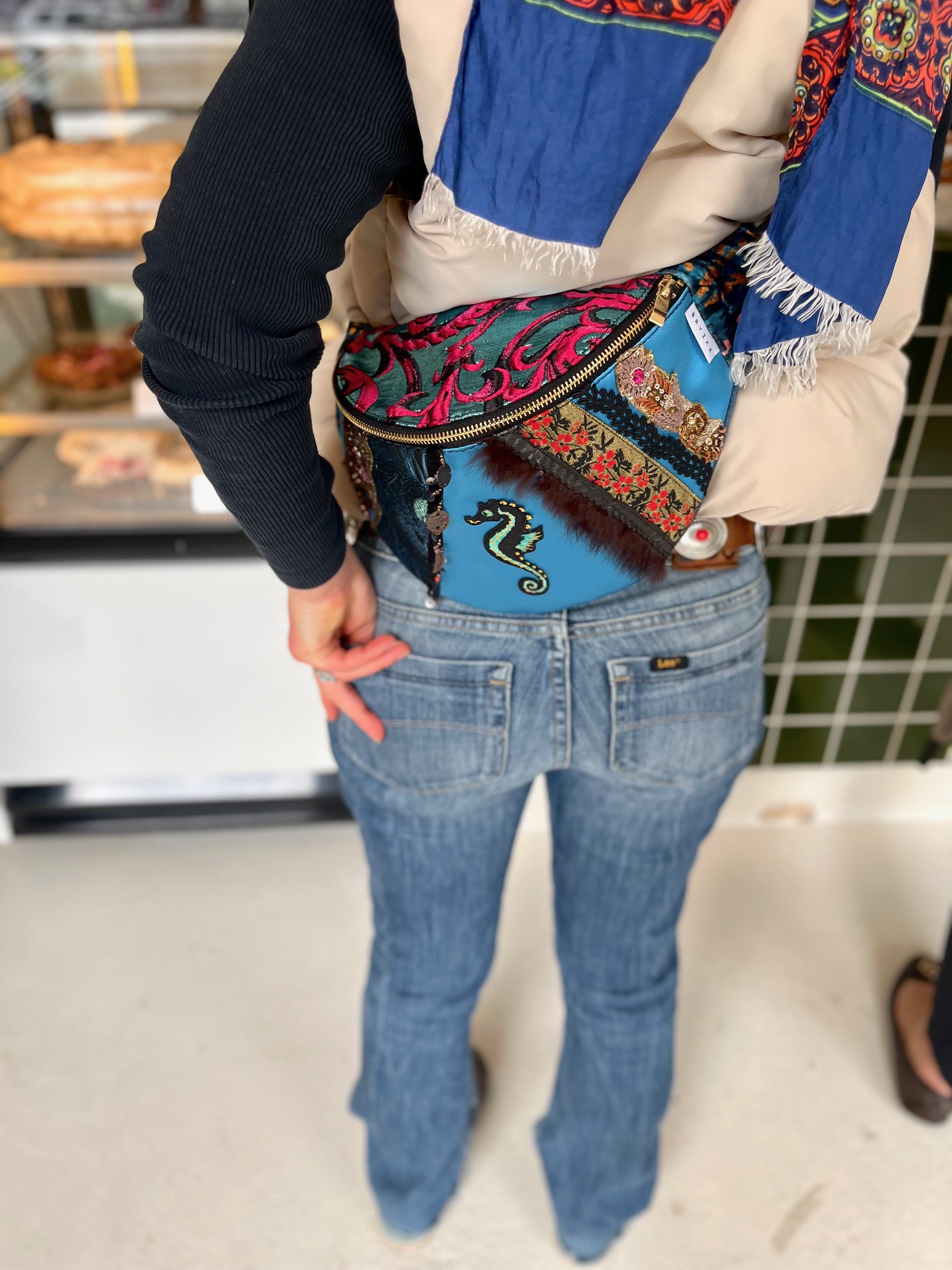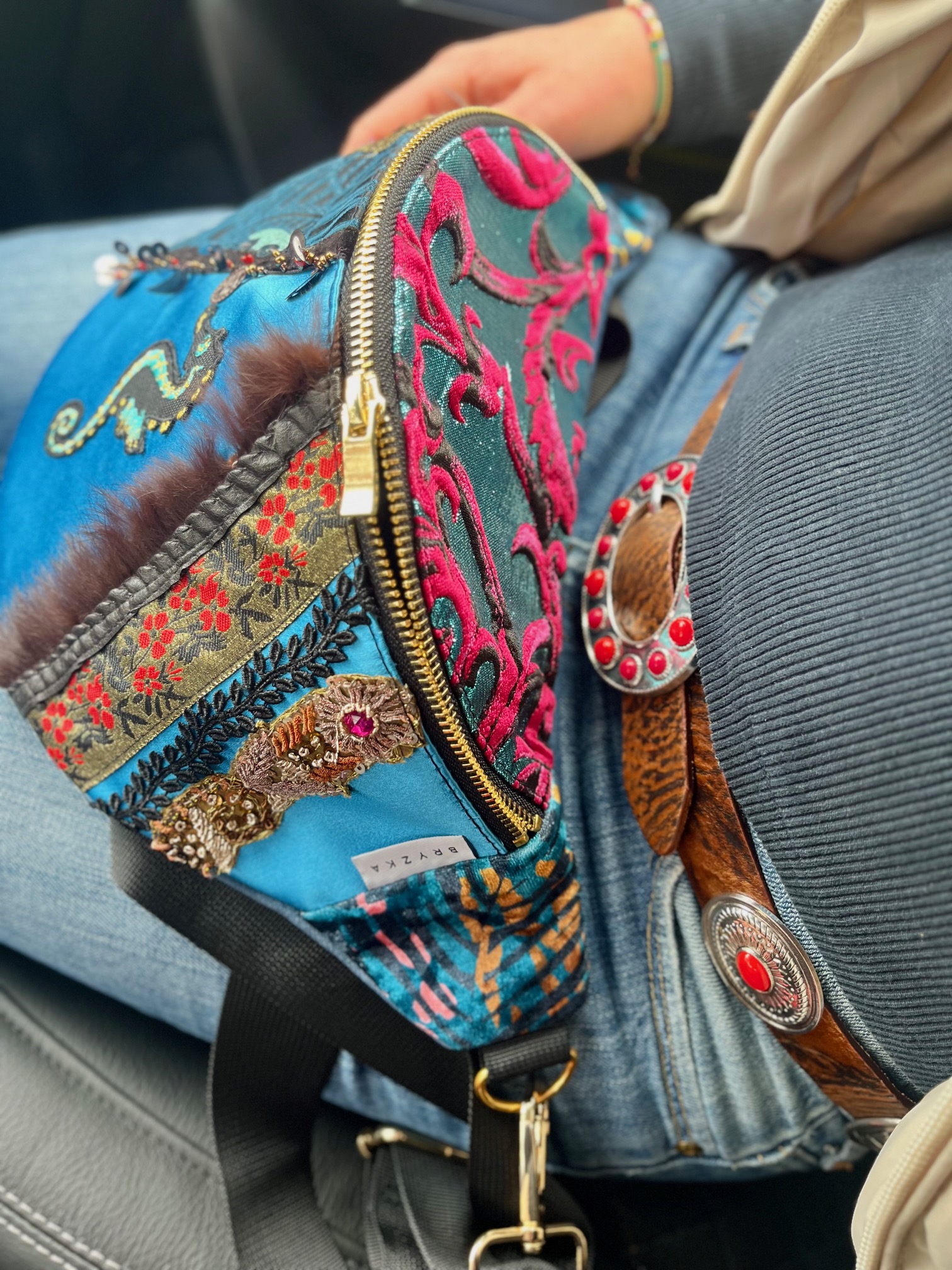 Nerka uszyta z tkanin obiciowych. Unikat. Symetryczne tasiemki na froncie naszyte na niebiskim, delikatnie połyskliwym materiale w „esty-floresy”. Na froncie symbol morskiego konika. Nerka jest wieczorowa, tajemnicza. Ma w sobie ezoteryczną głębię.