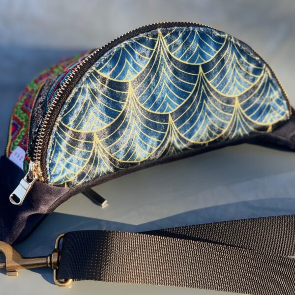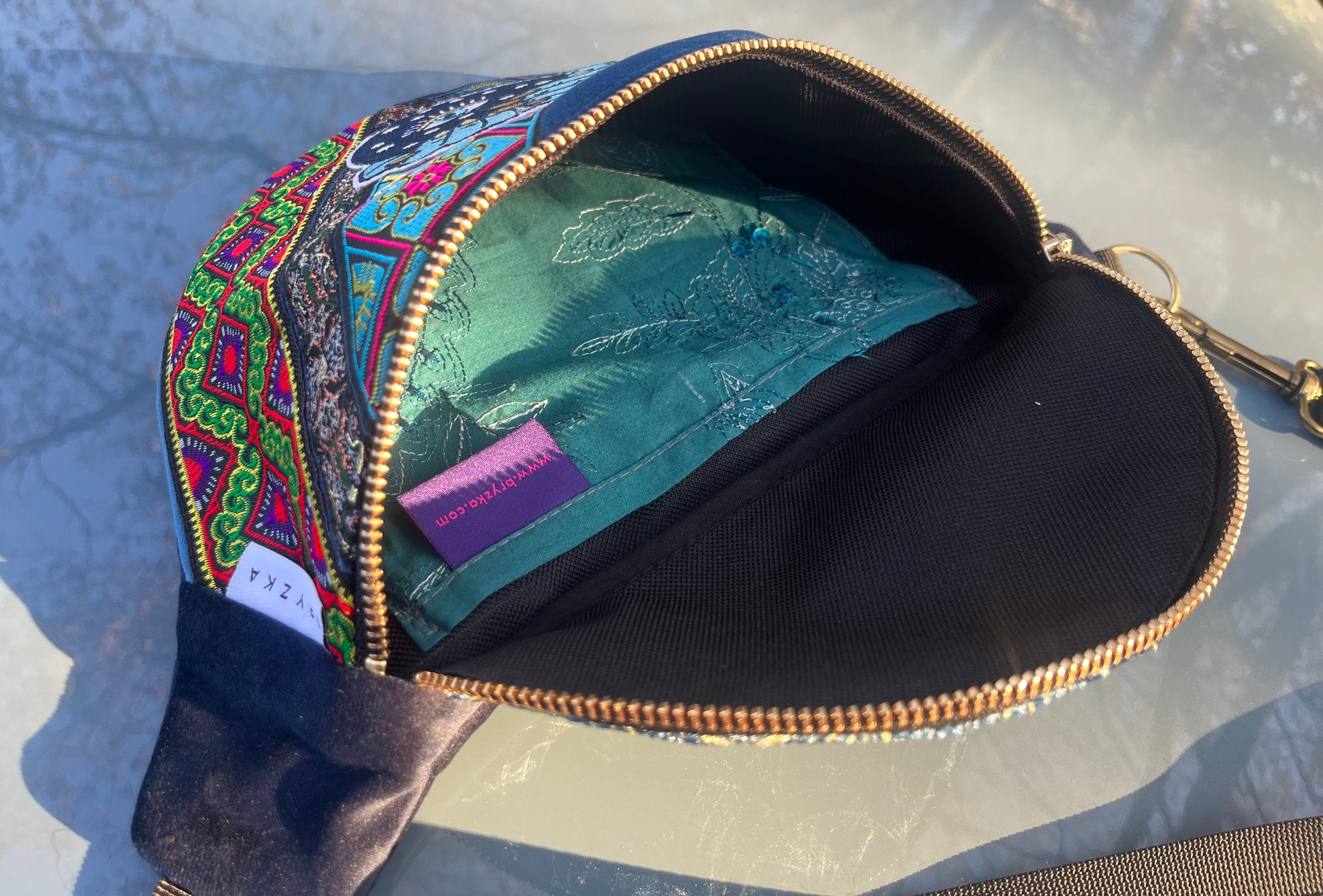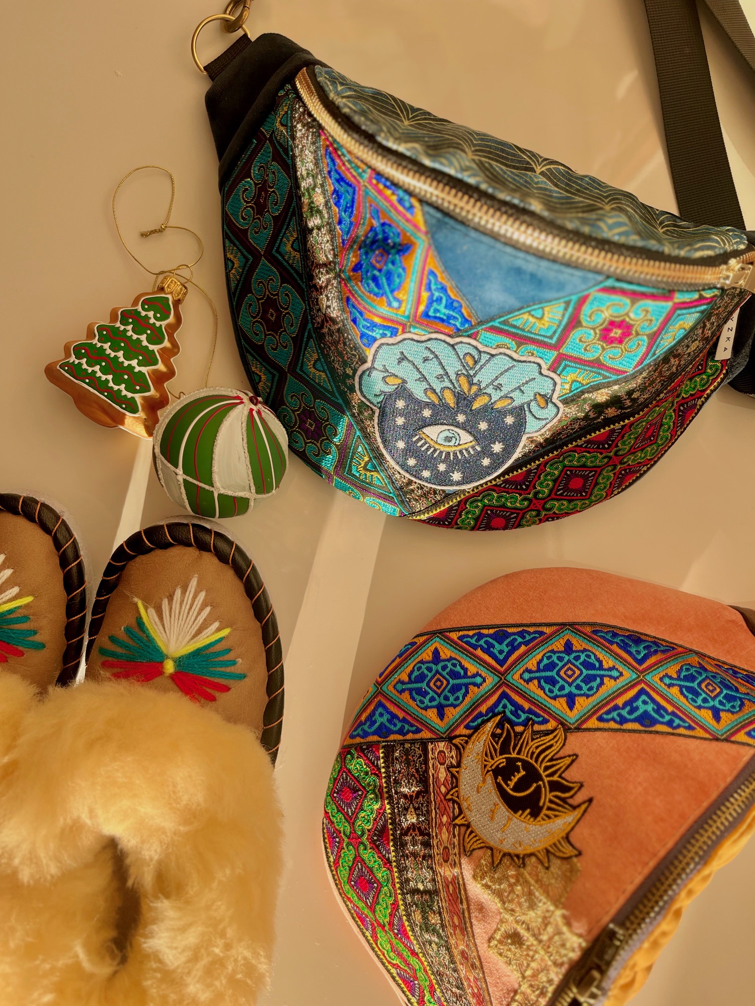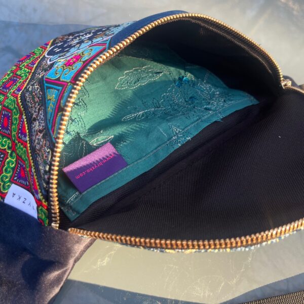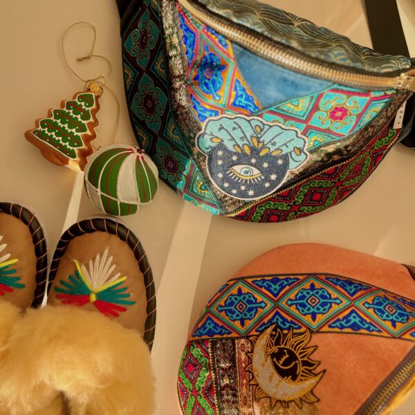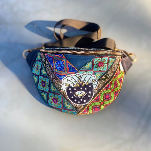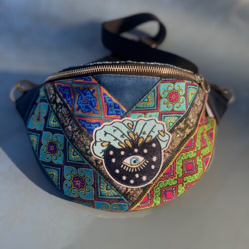 To wyjątkowy dodatek, który łączy funkcjonalność z artystycznym charakterem. Wykonana z dbałością o każdy fragment, zachwyca bogactwem kolorów i ręcznie haftowanymi wzorami inspirowanymi etniczną mozaiką. Geometryczne ornamenty w odcieniach turkusu, szmaragdu, fioletu i malinowego różu tworzą barwną kompozycję, która przyciąga wzrok i dodaje stylizacjom wyrazistości.