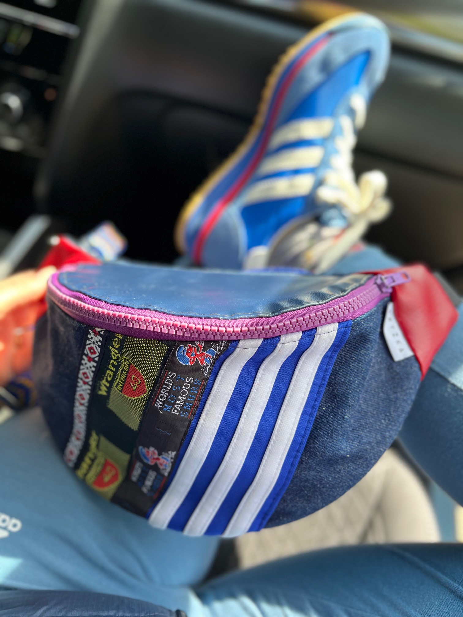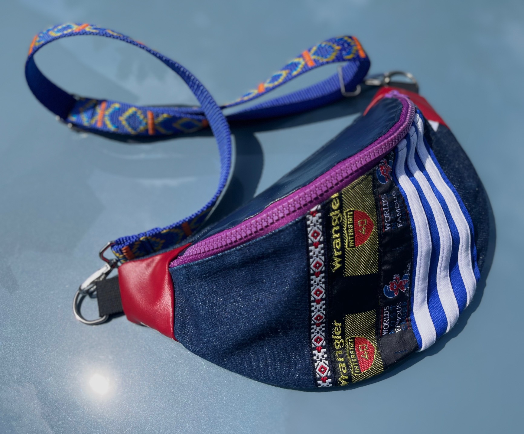 Nerka w rozmiarze M. Połączenie dresów adidasa, naszywek i jeansu okraszone skajem w kolorze granatu. Kontrastowy fioletowy zamek i wyrazisty pasek. Unisex.