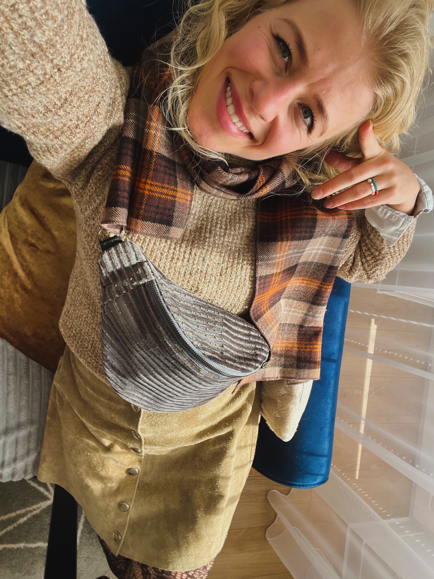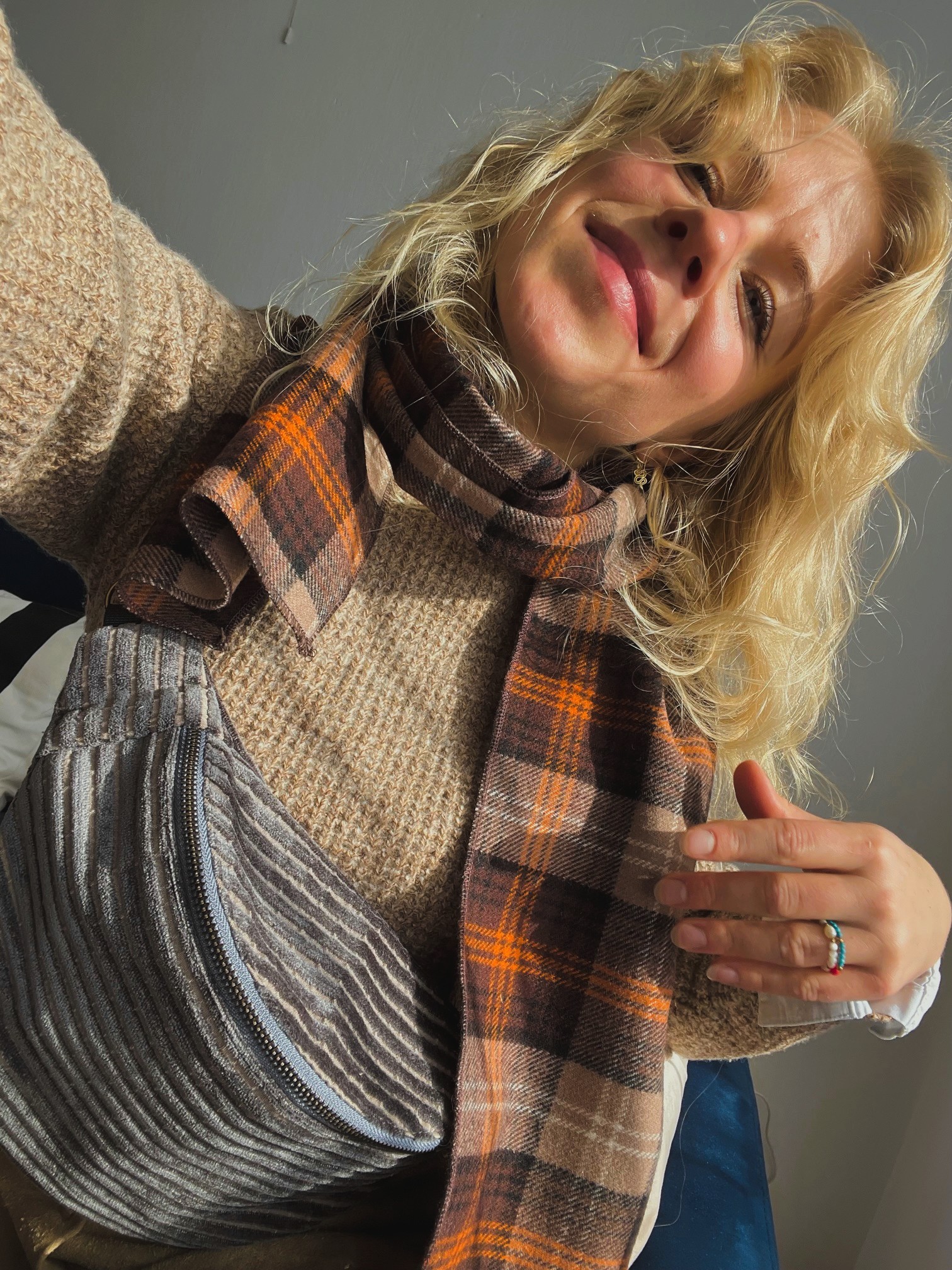 Uszyty z tkaniny z odzysku nowej! Zakończony overlockiem.