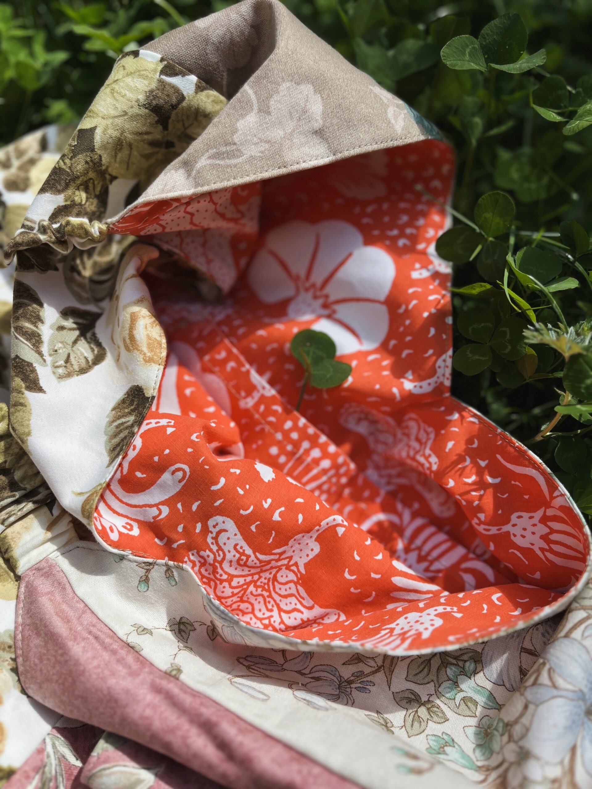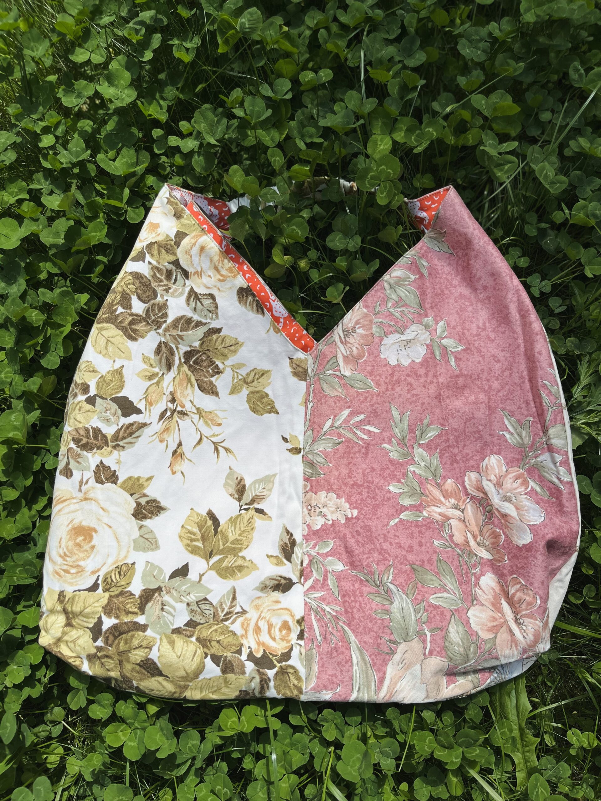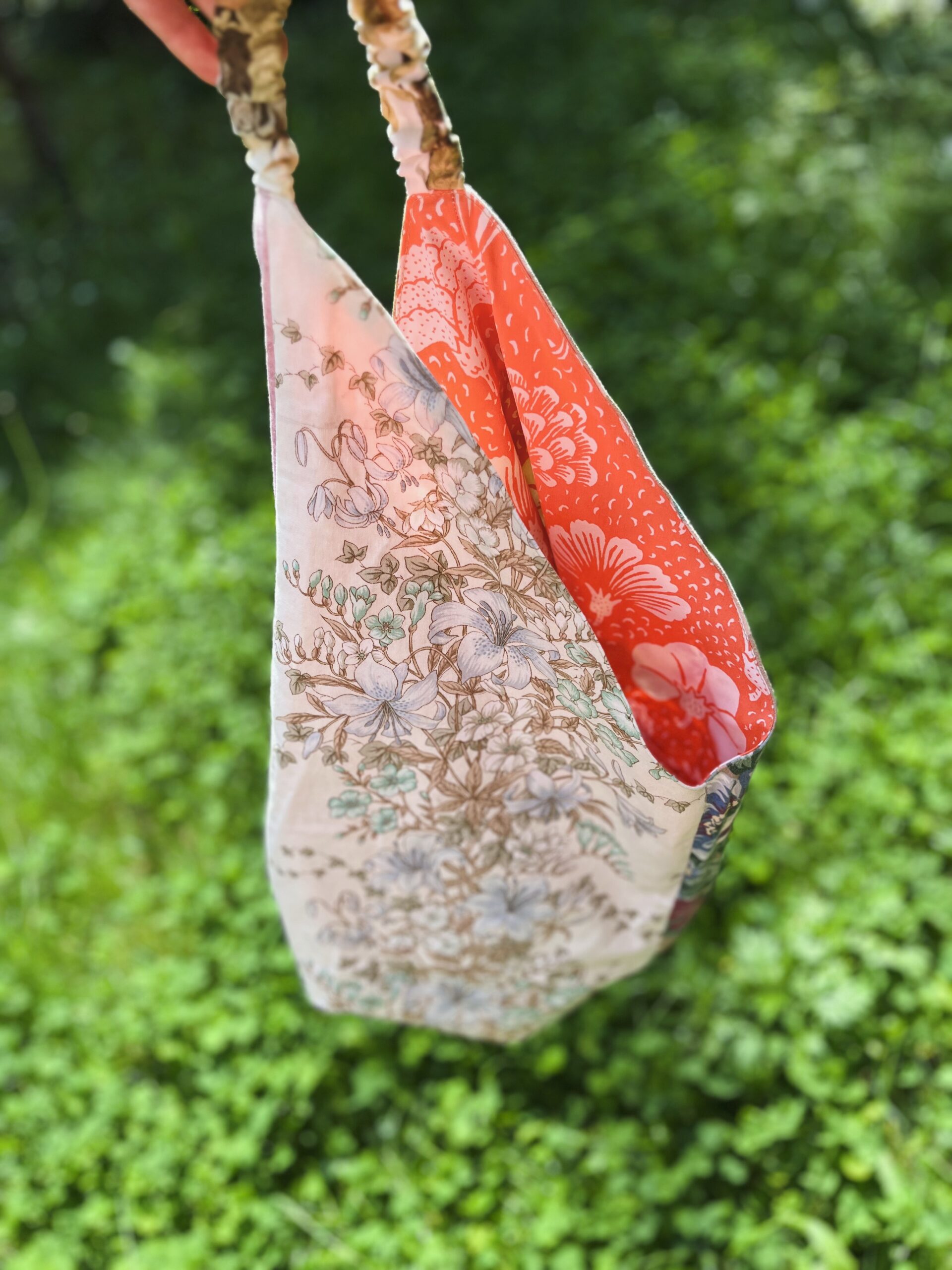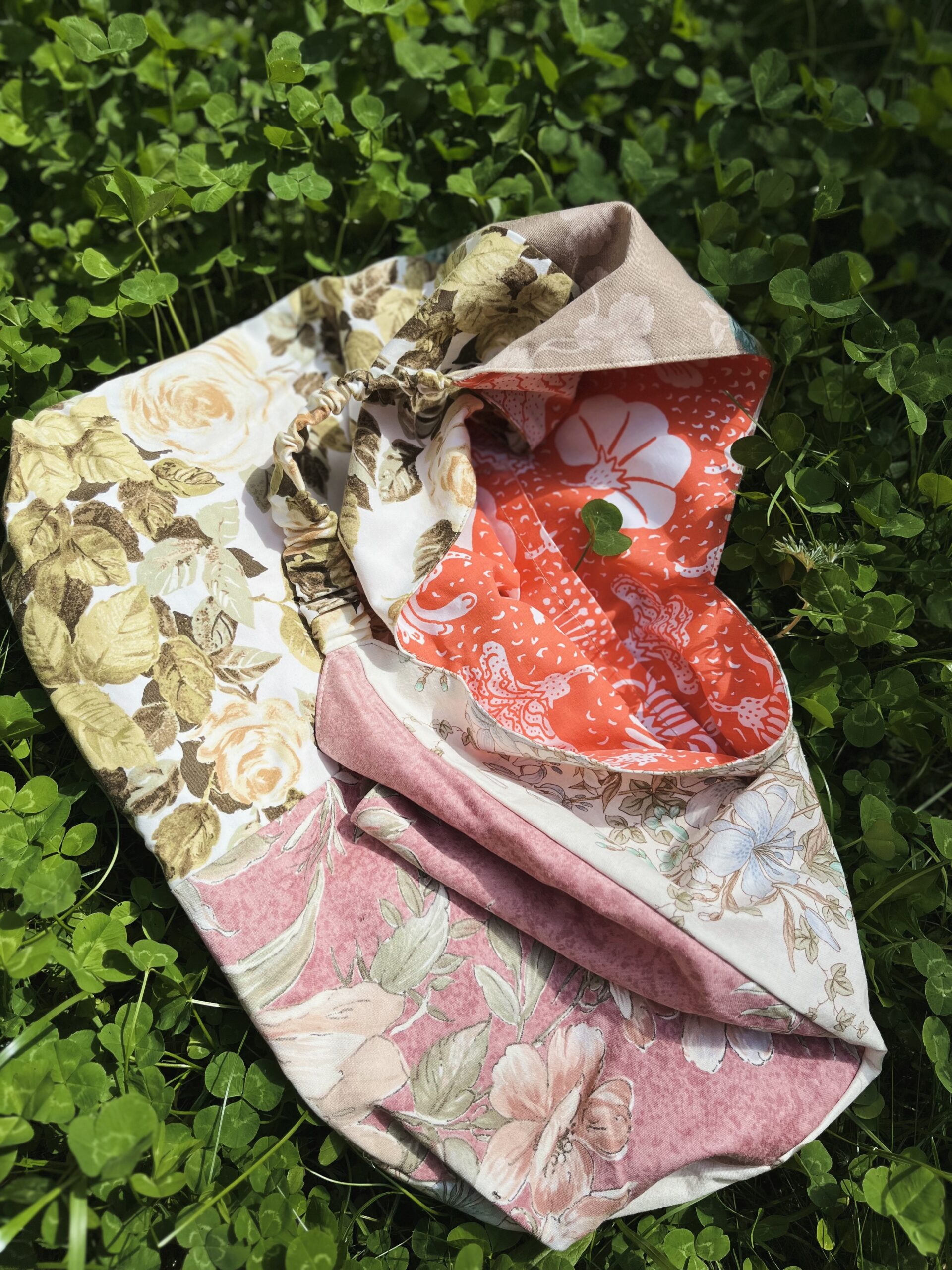 Torba z podszewką i luźną kieszonką. Może być dwustronna, szew jest zakryty. Torba z patchworkowych tkanin bawełnianych z motywem kwiatów.