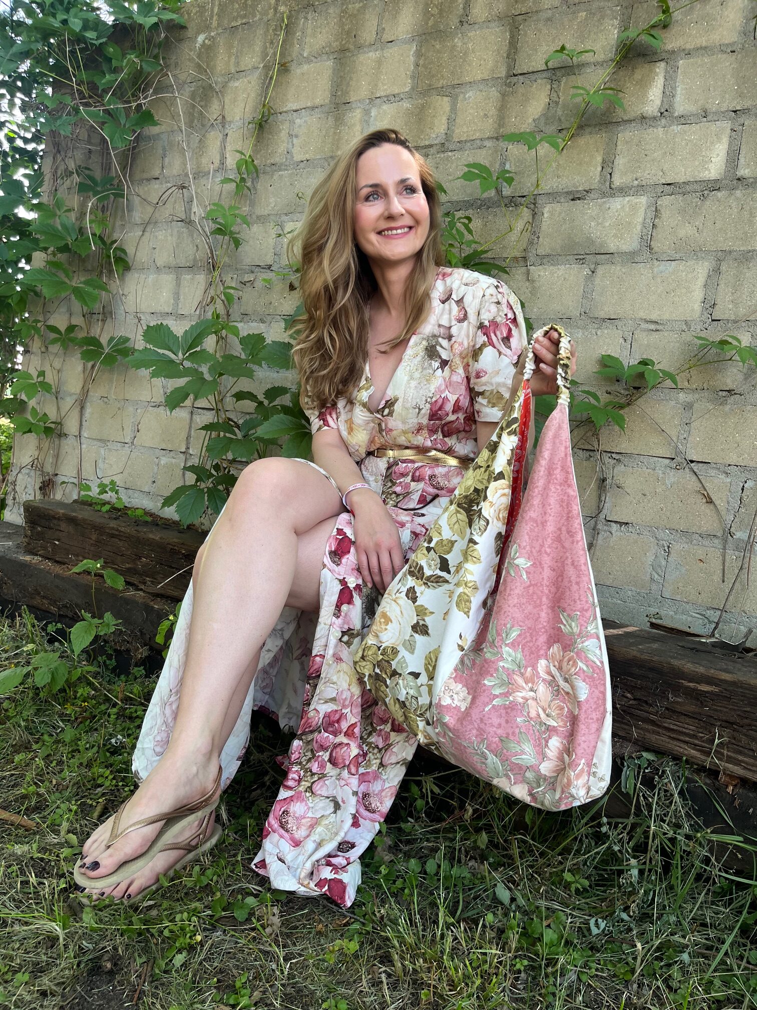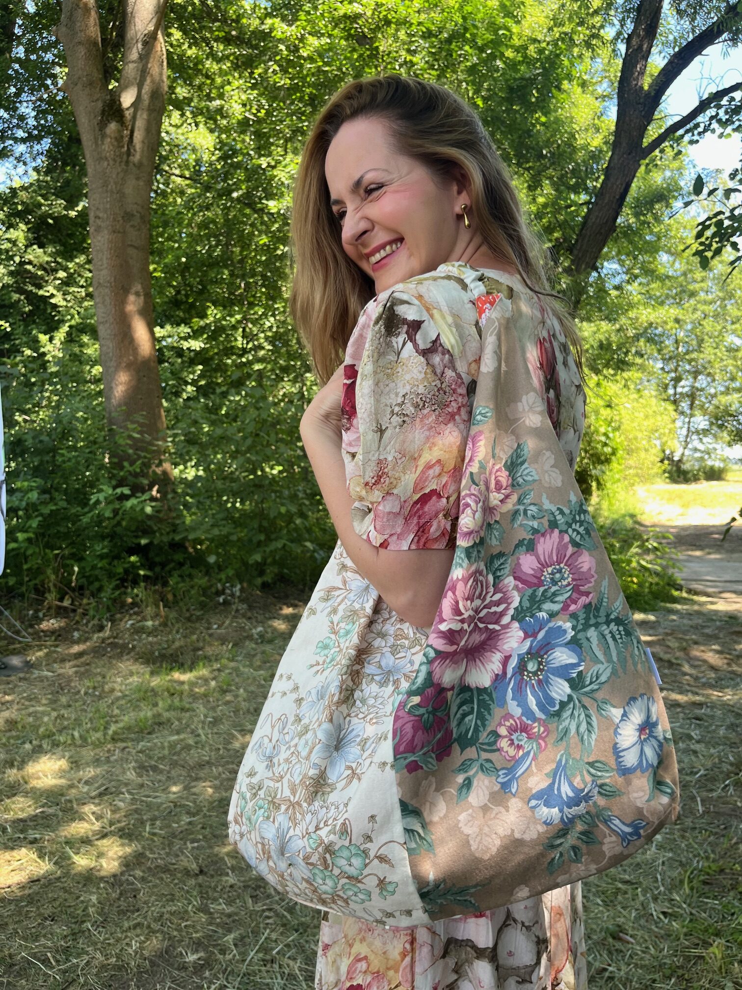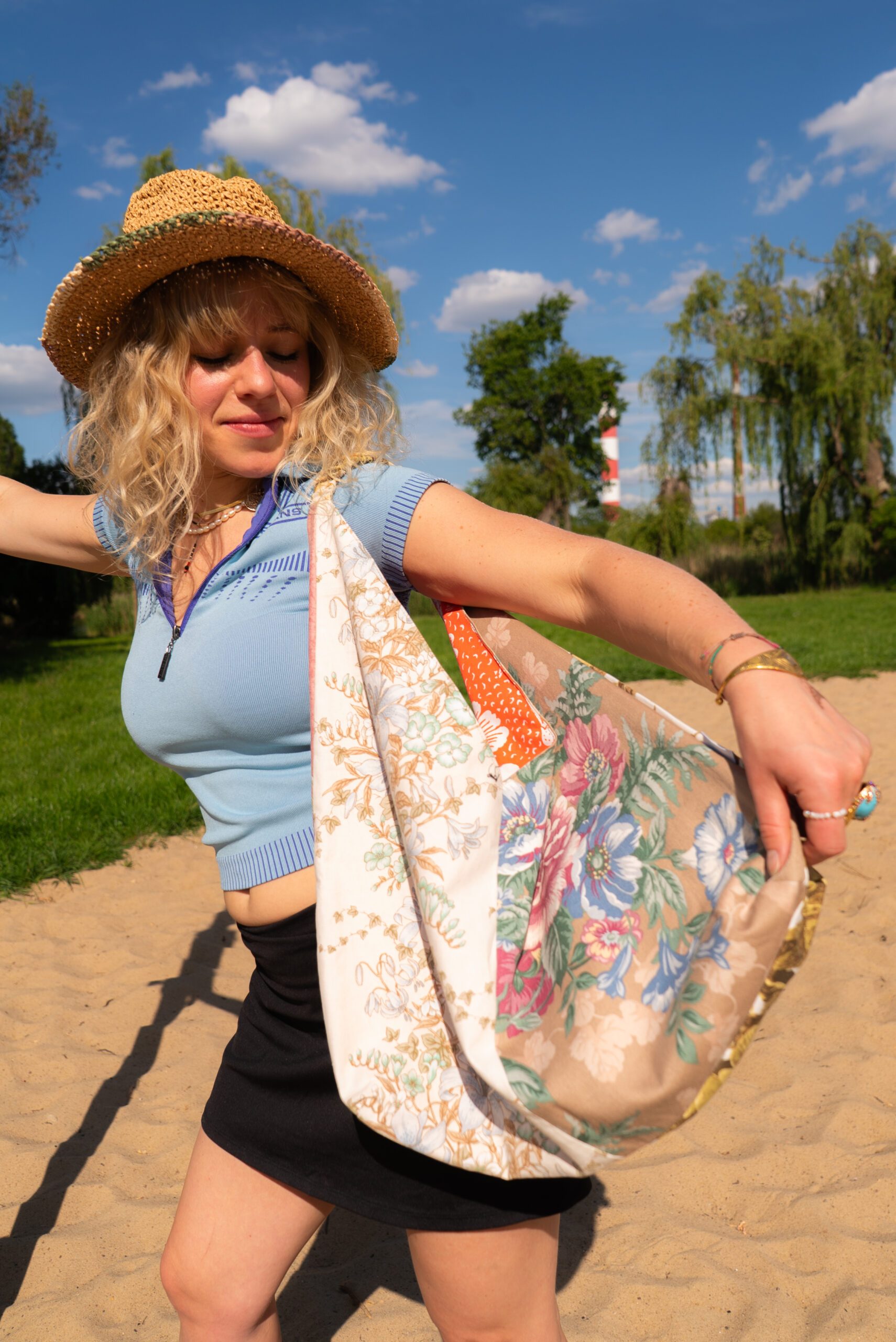 Torba z podszewką i luźną kieszonką. Może być dwustronna, szew jest zakryty. Torba z patchworkowych tkanin bawełnianych z motywem kwiatów.