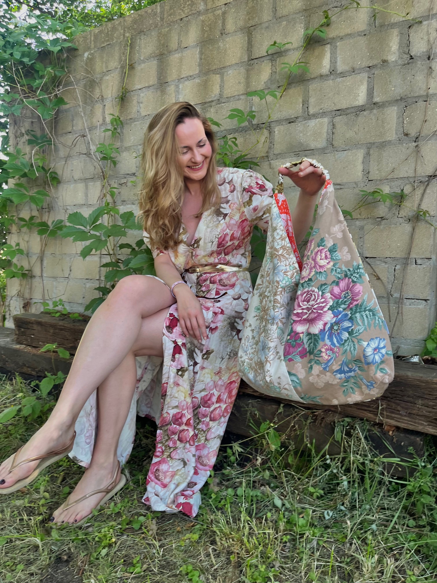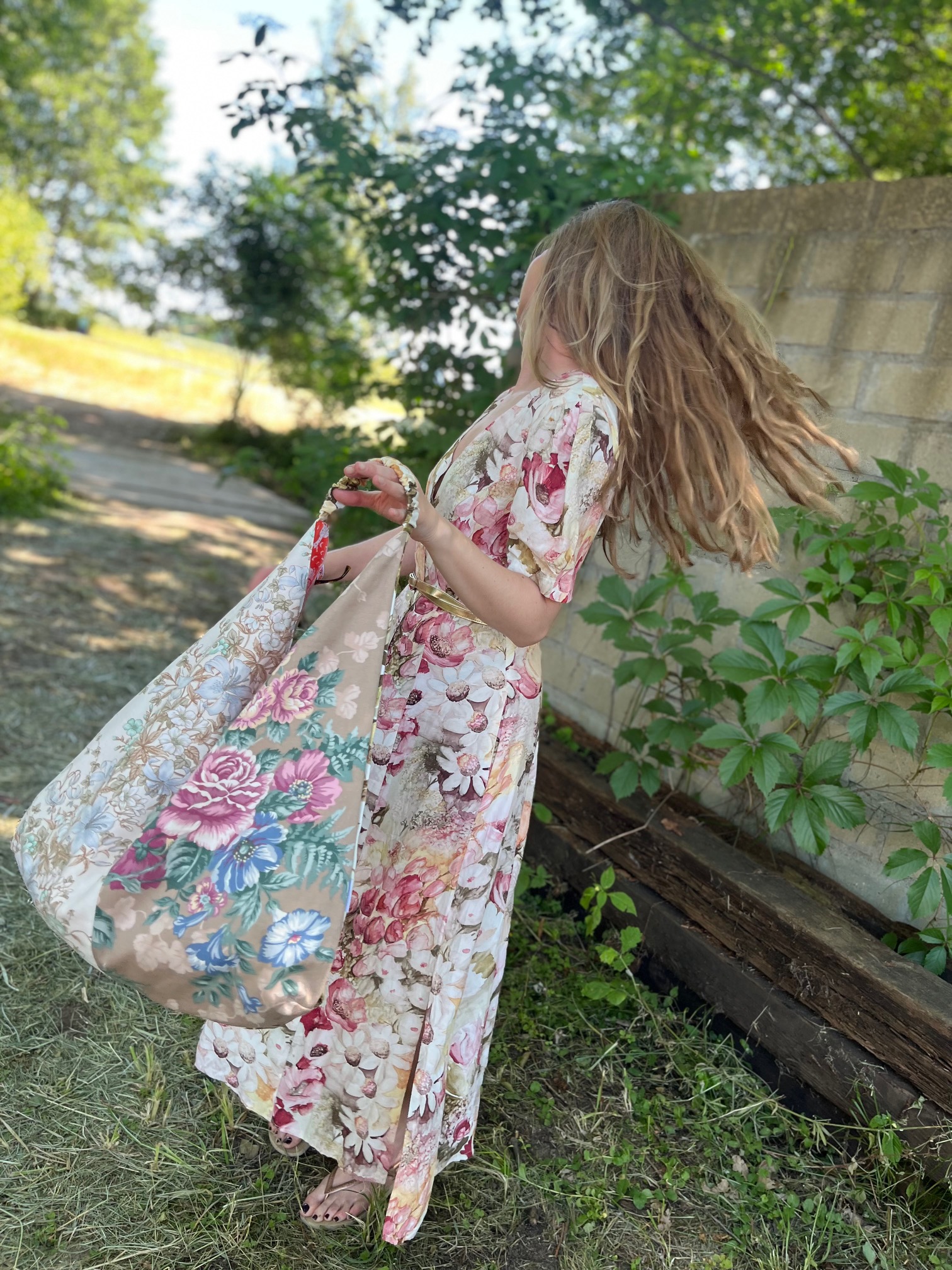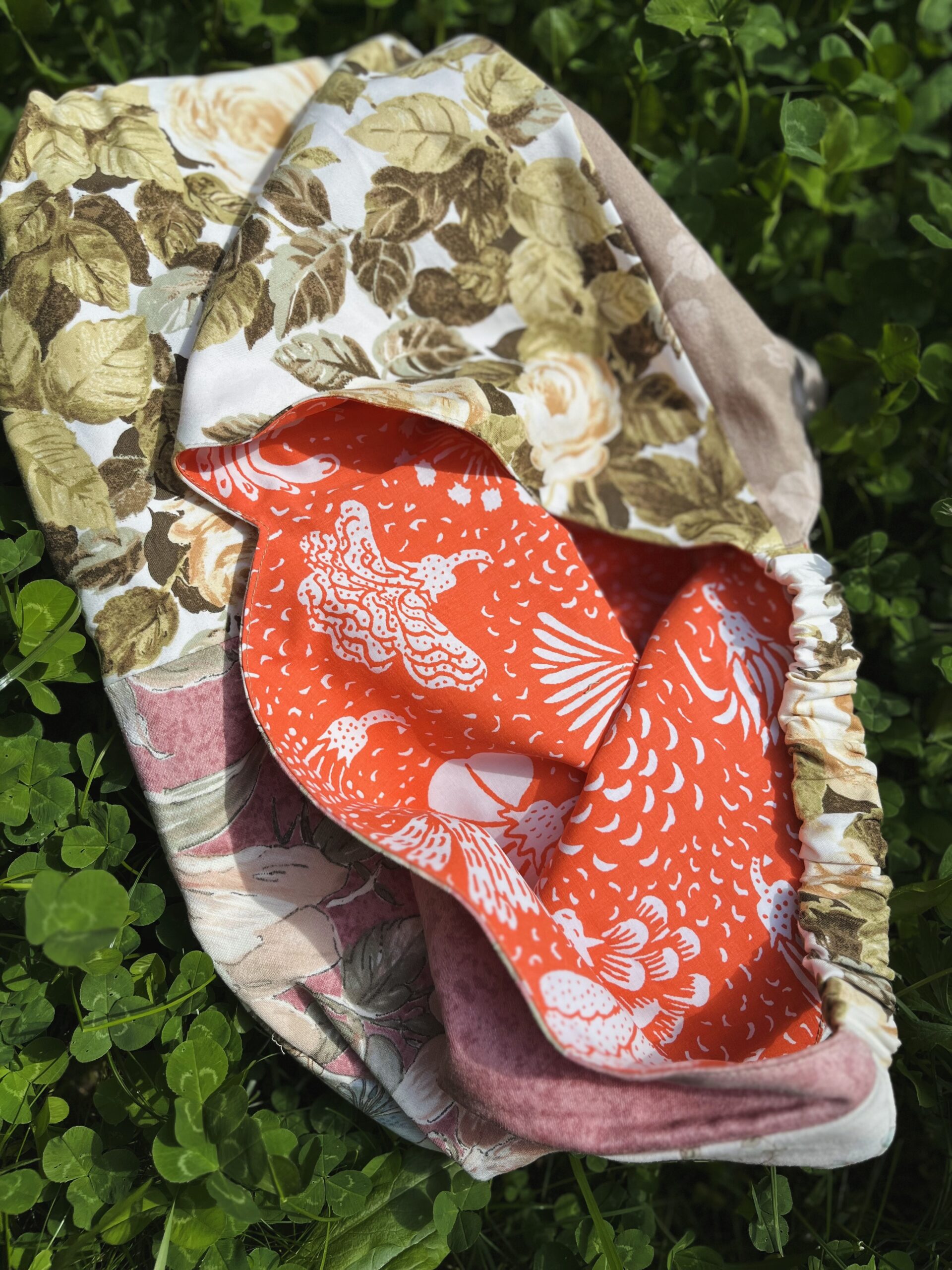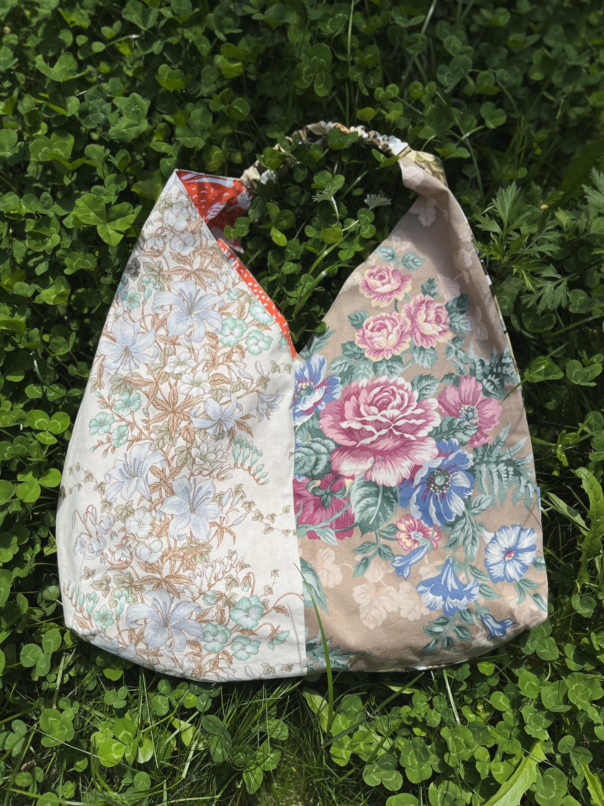 Torba z podszewką i luźną kieszonką. Może być dwustronna, szew jest zakryty. Torba z patchworkowych tkanin bawełnianych z motywem kwiatów.